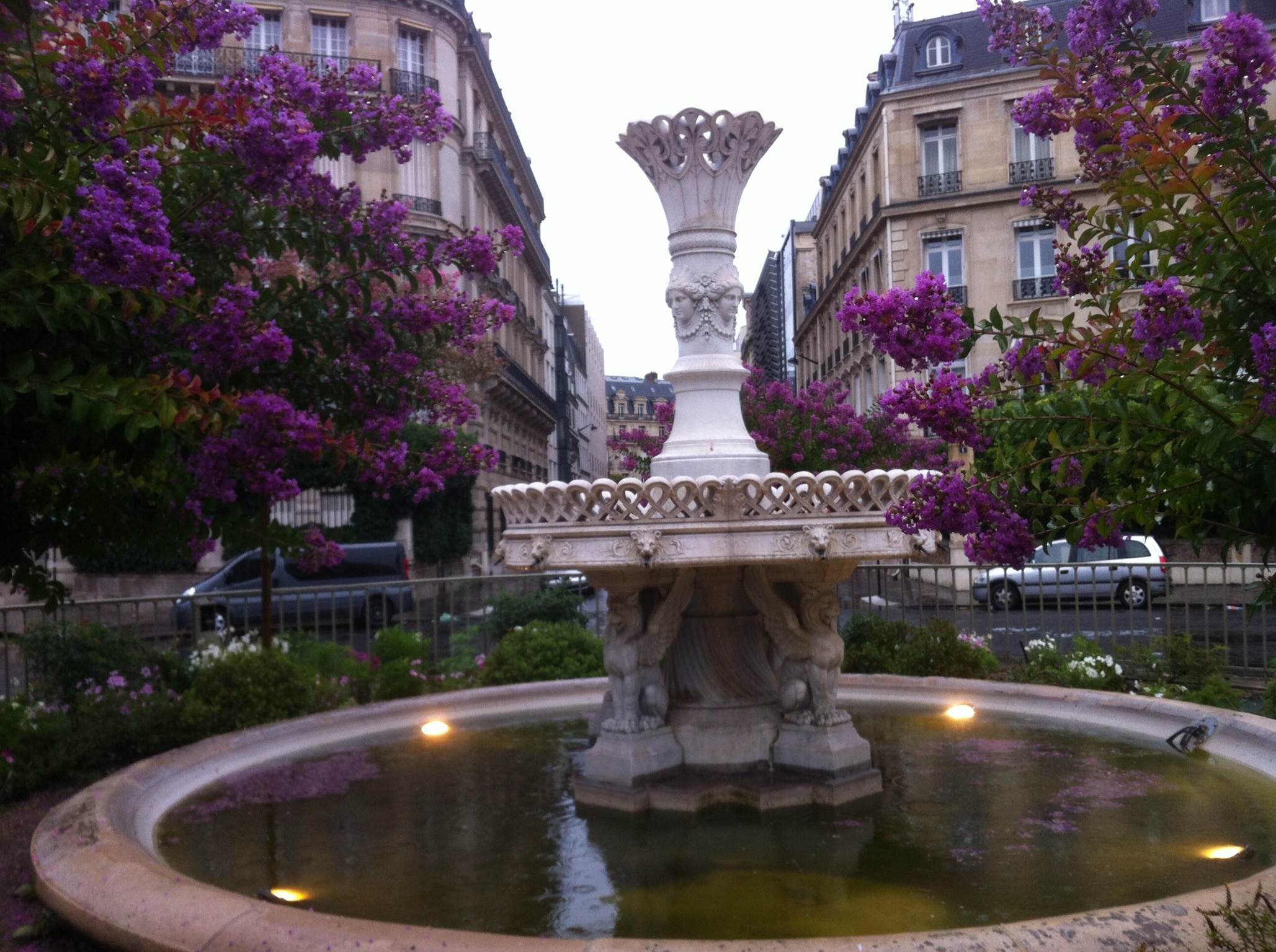 We head towards the Louvre taking close to the shortest route this time, staying approximately one block back off the Seine so we don’t walk the same path twice. Beautiful sights are everywhere, grand museum entries, an elaborately decorated church with four people praying inside, a beautiful roundabout at the centre of which is a fountain surrounded by purple flowers.