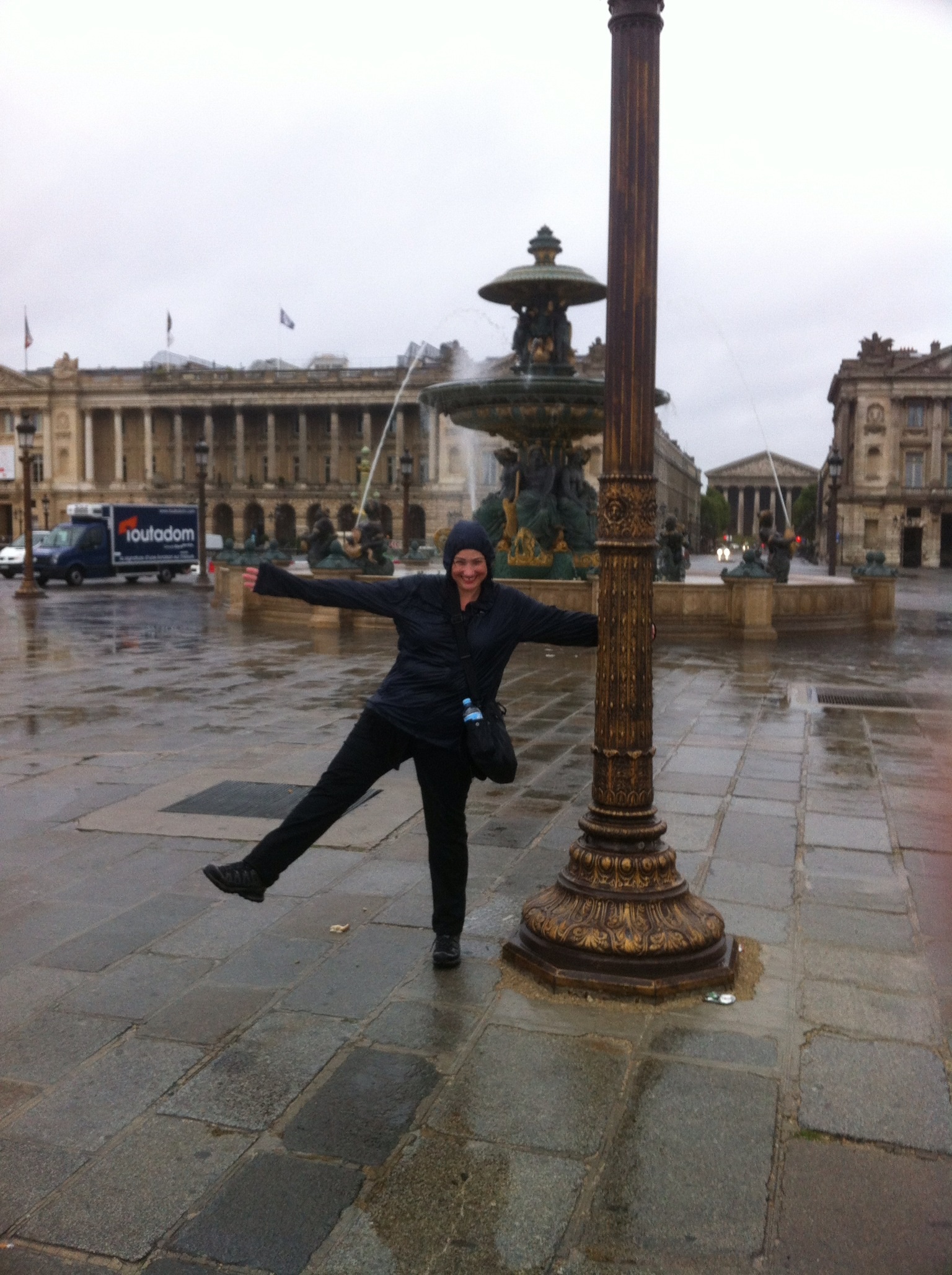 We make our way to the Place de la Concorde where we had not stopped the previous day. The Place de la Concorde is a large busy intersection with a monolith covered in hieroglyphs at its centre and a large fountain at each end. Pam does her best ‘Singing in the Rain’ impression.