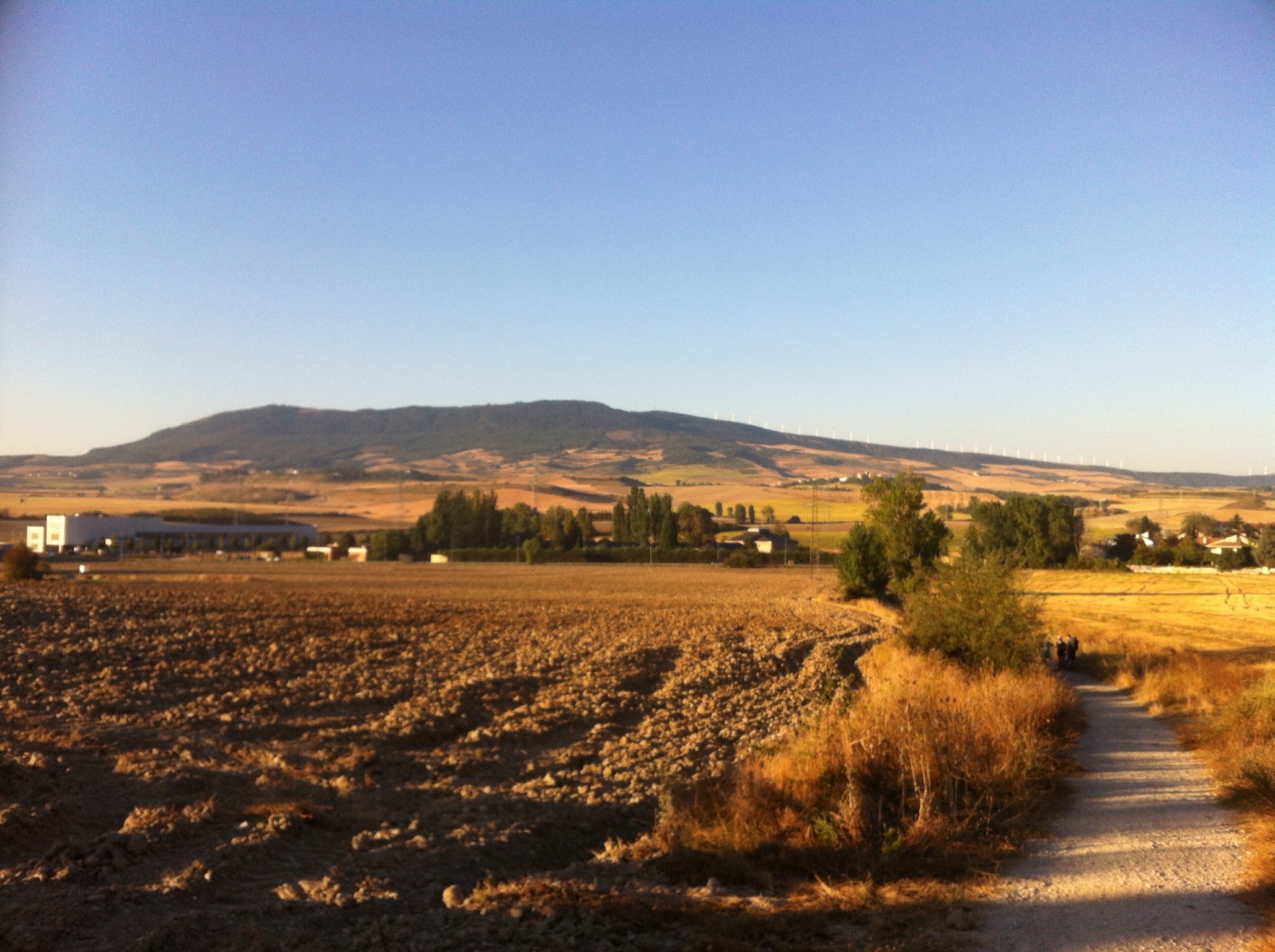 The outskirts of Pamplona are unremarkable, modern developments of interlinked units with a industrial style of architecture. In the far distance we see for the first time our challenge for today, a high ridge lined with spinning wind turbines.