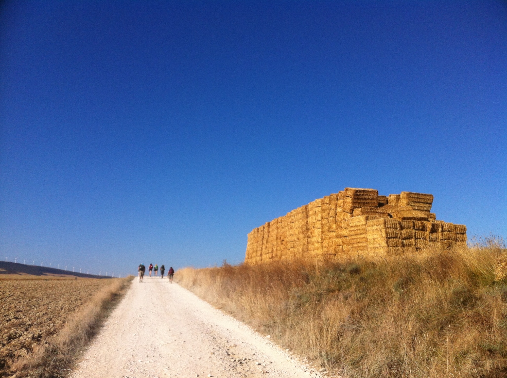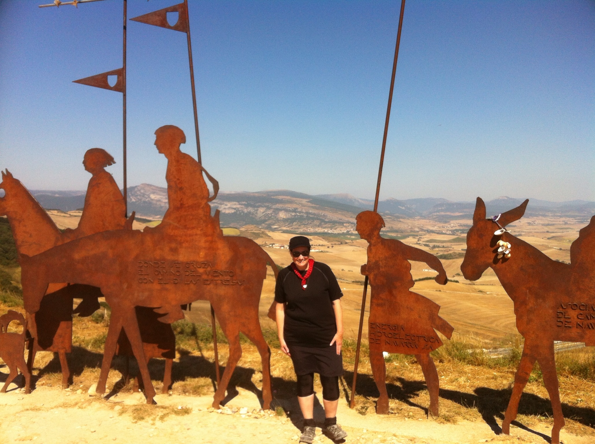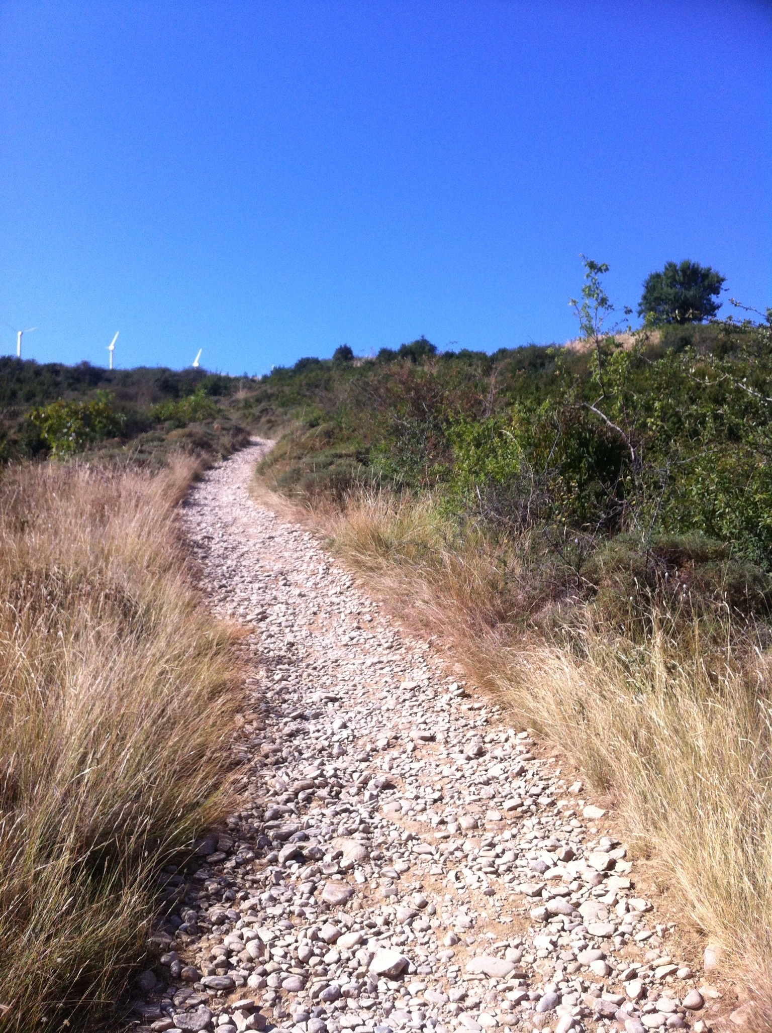 We press on through Zariquiegui, the wind turbines looming now. The last incline is steep and long and we crest the ridge panting. The wind slaps our face and slices through our sweaty clothes.