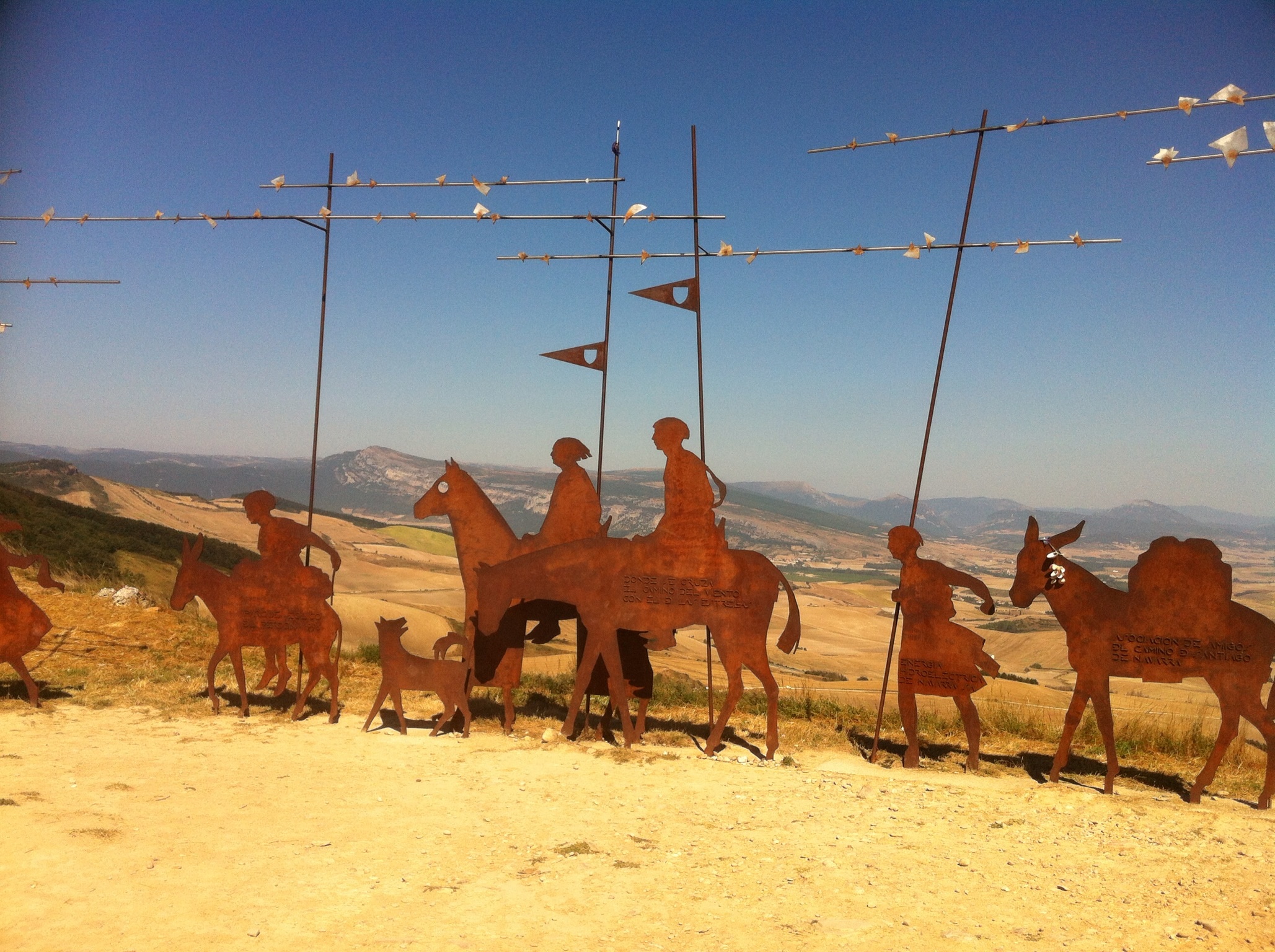 A series of iron silhouettes of a caravan of pilgrims past lies on our right however the shade of a concrete monolith with a raised section to sit draws my backside.