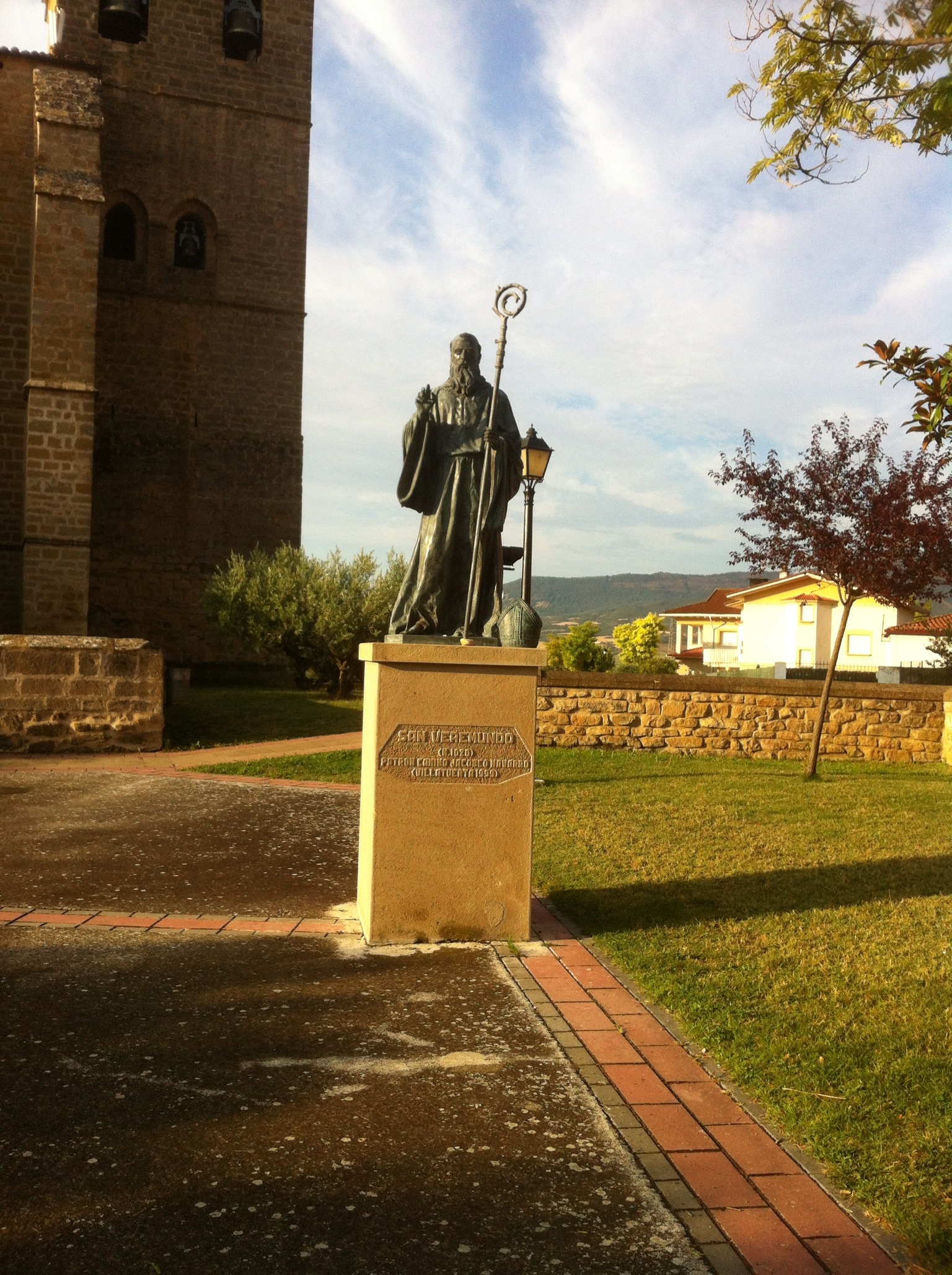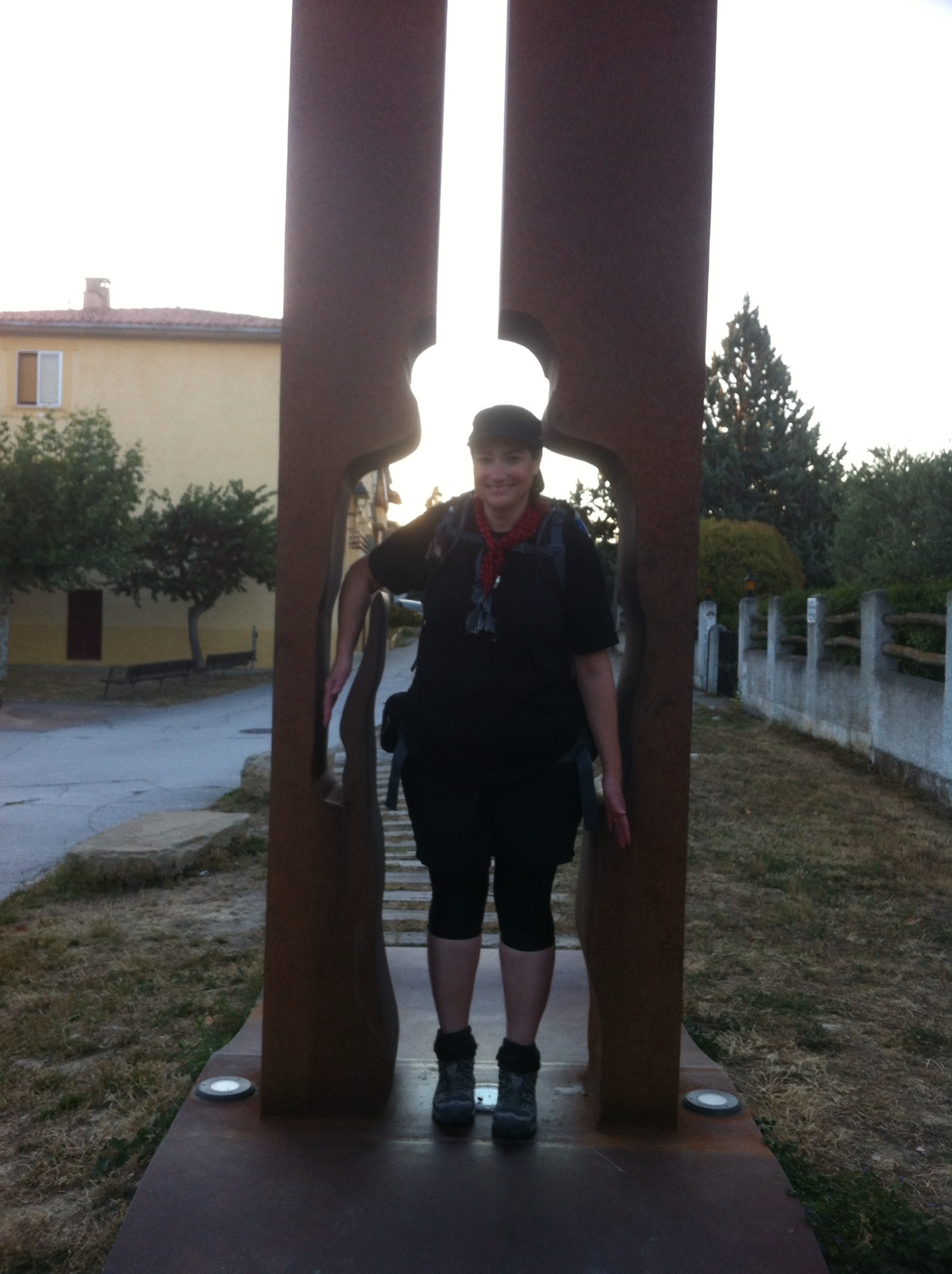 We blast through the first two villages Muruzabal and Obanos. The sun has risen by the time we make Obanos and we pause to take photos of the church and an interesting statue on the outskirts.