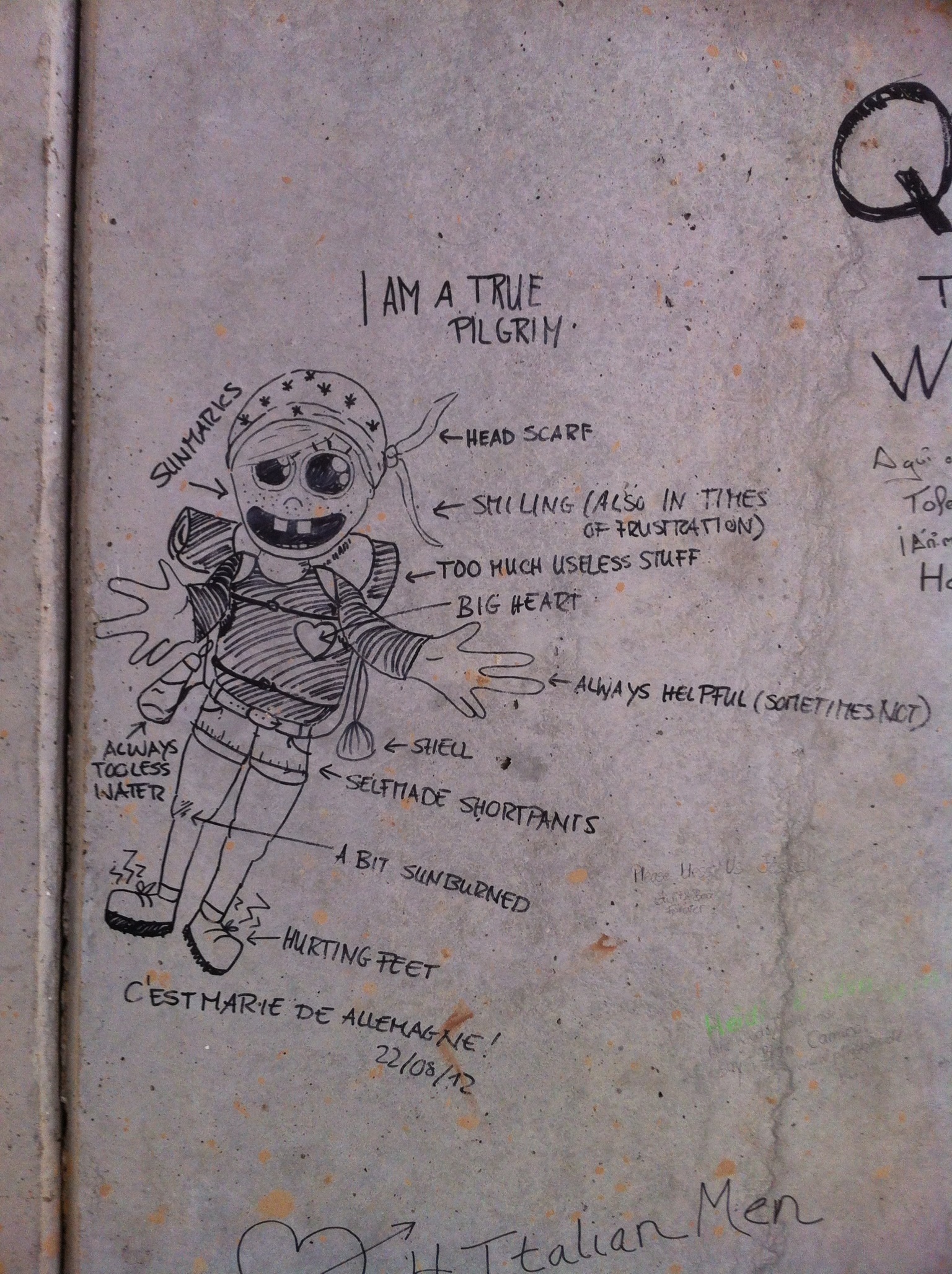 During our walk between Cirauqui and Lorca we go through several underpasses under the highway, one of which has some graffiti we feel is worth photographing. Pam is particularly taken with the Pilgrim Doll.