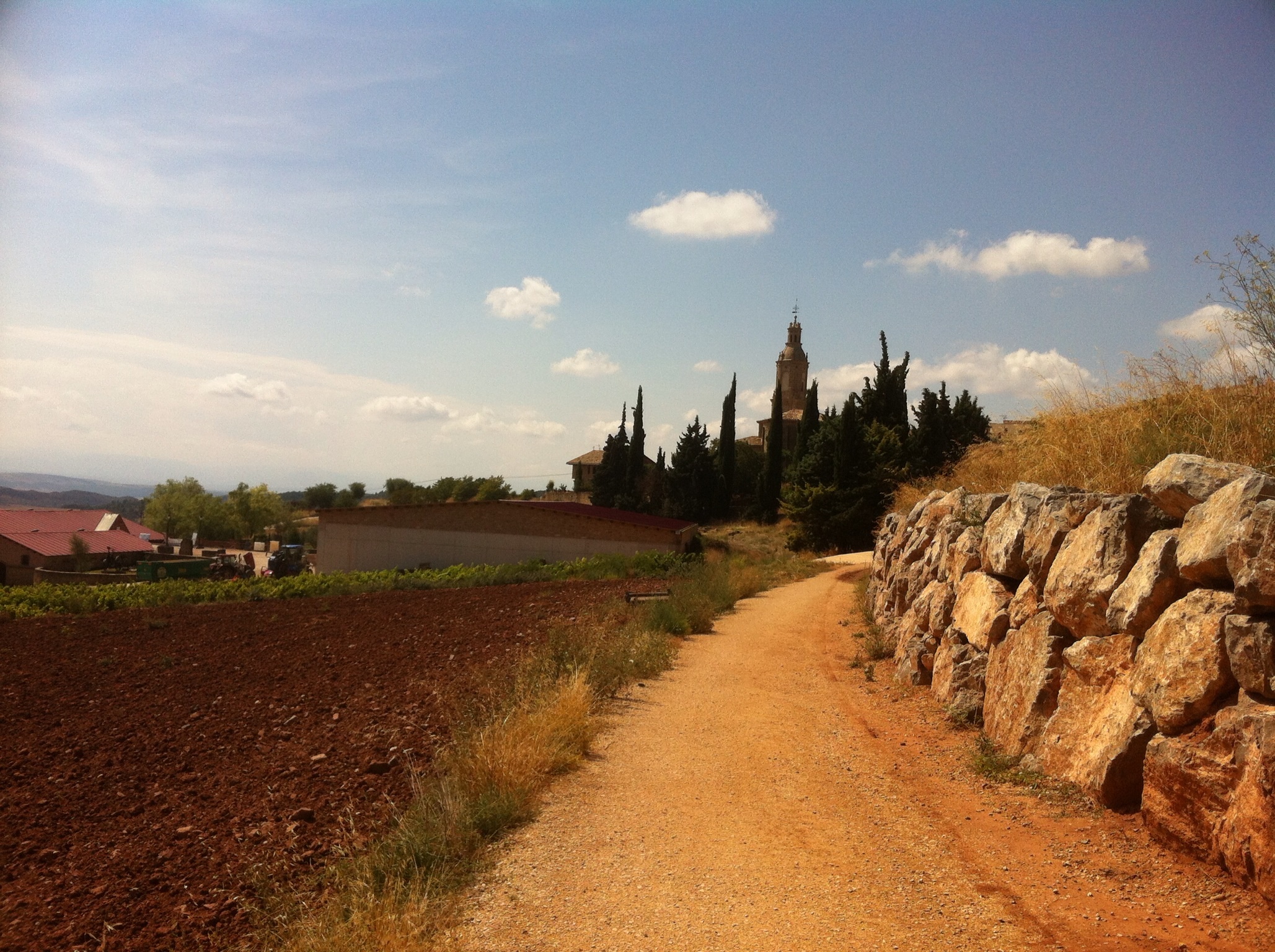 For kilometer after kilometer the Camino follows beside major roads. We only occasionally walk on the highways themselves but spend hour after hour walking on bitumen or gravel service roads. We briefly leave the highway and head towards the village Navarrete. Before the village is a large winery in front of which lie the ruins of a twelfth century pilgrims hostel and monastery. Pam and I stop for our first real rest here and eat some fruit and nuts.