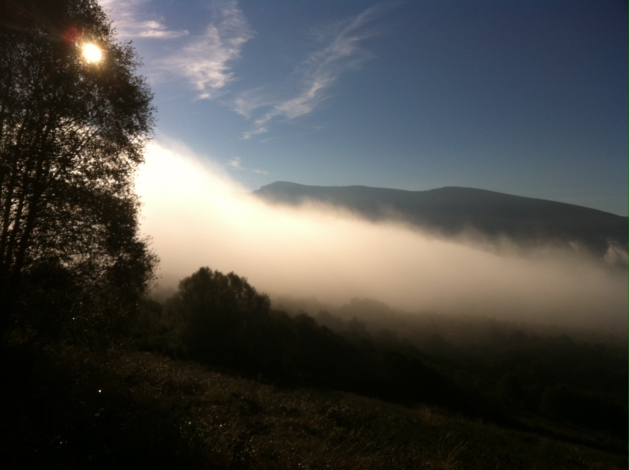 Soon we draw level with the upper side of the cloud bank and the sun is revealed in its true majesty against the blue sky. A break in the trees enables us to watch as cloud tendrils close from opposite ends of the valley below.