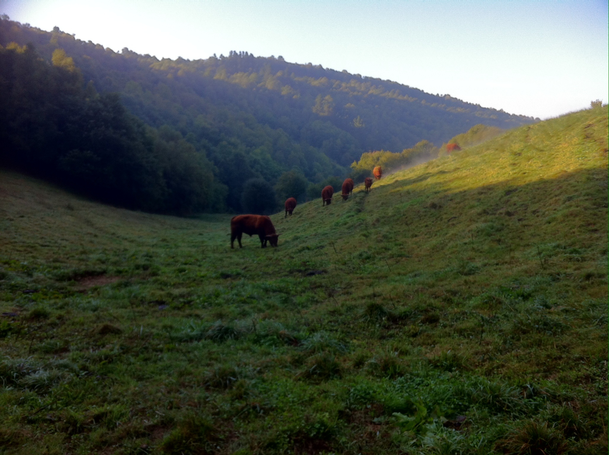 The climb continues and we draw level with the clouds draping the hills as we pass some cattle contently chewing their cuds in contemplation.