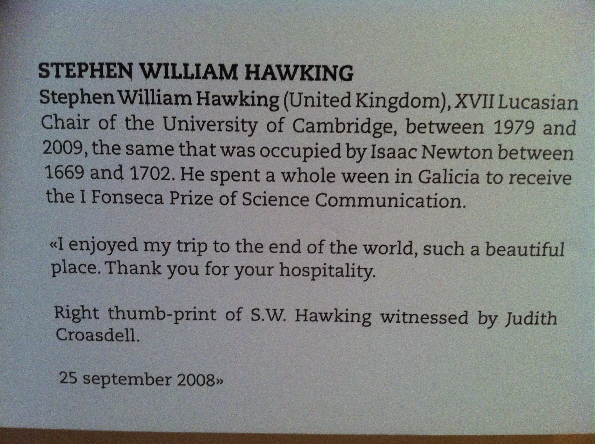 Nobel Prize winners for chemistry, medicine, literature, economics, physics. Stephen Hawking has made it here on his wheelchair and left his verified thumbprint.