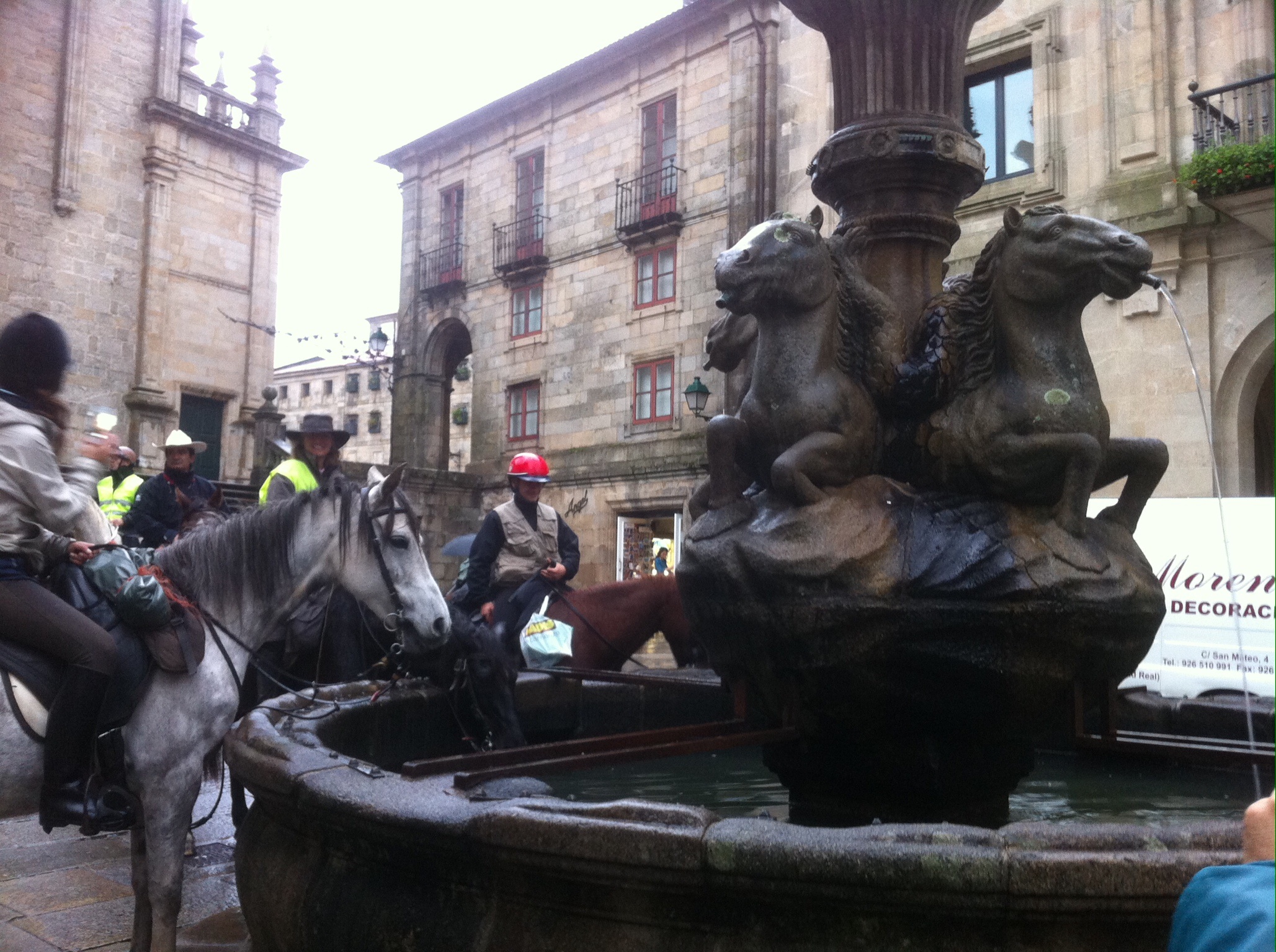 A group of horses and riders are congregated around the fountain in front of the entry stairs to the cathedral and we take photos as the horses drink before the group click clack down the street to the main cathedral square.