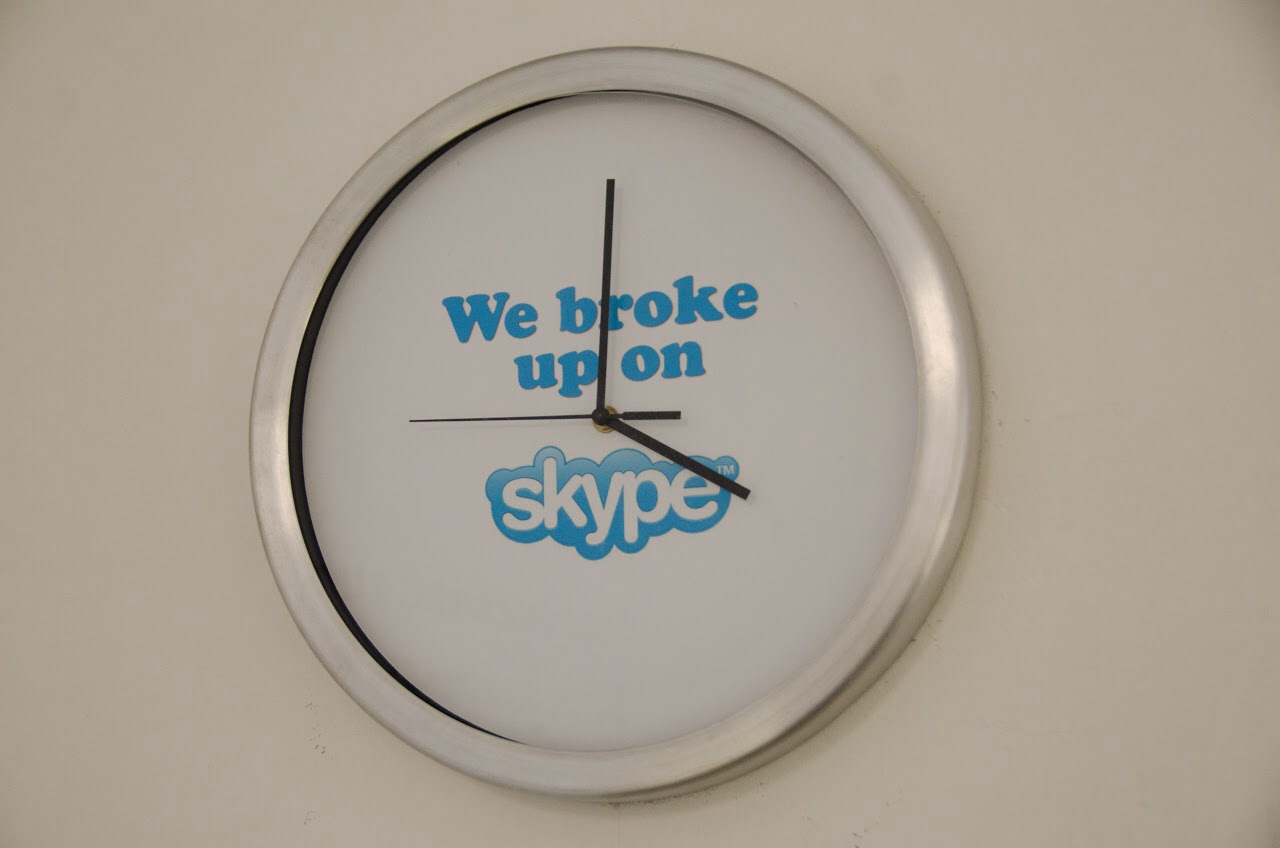 A clock with the face ‘We broke up on Skype’ has me laughing despite the outrage of the accompanying message.