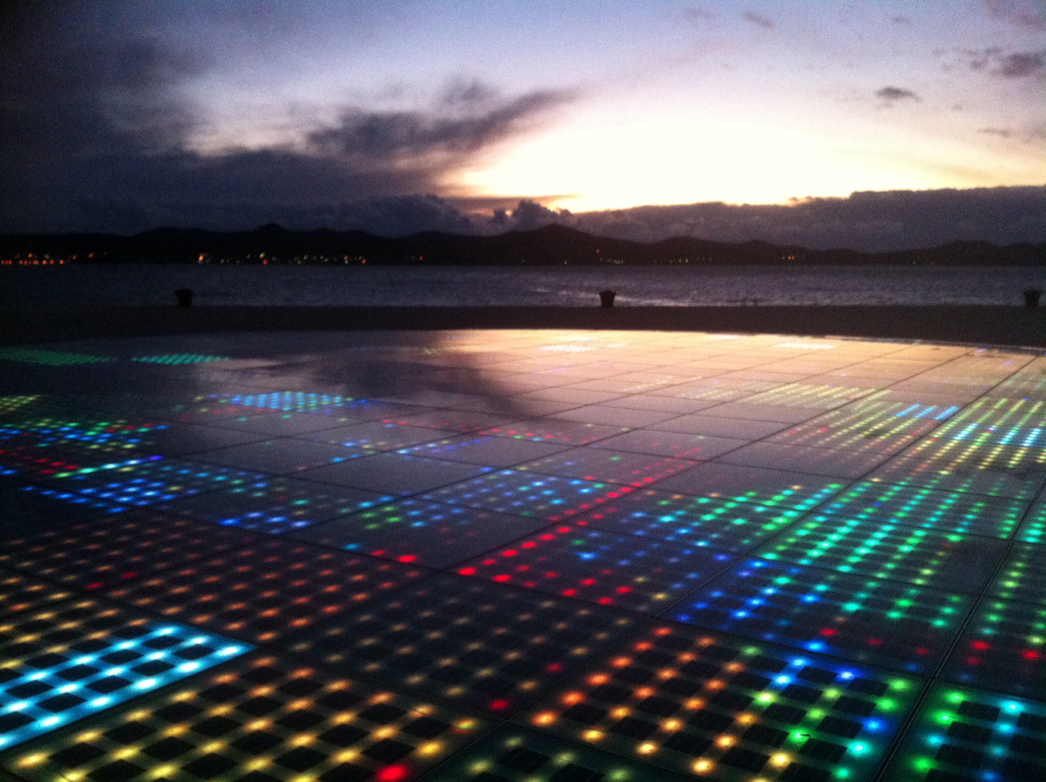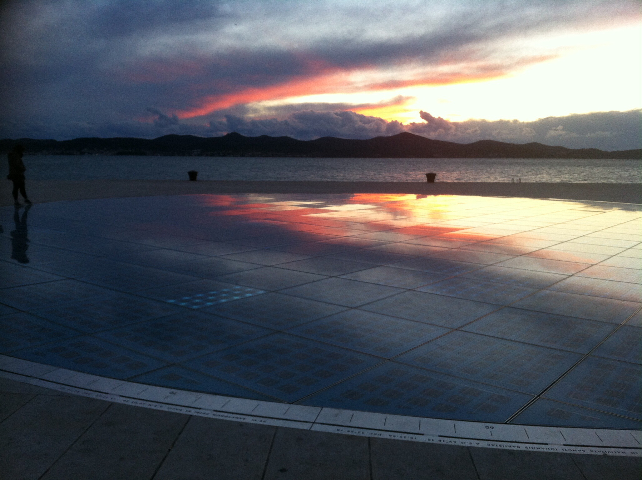 There is a young lady with very professional looking camera equipment taking photos of the lights as they dance across the disc. Once she is done I do my best to catch the dance with the iphone. I have already taken a video in a slow spinning circle standing on the Sea Organ steps to capture the haunting sounds and I repeat the circle spinning in the middle of the Salute to the Sun as the LED waves course below my feet.
