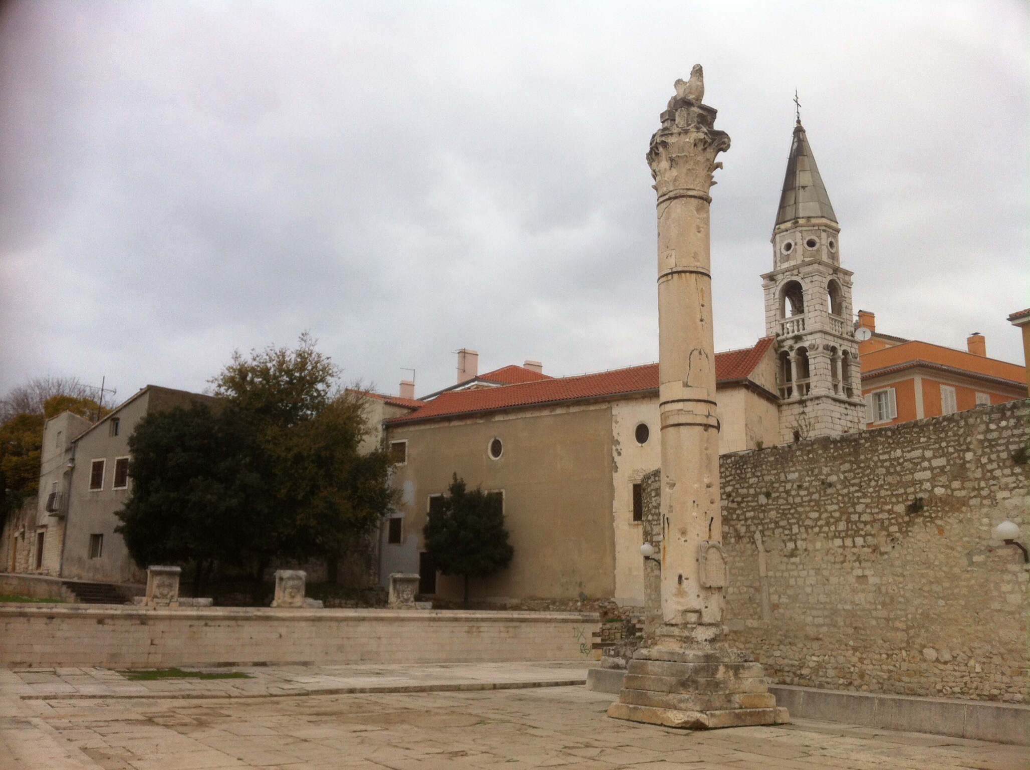 We look out across Old Zadar, the second pillar of shame is clearly visible as are the Captains Tower, St Simeon’s Church, the Velebit mountain range and the red tile rooftops of the town.