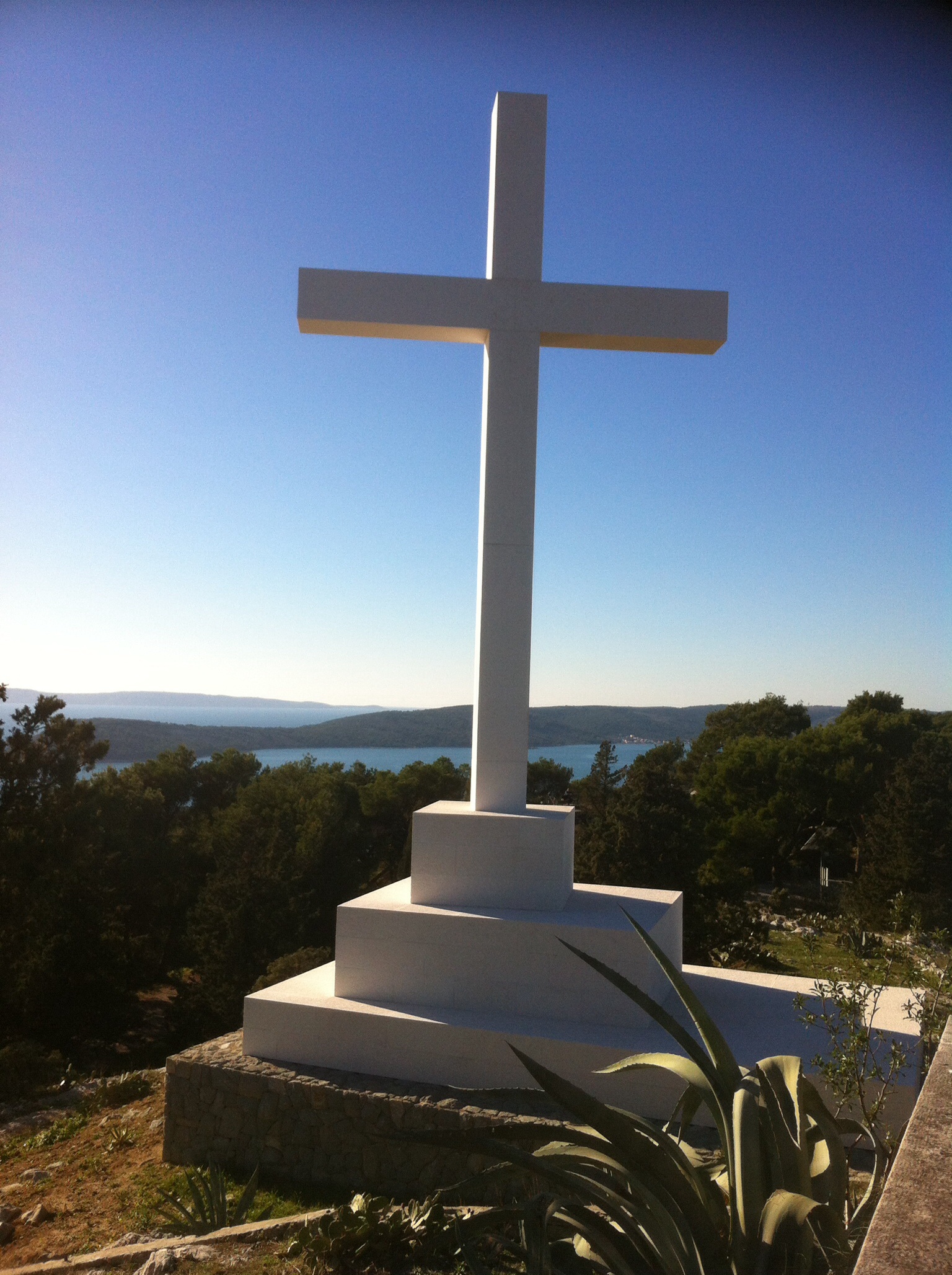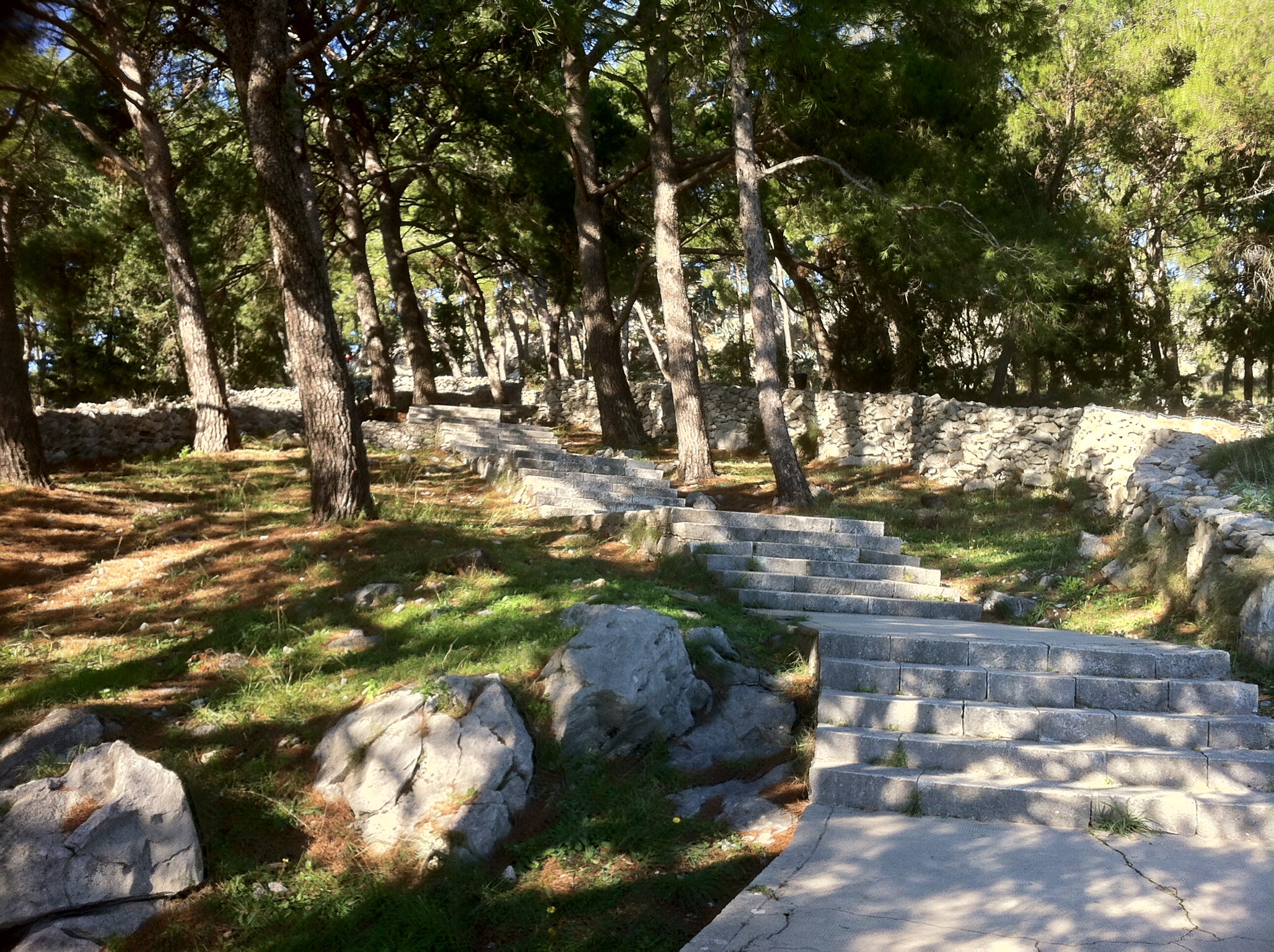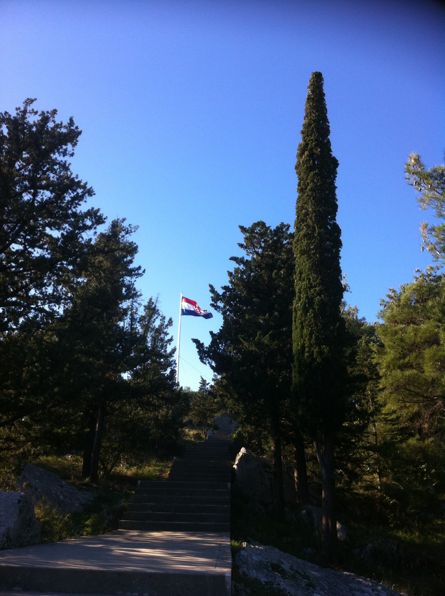 The air is so still I have to wait for some time to catch the Croatian flag in full extension on the iphone. Redolent pine fragrance emits from the trees flanking the stairs.