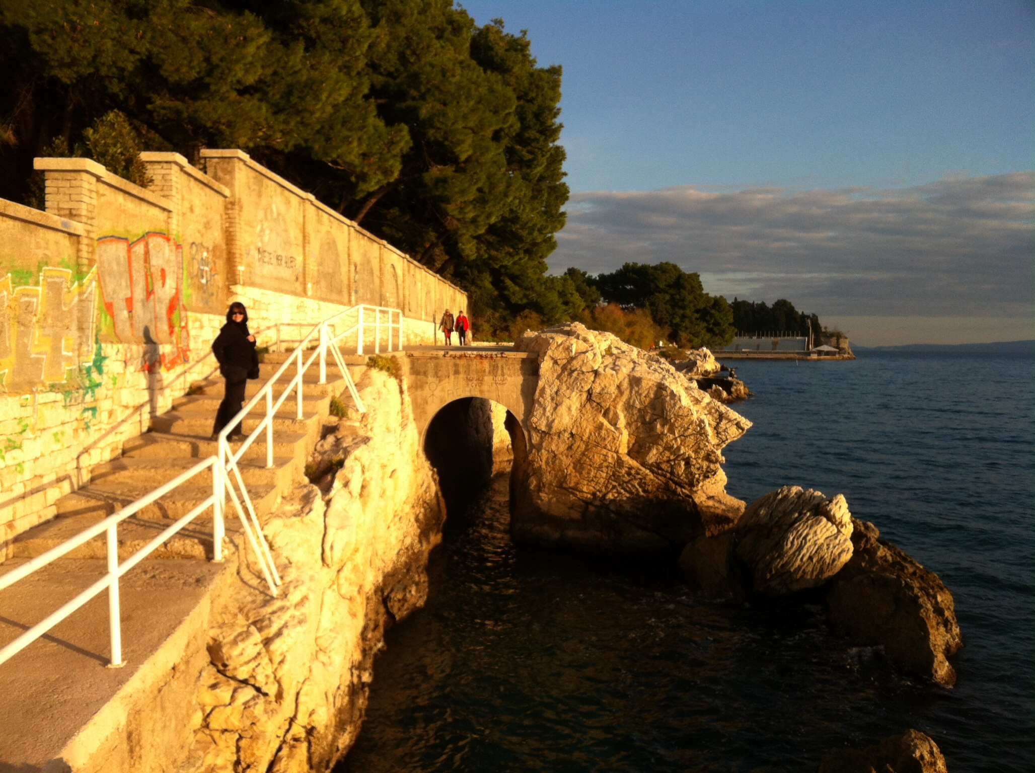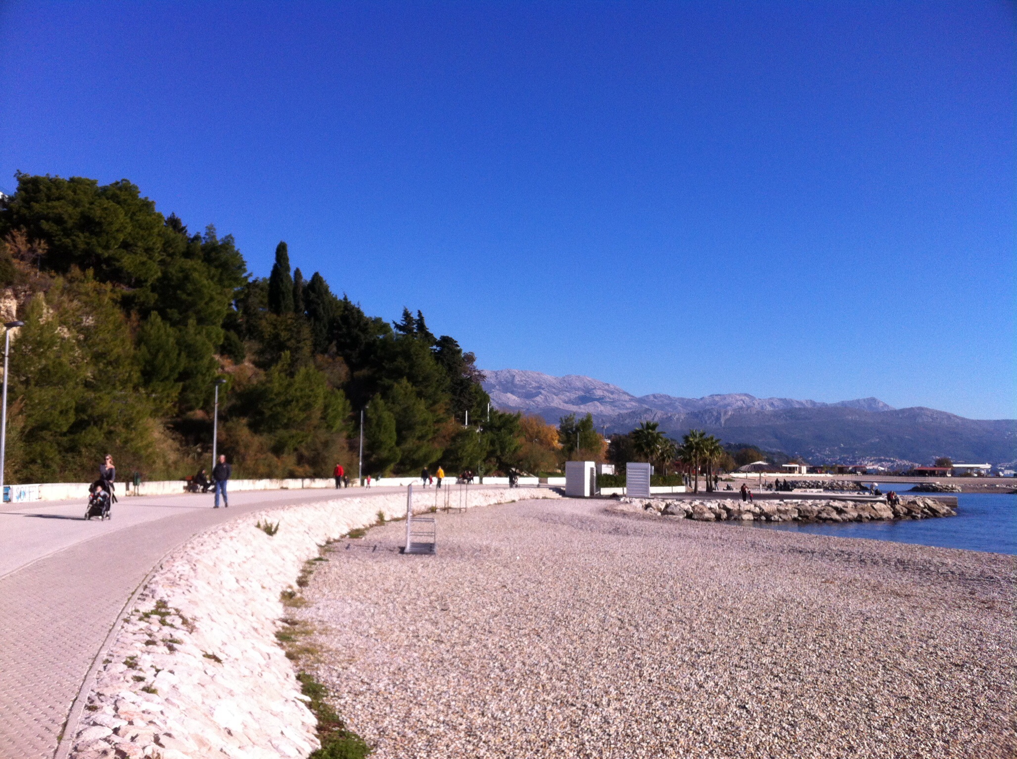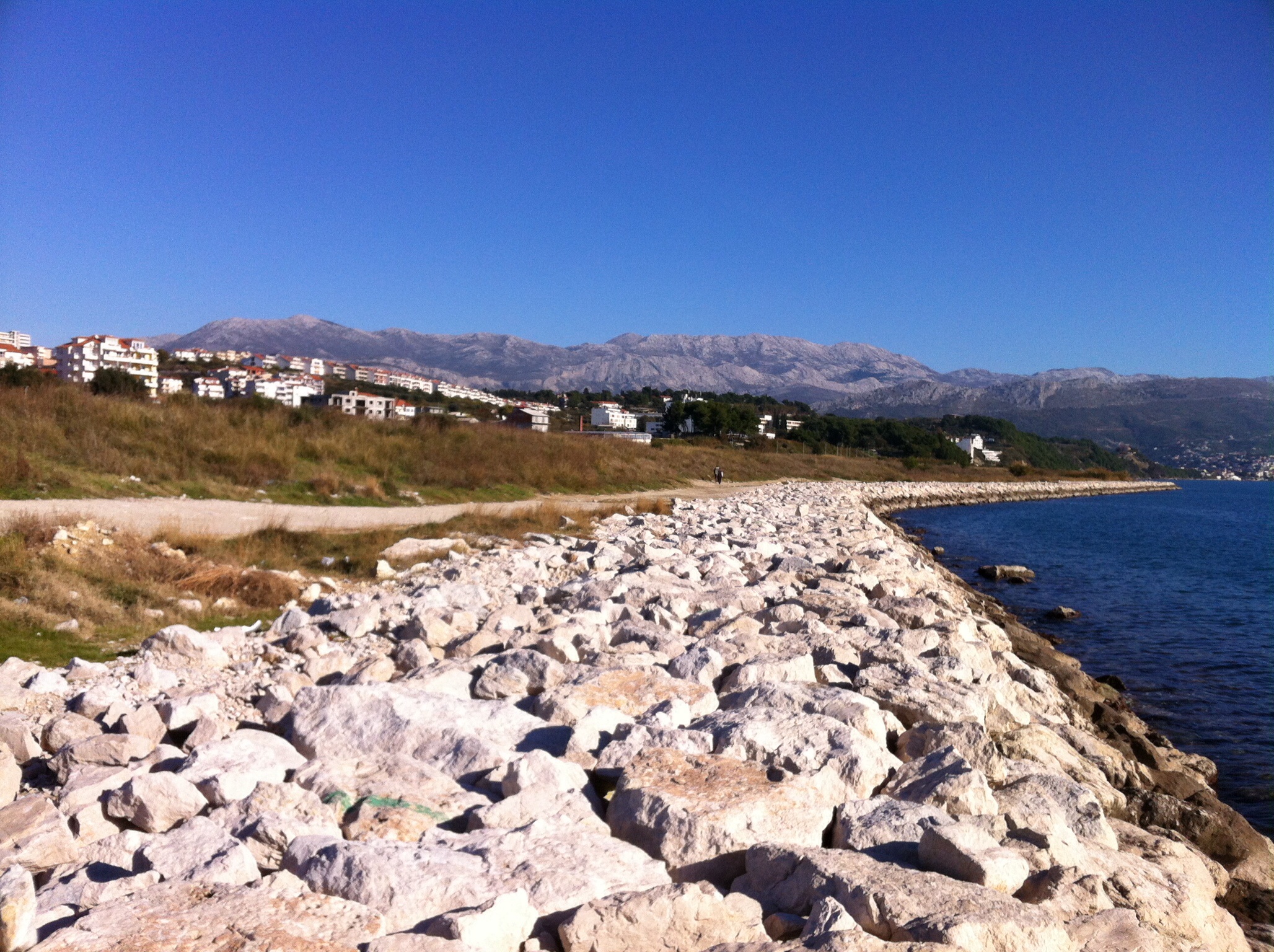 Blue skies greet us again the next morning. Today we plan to walk the coastline in the opposite direction to the previous day. I breakfast on the superior marching food (fruit) we had purchased in the Pazar (farmers market) and study the Split maps.