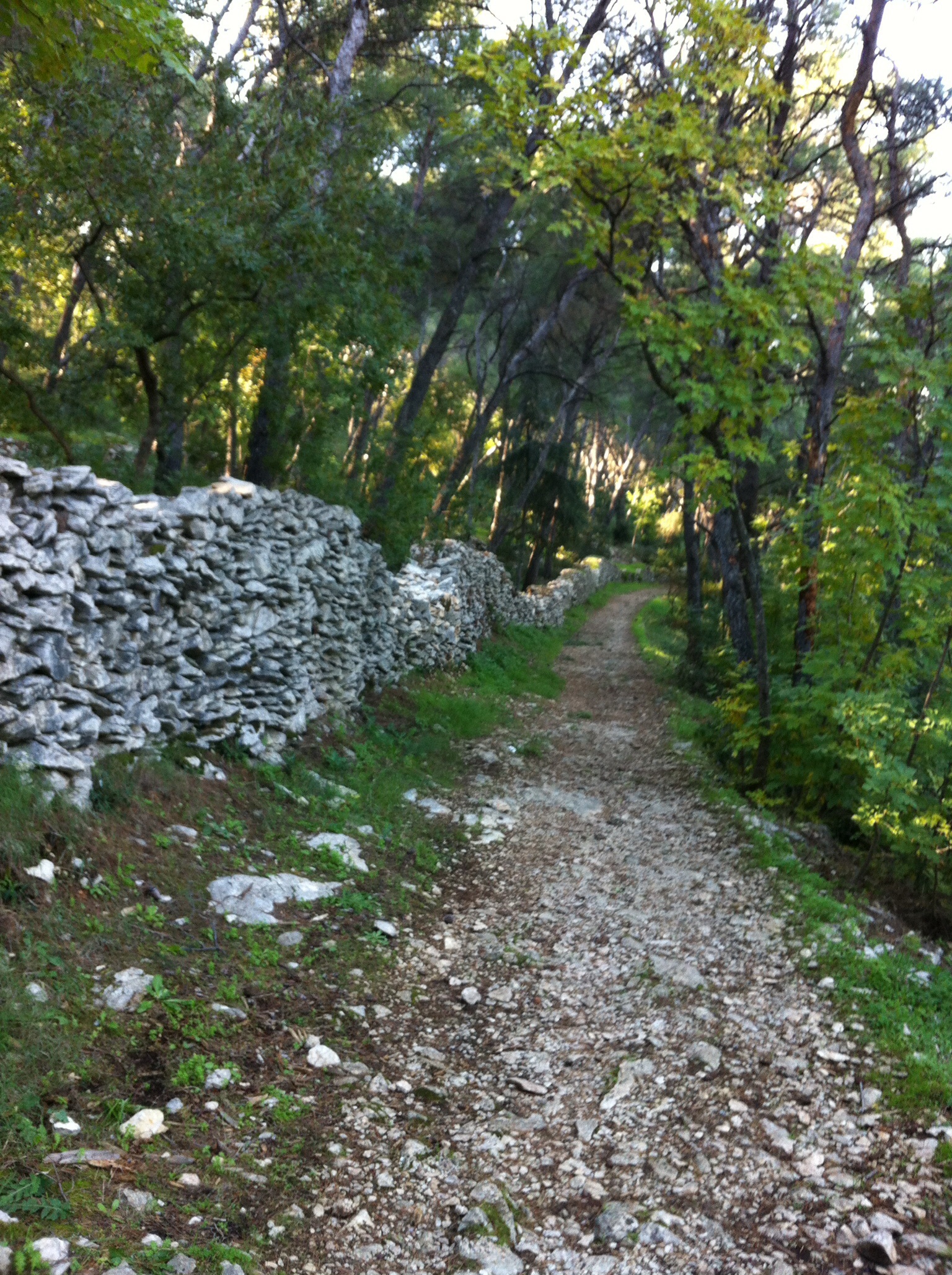 We follow the road down a little further before turning onto a gravel trail running alongside a rock wall.