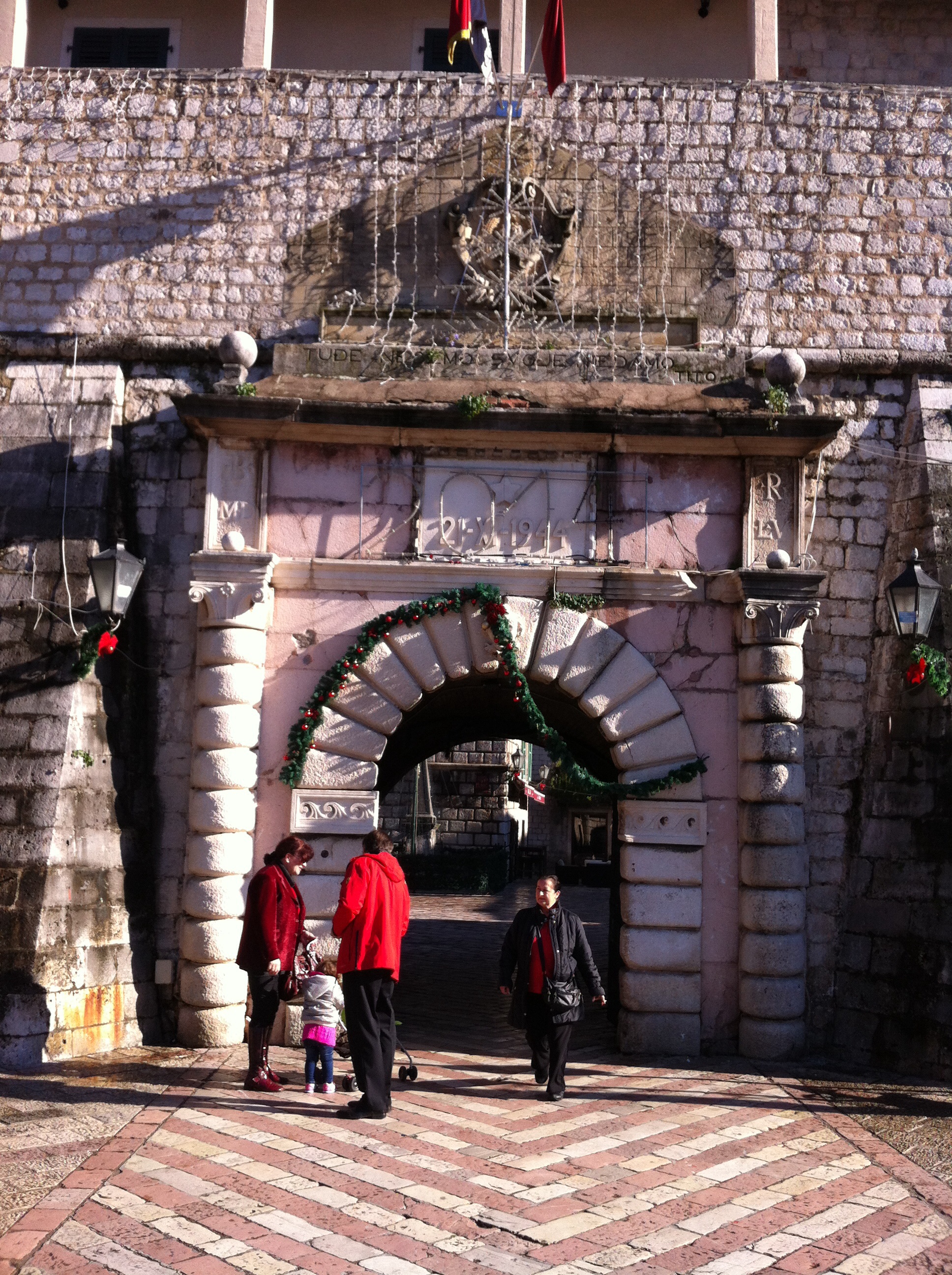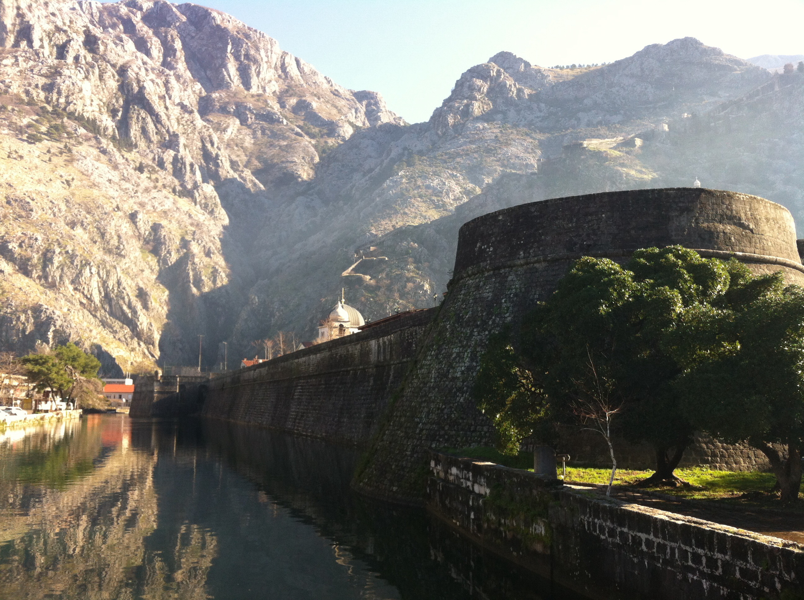 These little streets and staircases form a labyrinth between buildings giving multiple options to descend. We follow the guidance provided by our young cake bearing friend from the previous afternoon and soon we are crossing a bridge over a quickly flowing fresh water stream and find ourselves at a corner of the Old Town Walls on the flat ground beside the waters of Kotor Bay.
