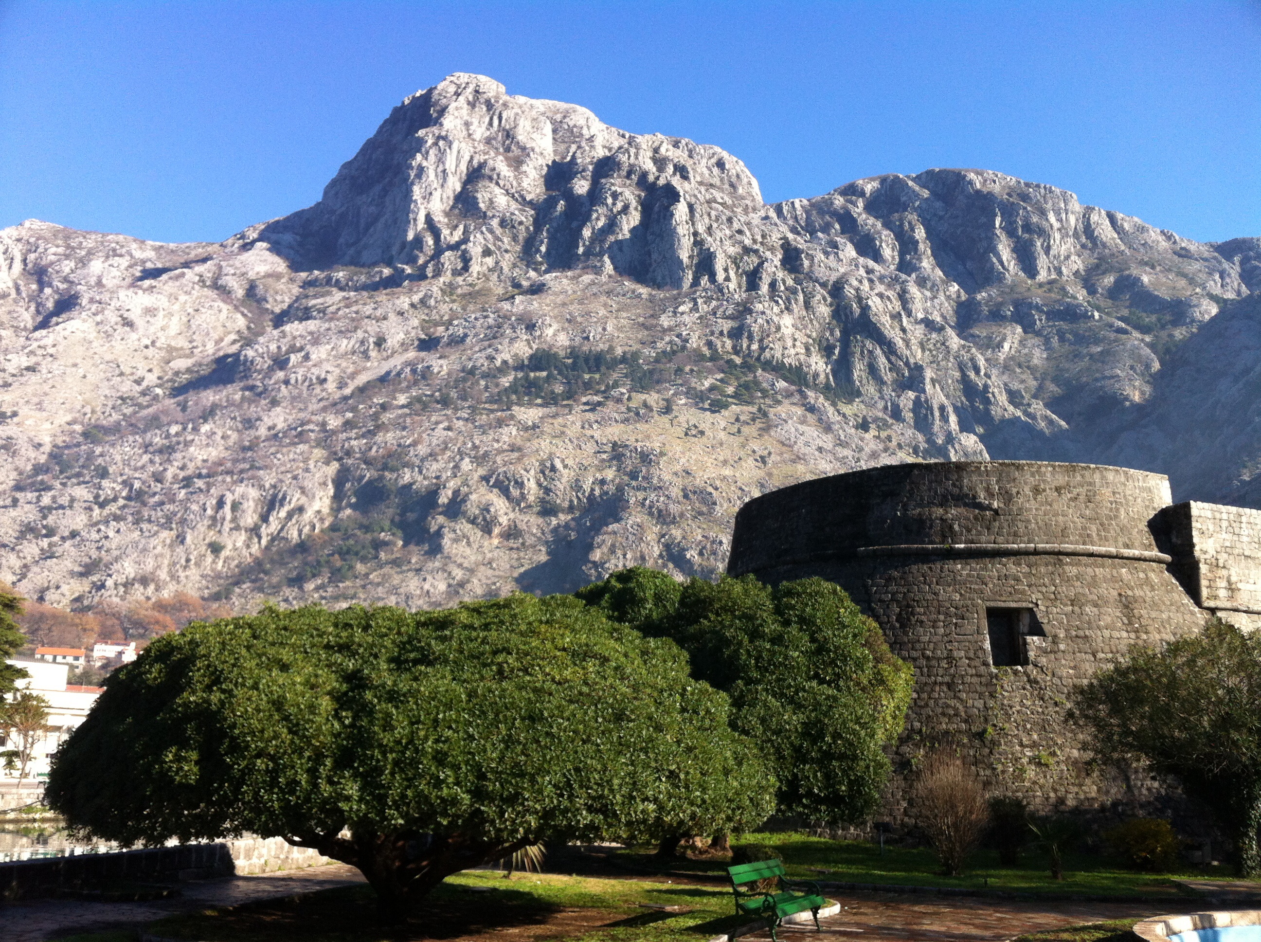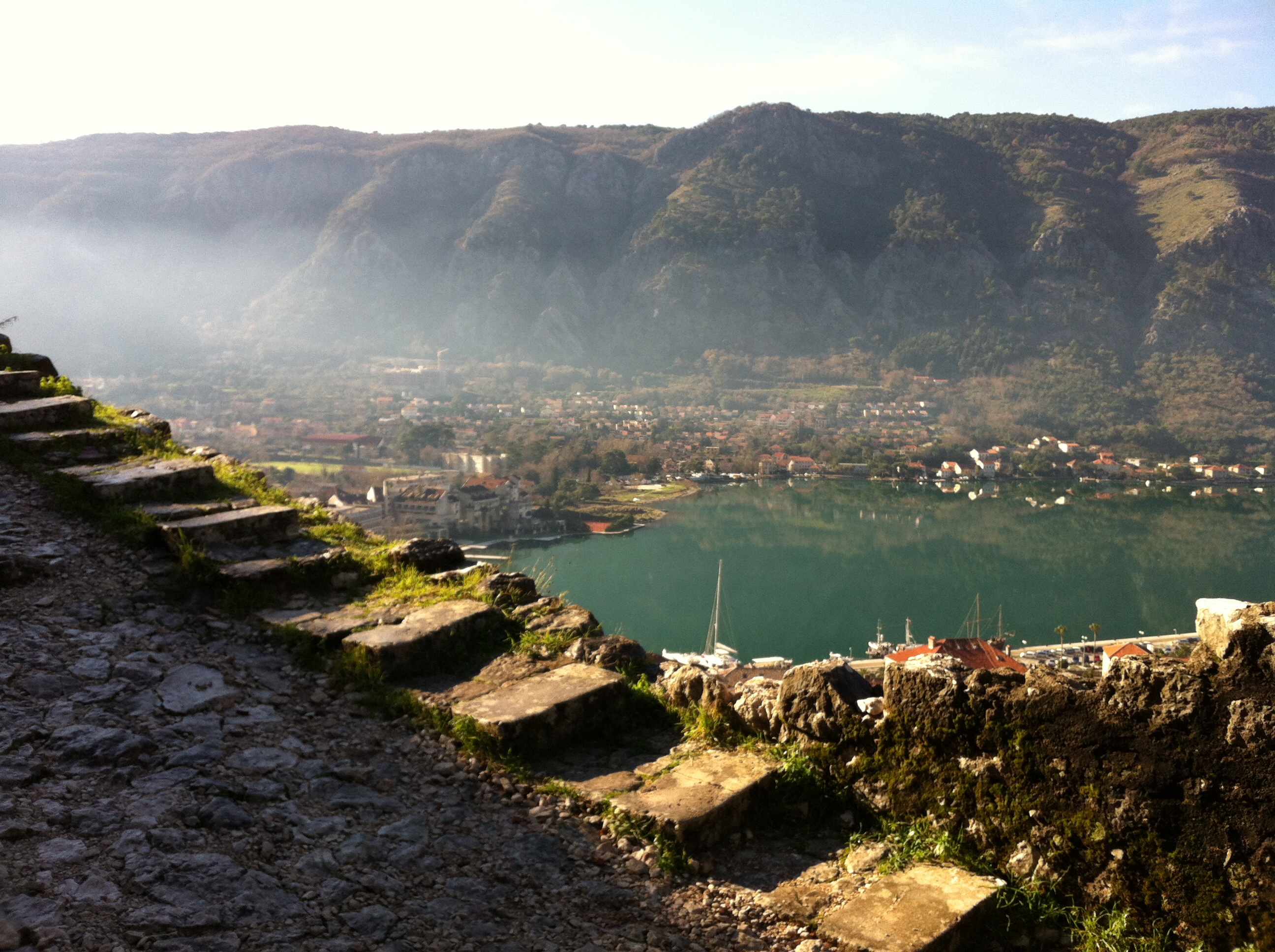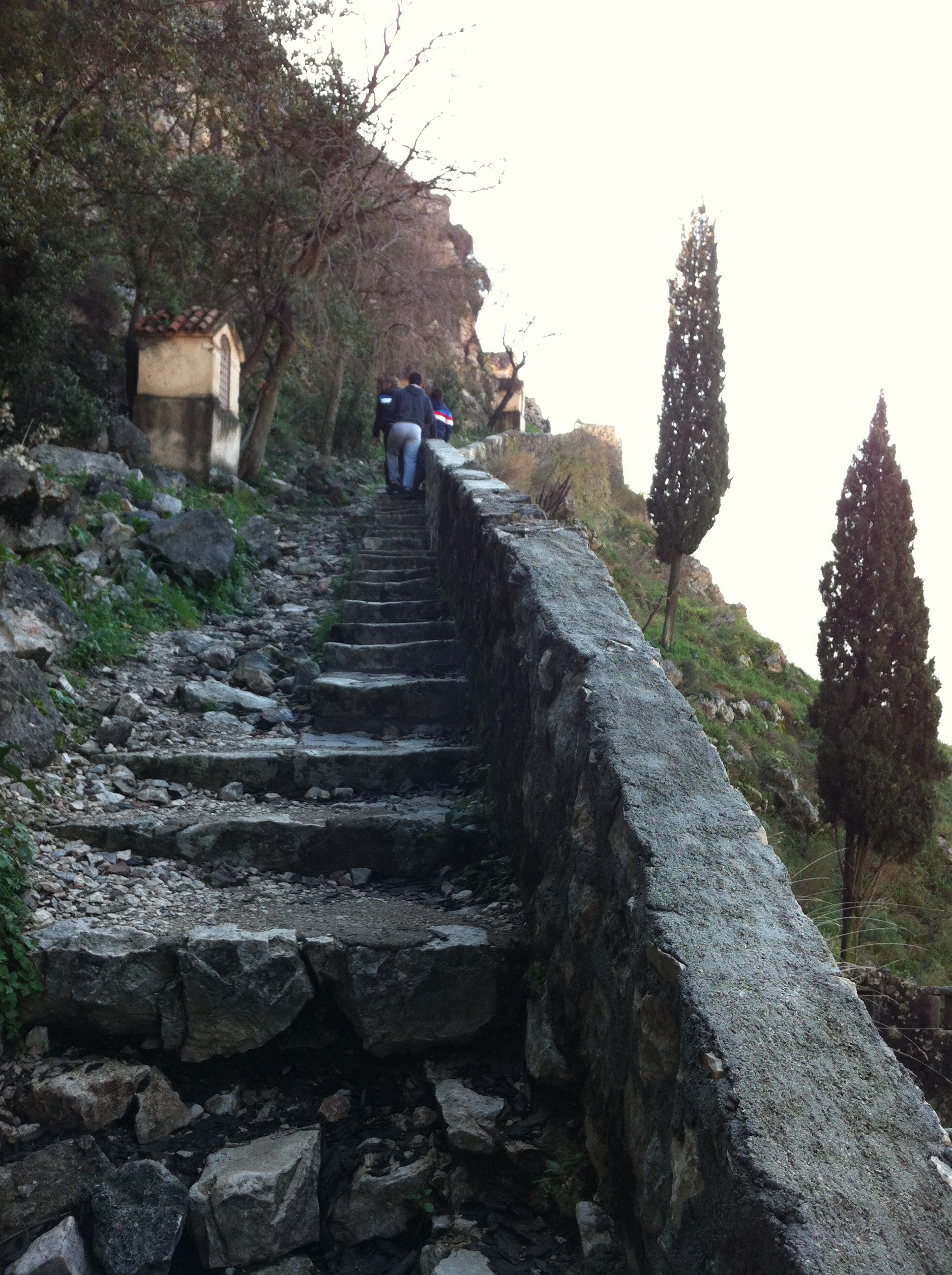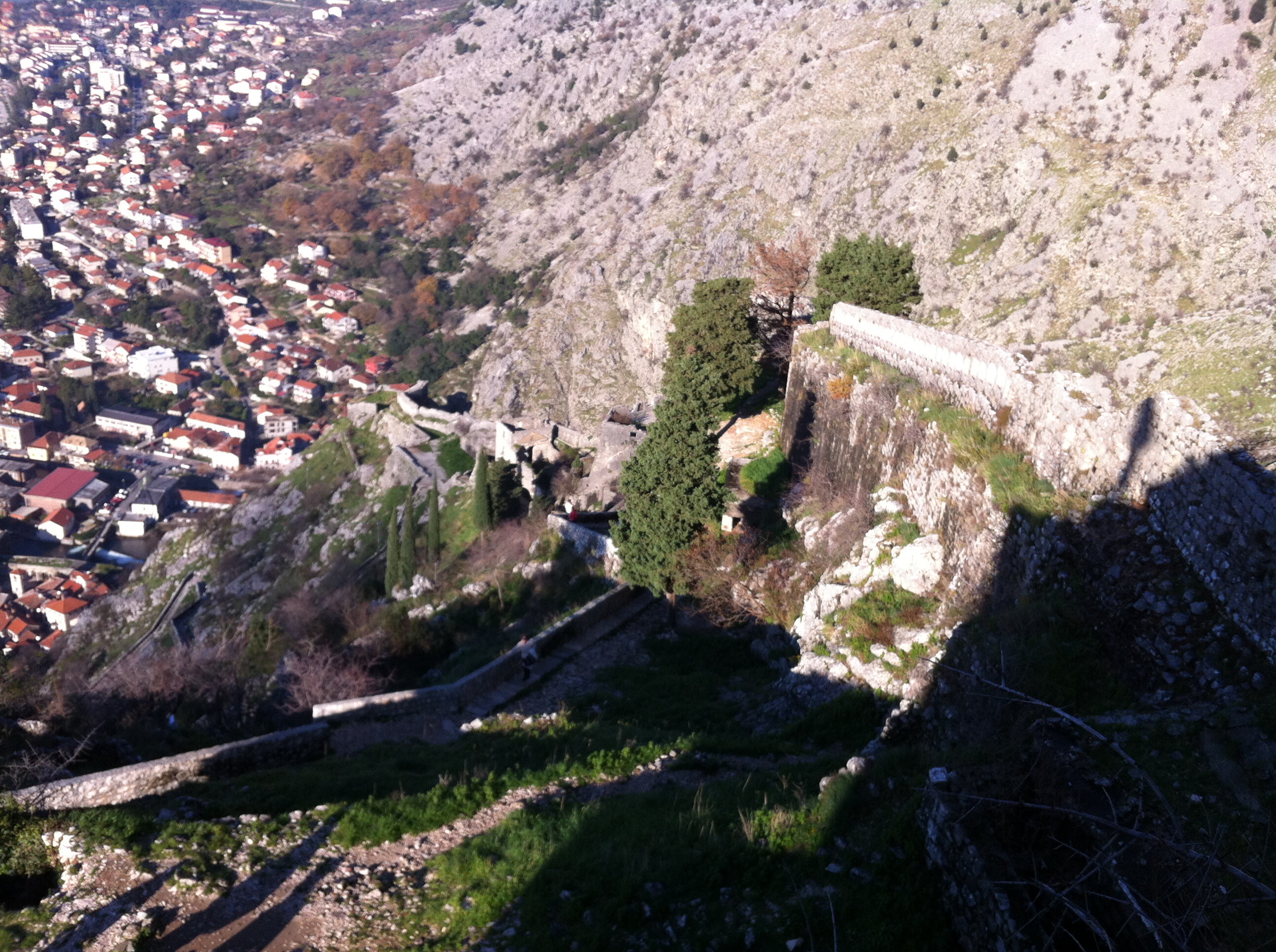 Yesterday both the bus ride into Kotor as well as the taxi ride back to our apartment took us past the walls of Kotor Old Town. Walking down to the shops later in the afternoon the steep slopes above the old town were dominated by a winding walled stone staircase zigzagging up to a ruined fortress high above.