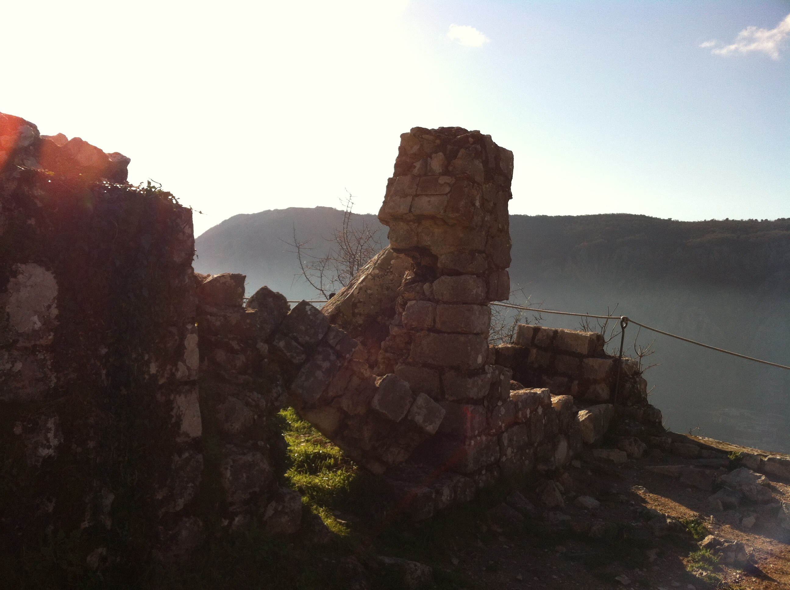 The ruins are built on the crest of a steep ridge that runs down the mountain side. A series of parallel stone walls are all that is left of the once grand defensive structure that warded of attack from the hillsides above.
