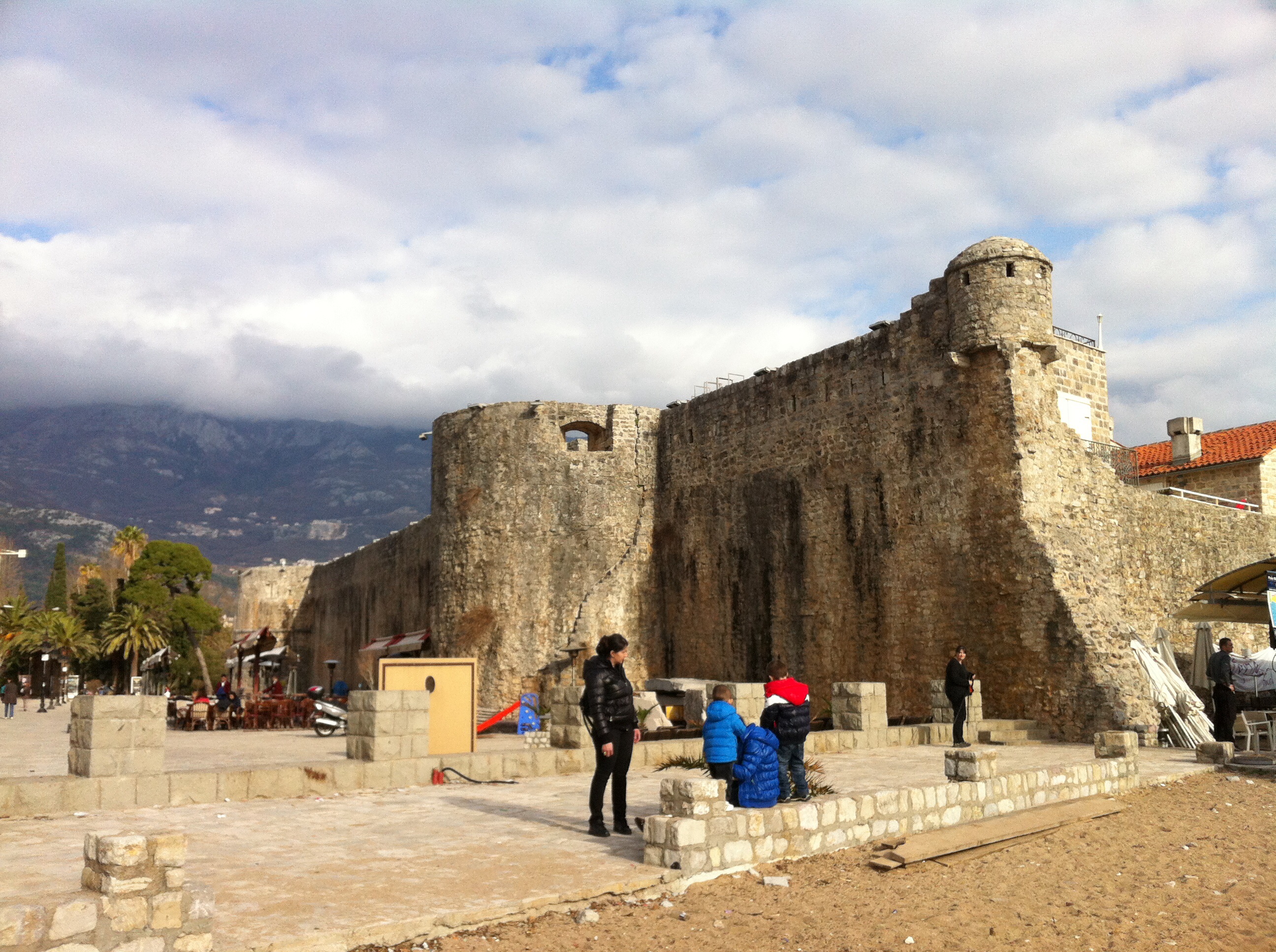 I am surprised to see a busy bar service with chairs filling the pebbled beach almost to the waterline lying hidden beyond the buttress of the walls. Despite the winter season and early hour the bar is busy. Families gather, little kids running between the chairs and tables.