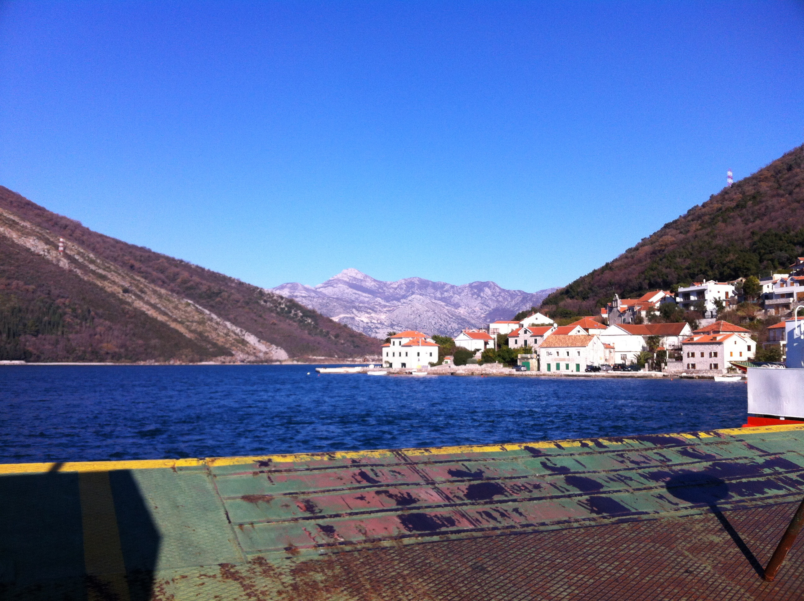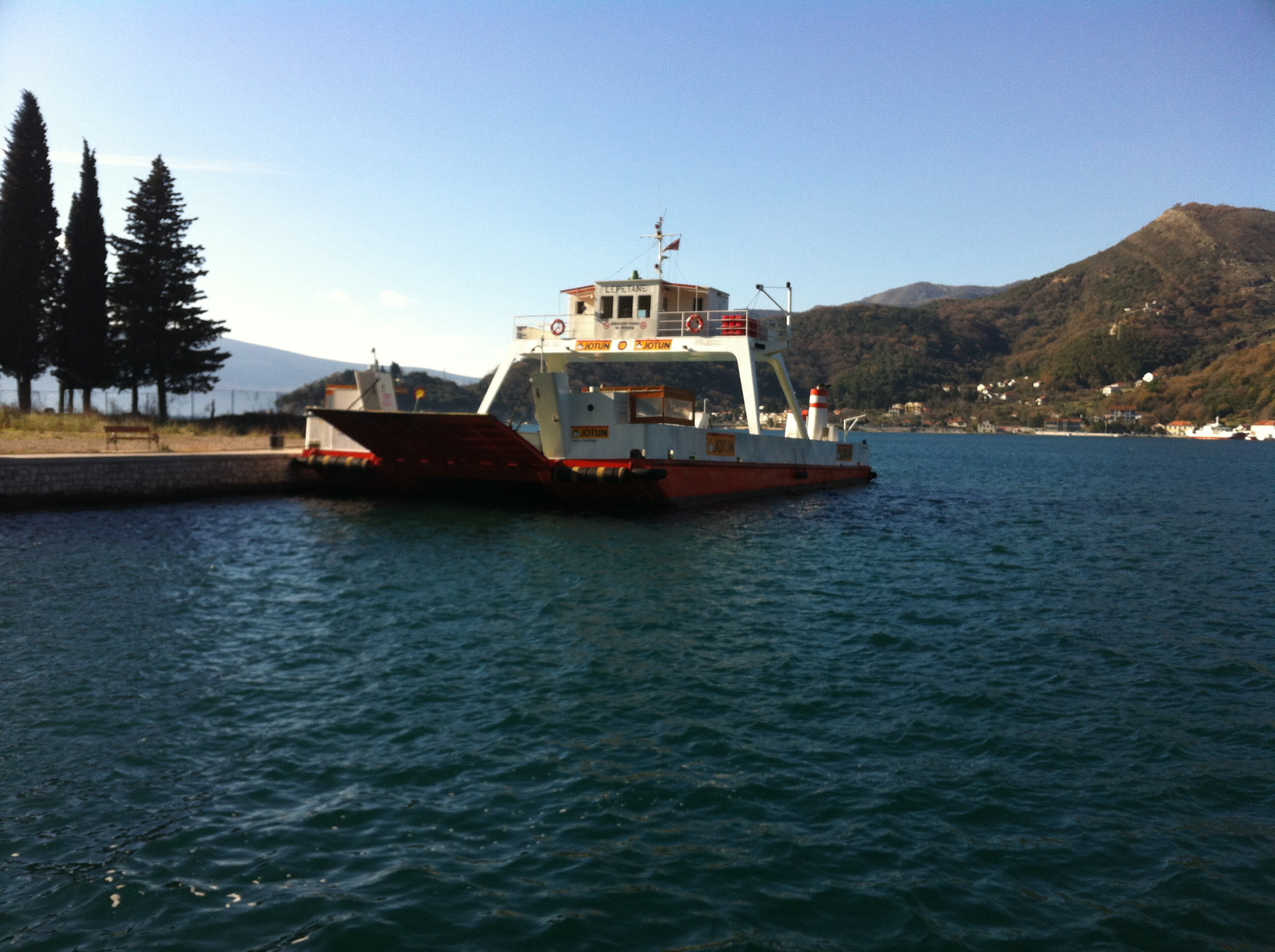 Our driver speaks little to no English, we drive in silence other than the radio. Suddenly he sparks into speech. I gather the gist of what he is asking is ‘do we want to catch the ferry across the waters between Lepetane and Kaminare to avoid the long drive around Kotor Bay’?