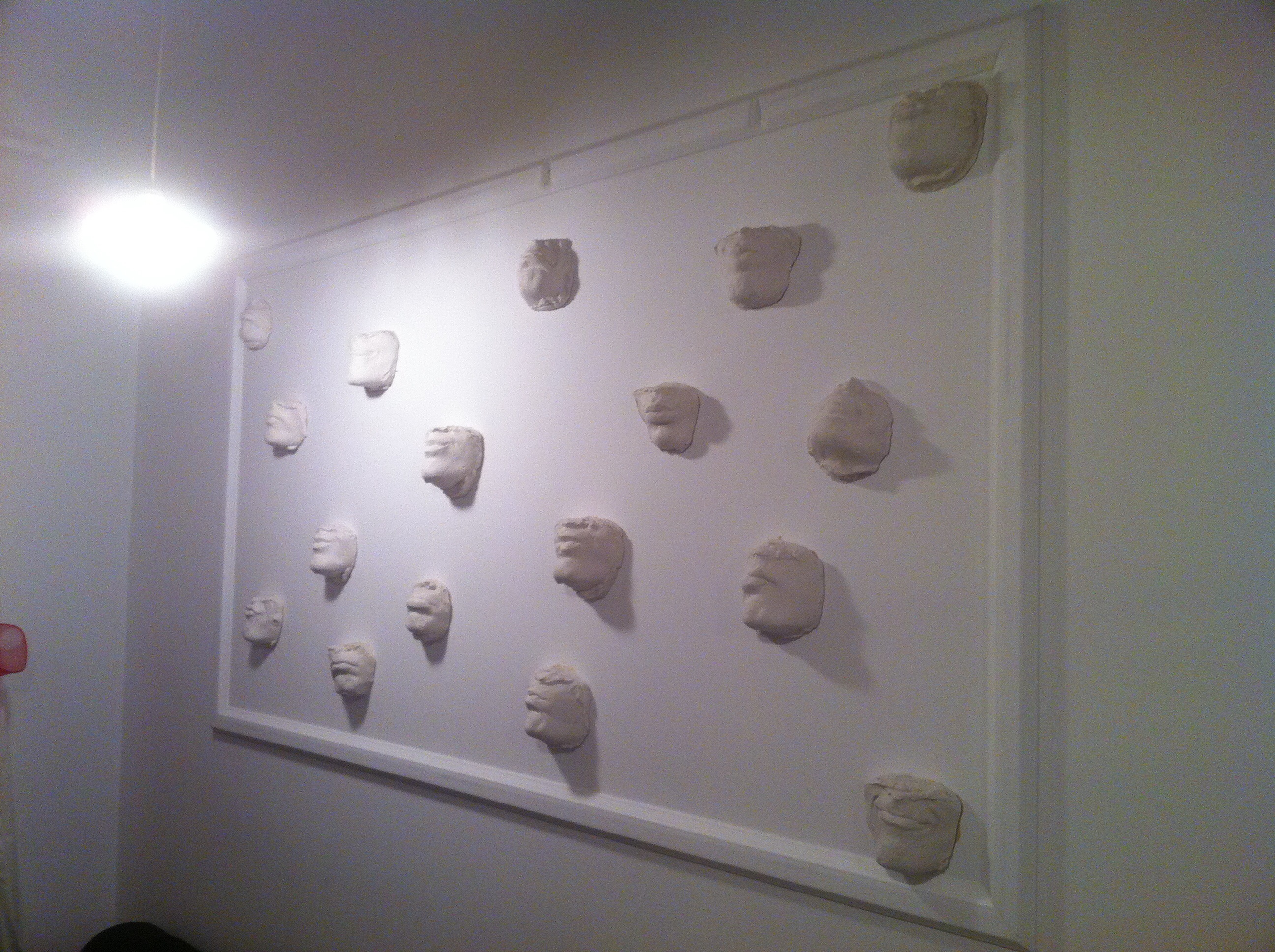 ‘I decorated it myself’ she says as I examine the art fixture containing plaster casts of half faces hanging from the wall at the far end of the room.