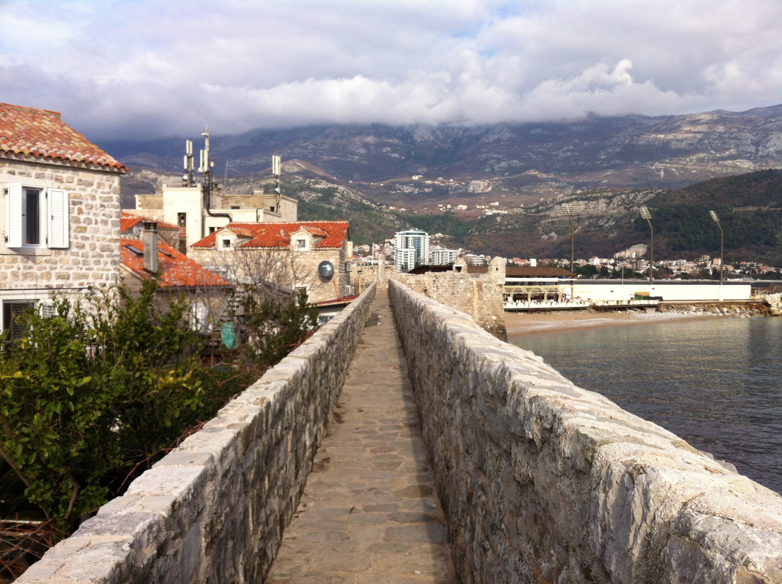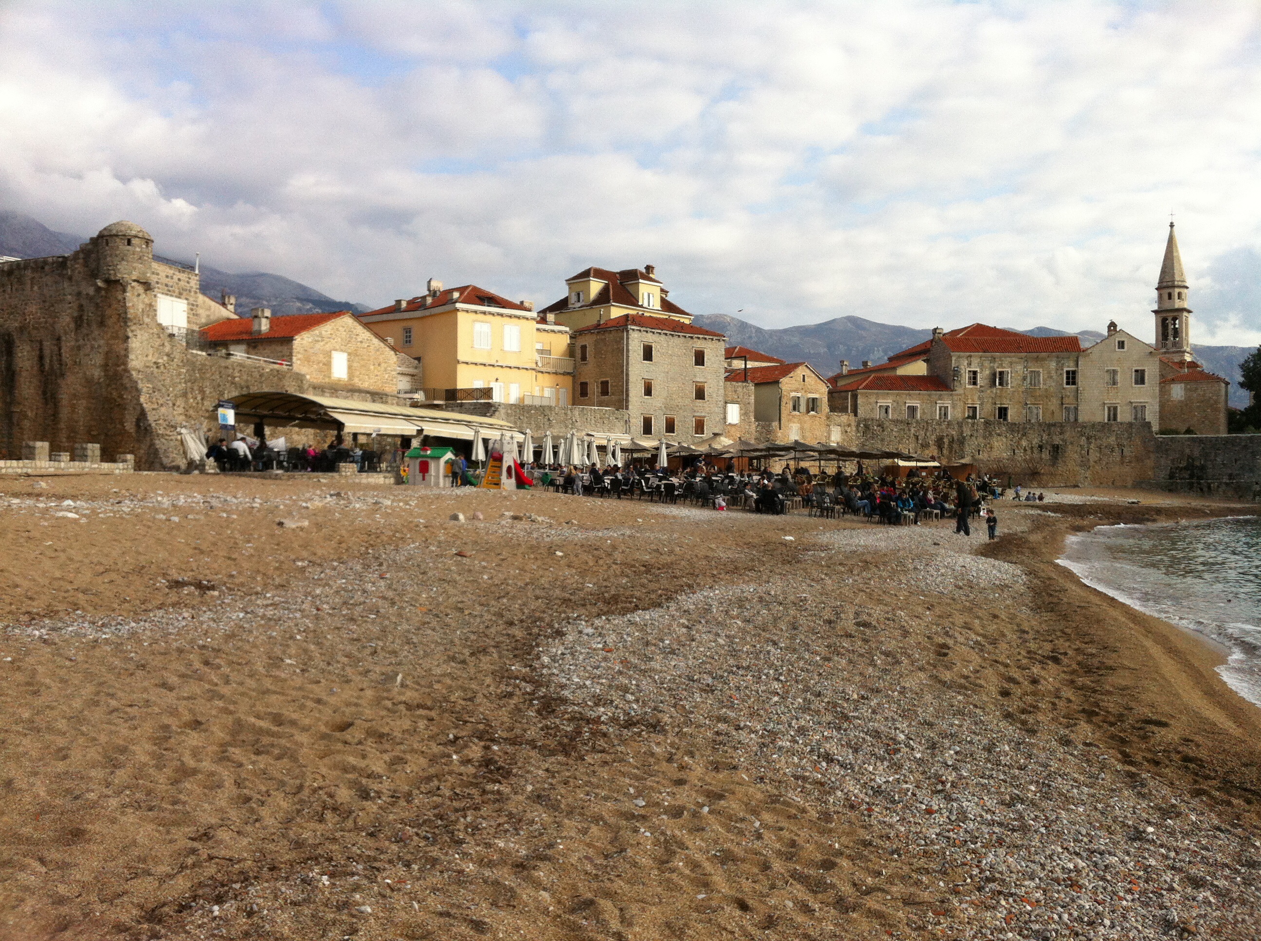 Budva Old Town has been constructed on a low rocky outcrop that juts into the bay at the end of the first short curving pebble beach that lies beyond the hill we had crested on the bus yesterday before descending in a cloud of smoke and fumes into Budva proper.