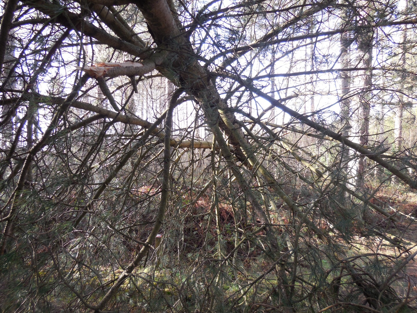 Our path leads under the trunk of a fallen tree that is still supported far from the ground by radiating branches. Boughs so green are unlikely to let the trunk fall further, we risk the pathway underneath.