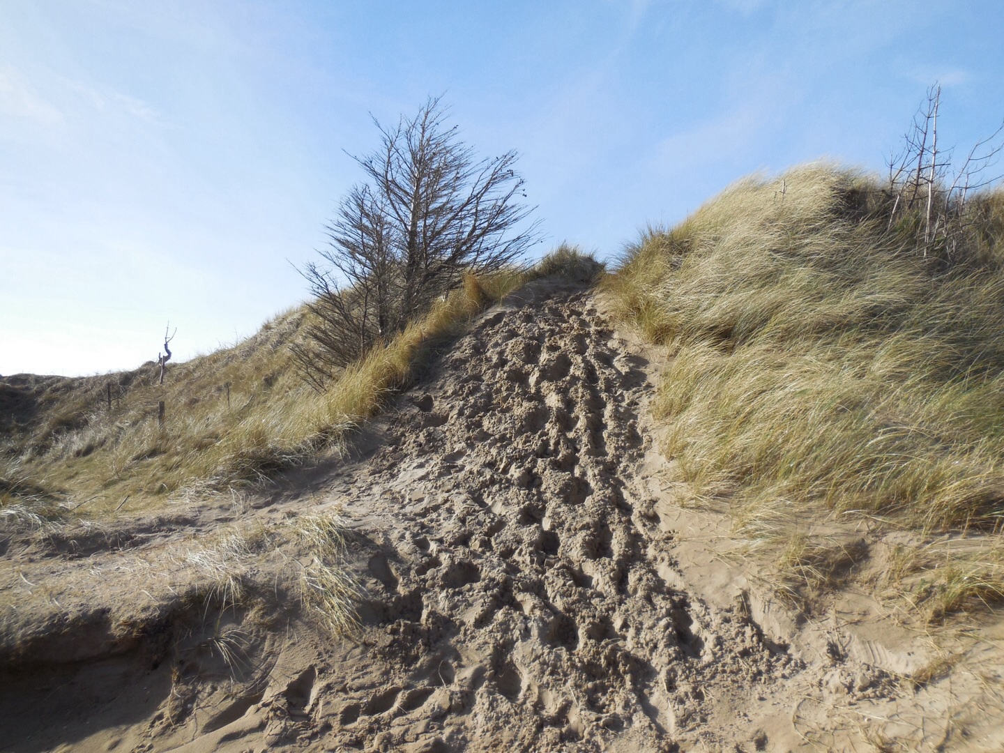 Where the road turns left we continue straight. The trees abruptly end leaving a well travelled path over one last dune.