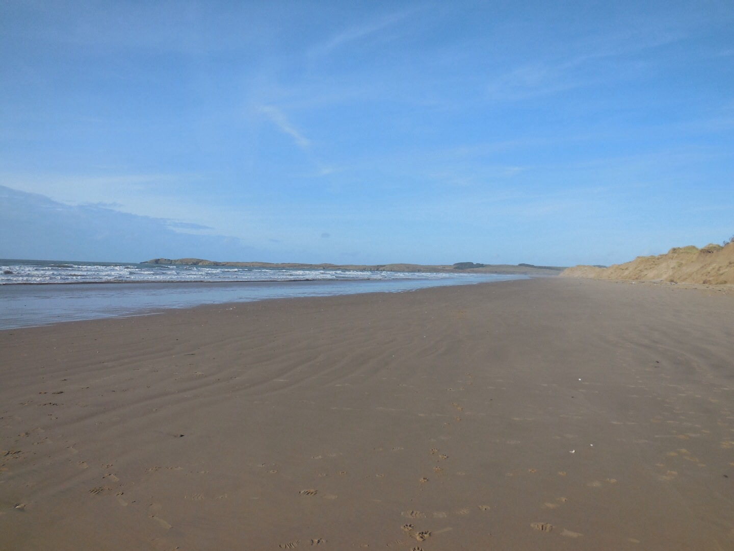 Our timing is good, the tide is low and the sand expanse broad and long. There is even surf.