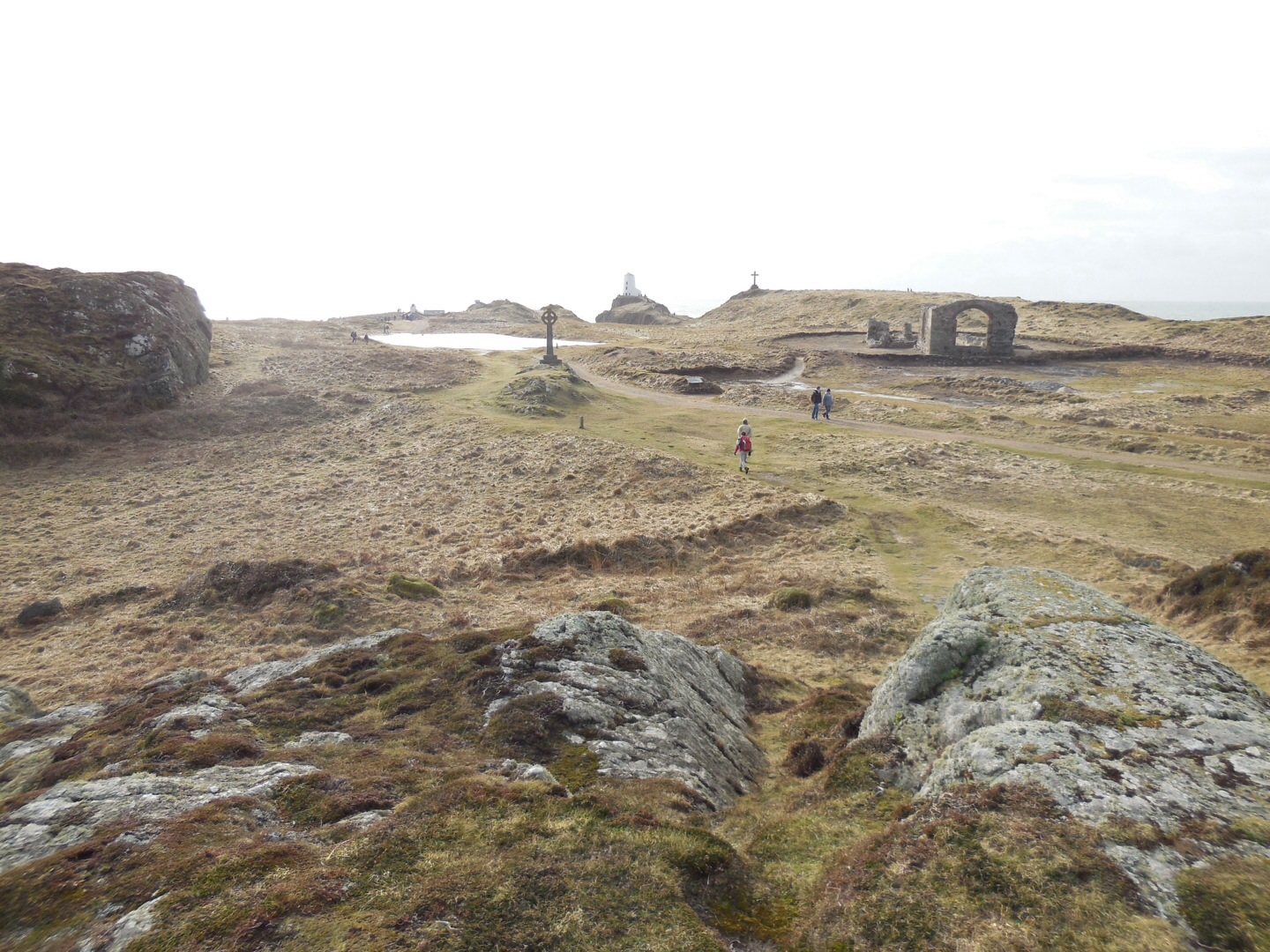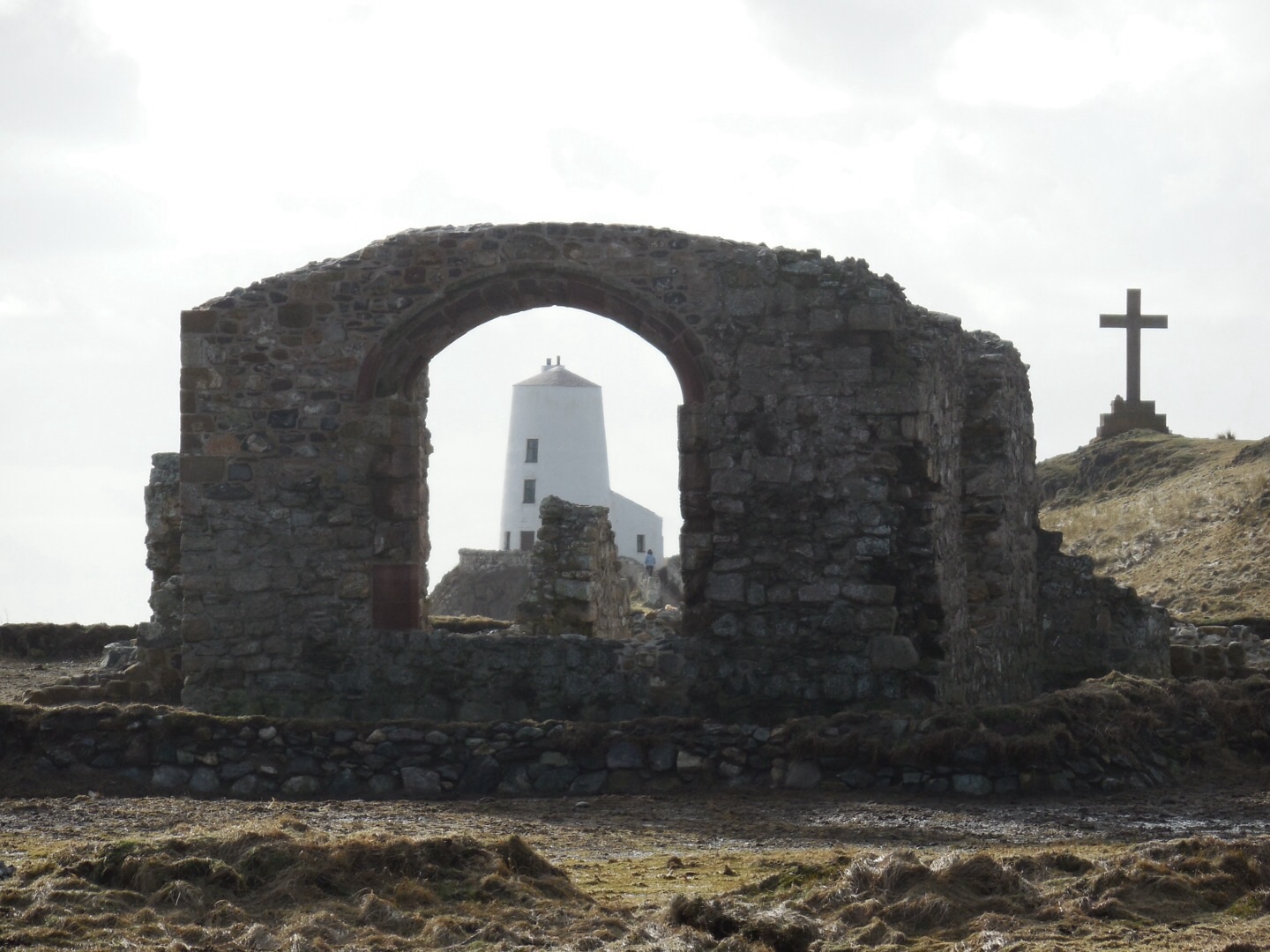 Passing the ruins I capture photos showing the Twr Mawr (large tower, one of two lighthouses that have functioned on the island) and the large Christian cross standing near the tip of the island through one of the remaining arches.