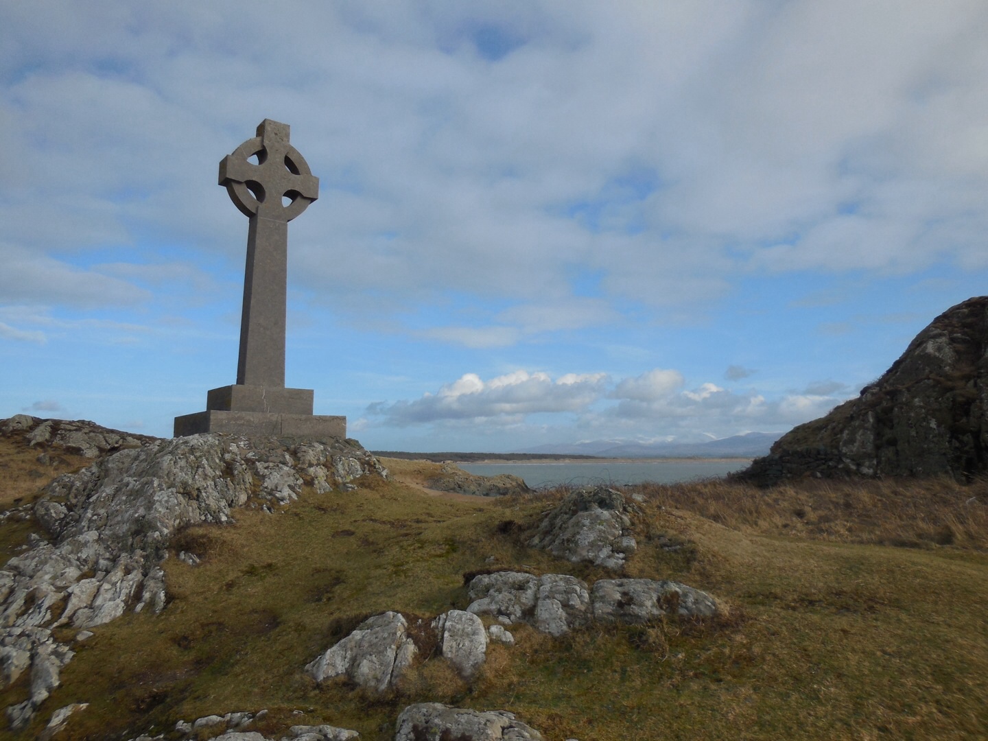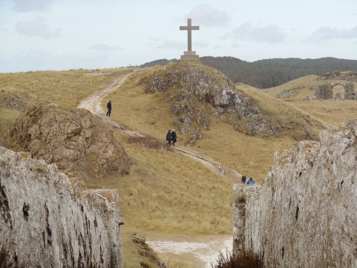 From Twr Bach we return to Twr Mawr and climb the hill to the large Christian cross at its top.