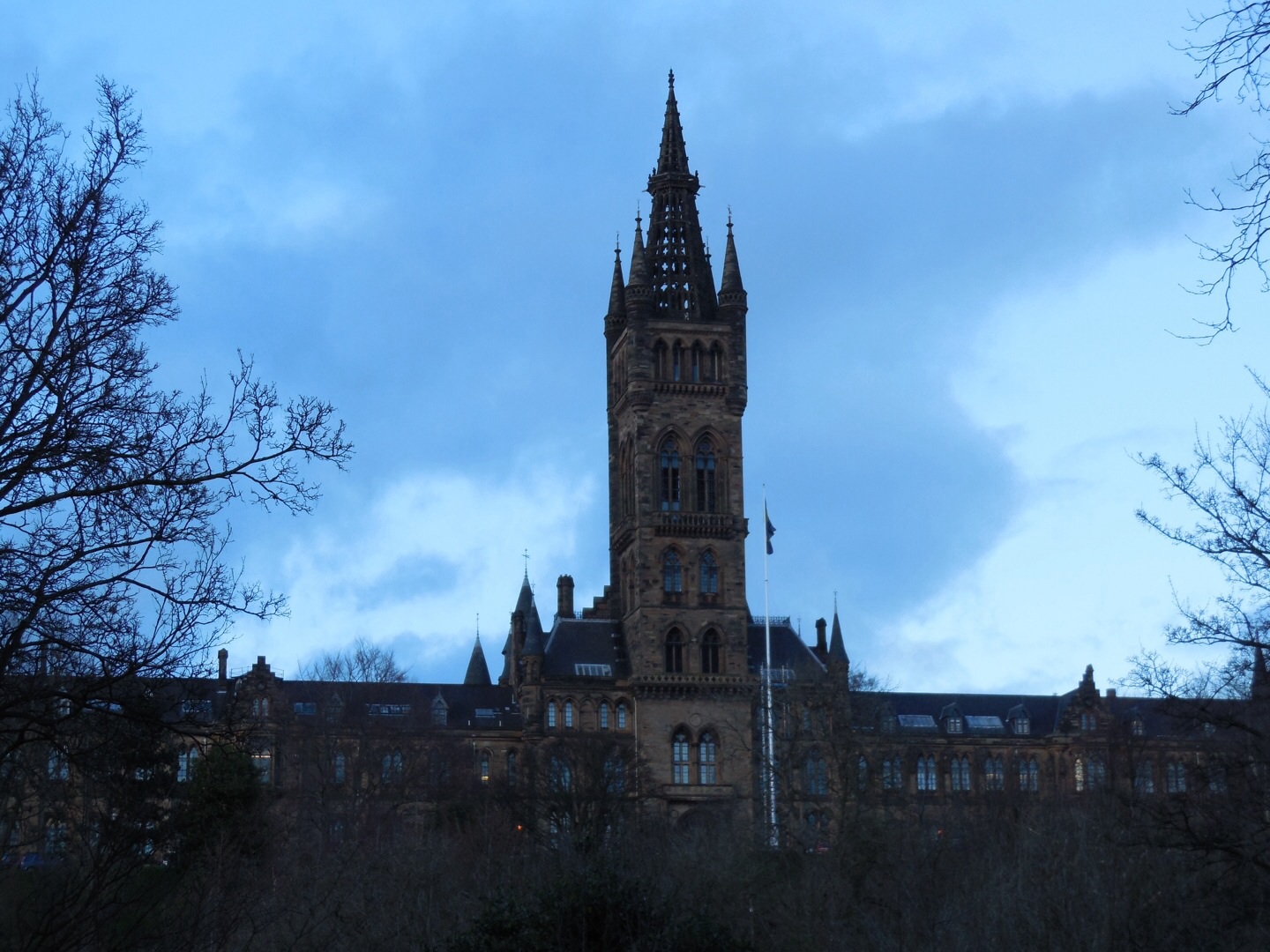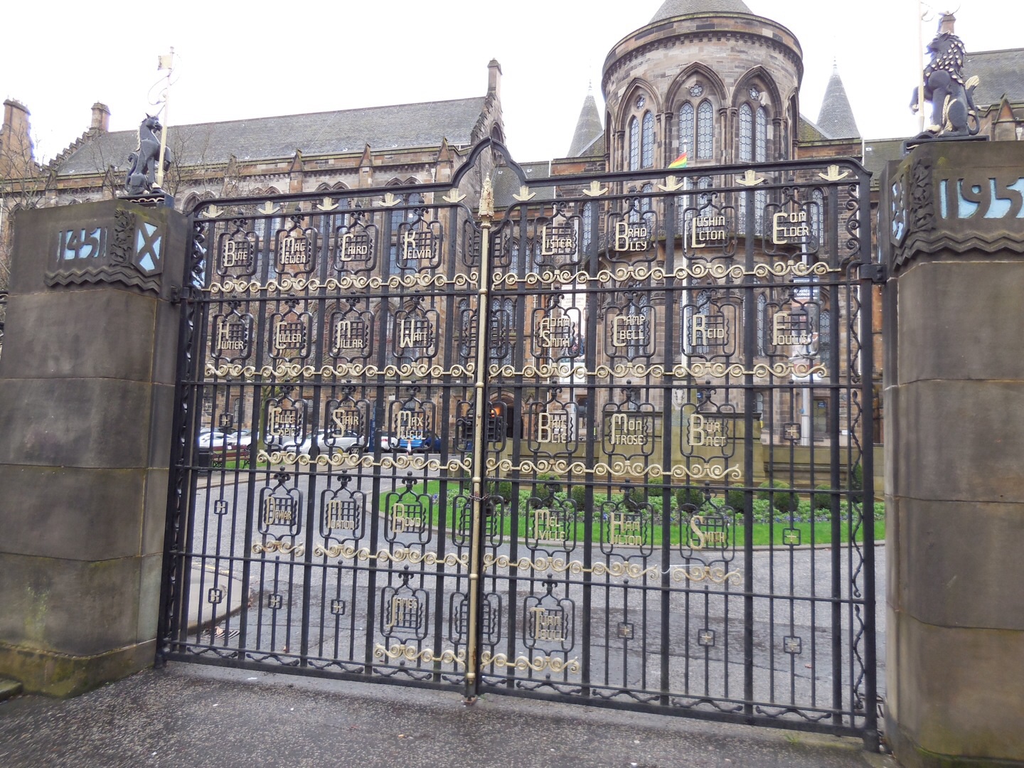 Insisting on pausing to photograph the names of the many luminary minds that have begun their journey at the gates of Glasgow University has Pam grinding her teeth for the bouncing cold ride has affected both our bladders and our need by now is dire.