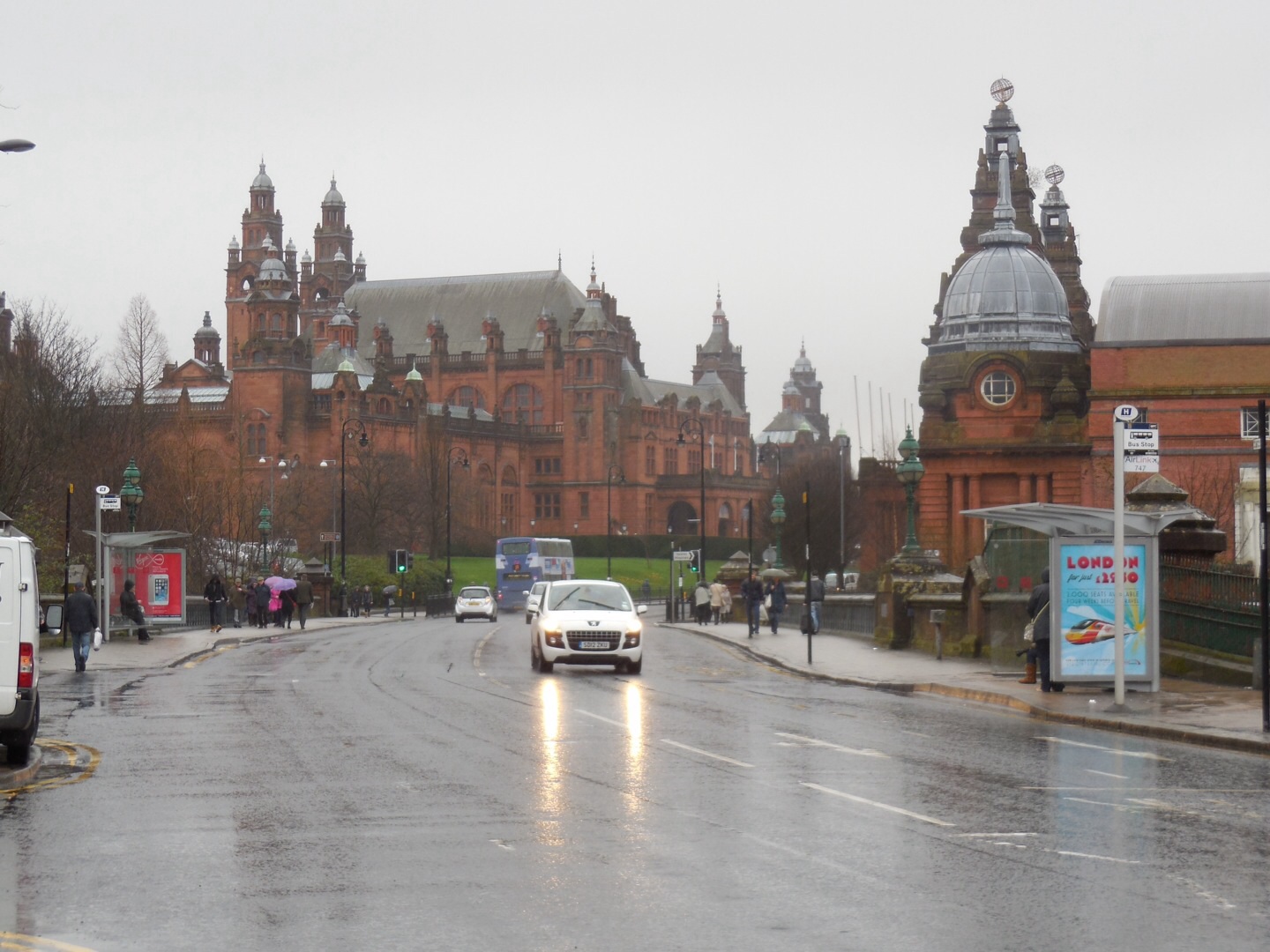 Outside under the grey skies the rain has gathered pace. My suggestion that we rejoin the tour bus to make our next planned destination Kelvingrove Art Gallery and Museum is met with scorn.