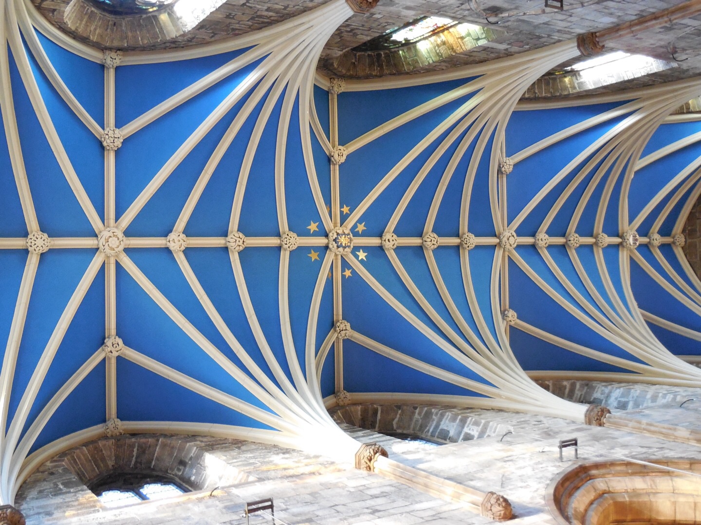 Columns rising from the floor fan out into sweeping cream white beams and a sky blue ceiling. Having paid a two pound donation on entry we are allowed to photograph the multitude of ornate stained glass windows lining the walls.