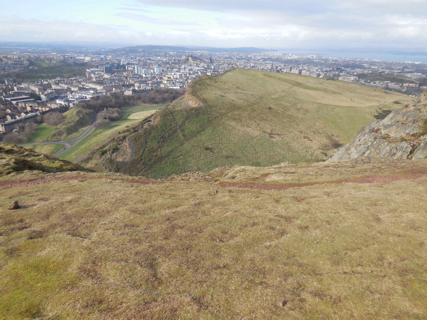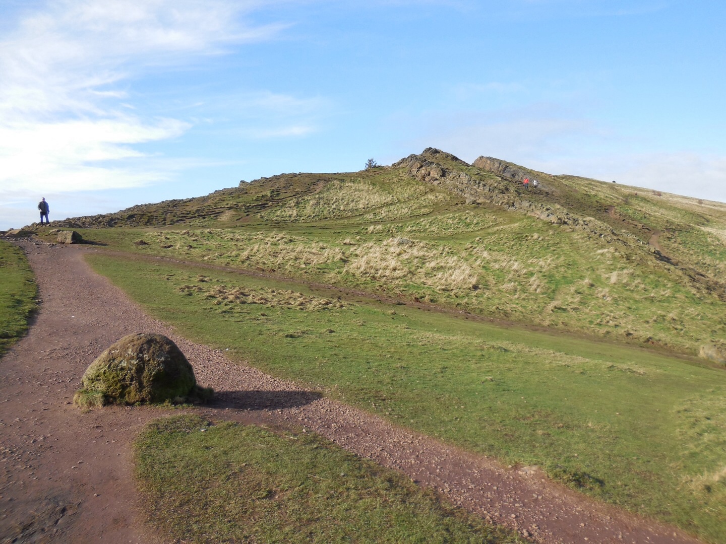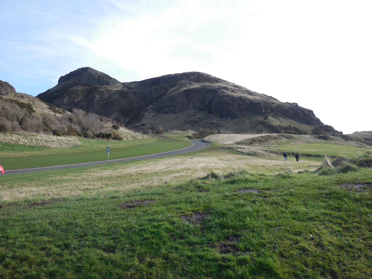 We turn right at a roundabout and head towards a sign indicating pathways before making our way over a slight crest within the valley between Arthur’s Seat and the lower grassy bluff of Salisbury Crags.