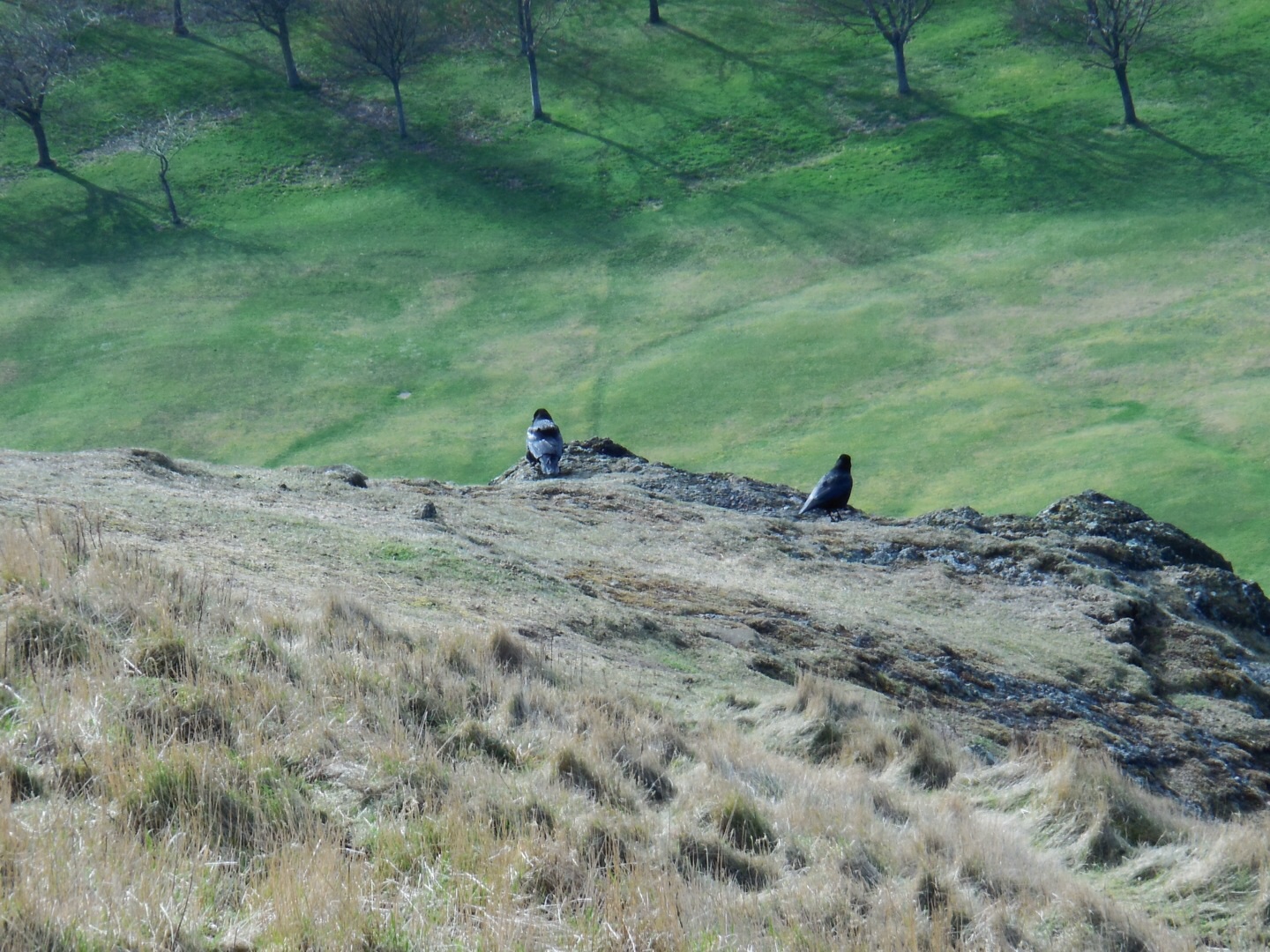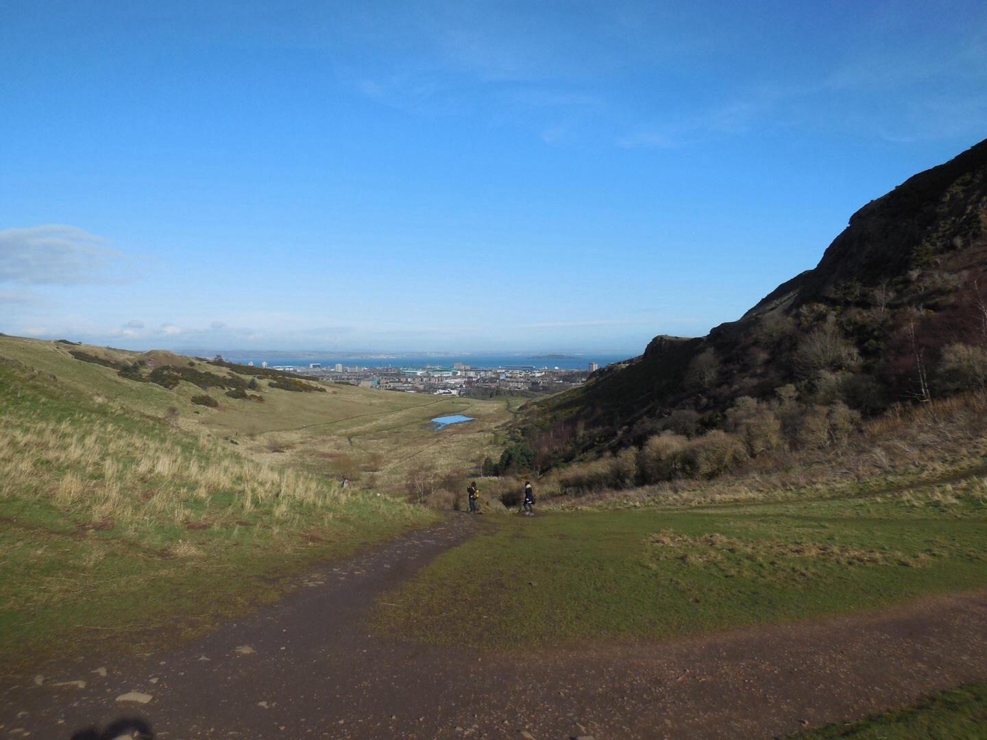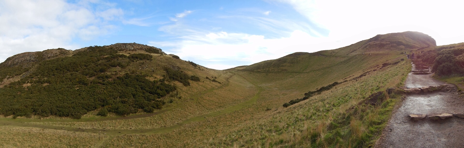 We turn right at a roundabout and head towards a sign indicating pathways before making our way over a slight crest within the valley between Arthur’s Seat and the lower grassy bluff of Salisbury Crags.