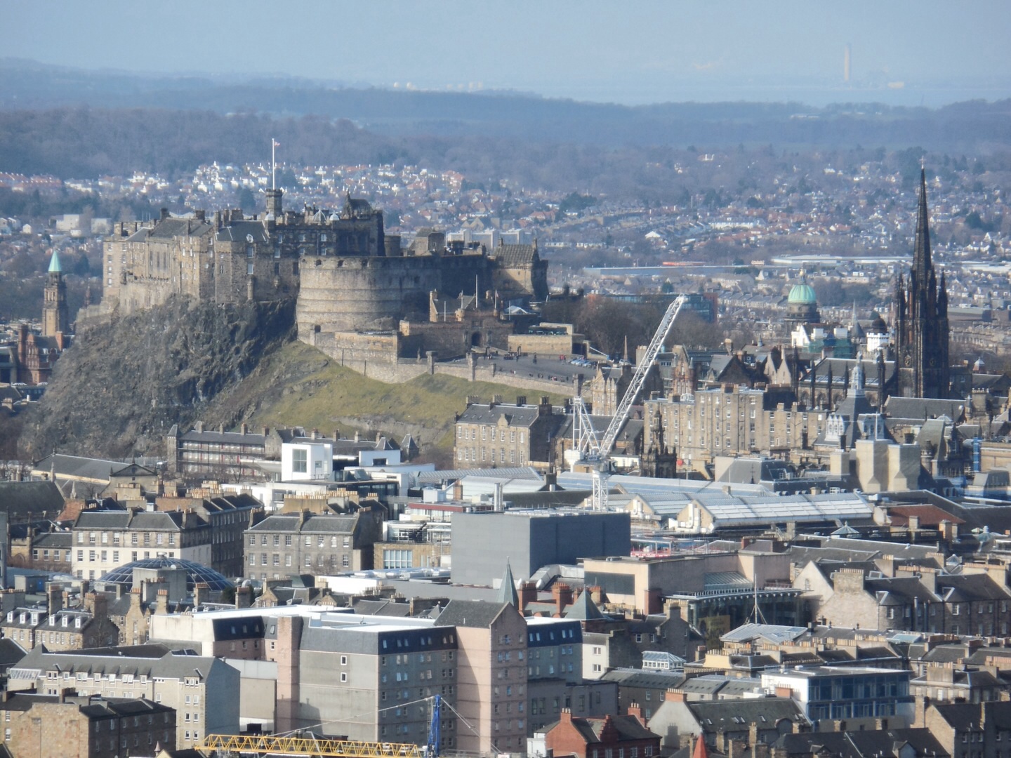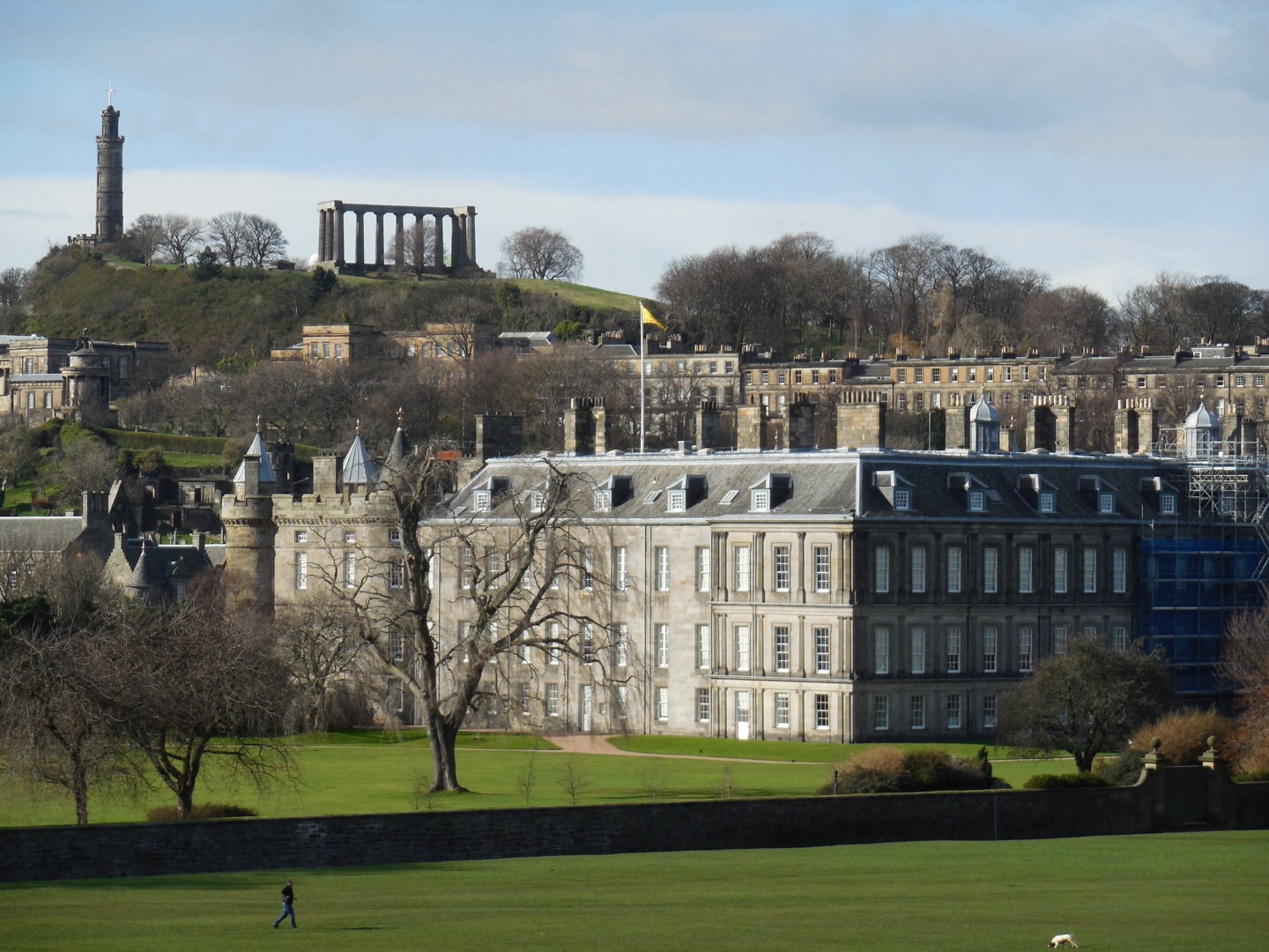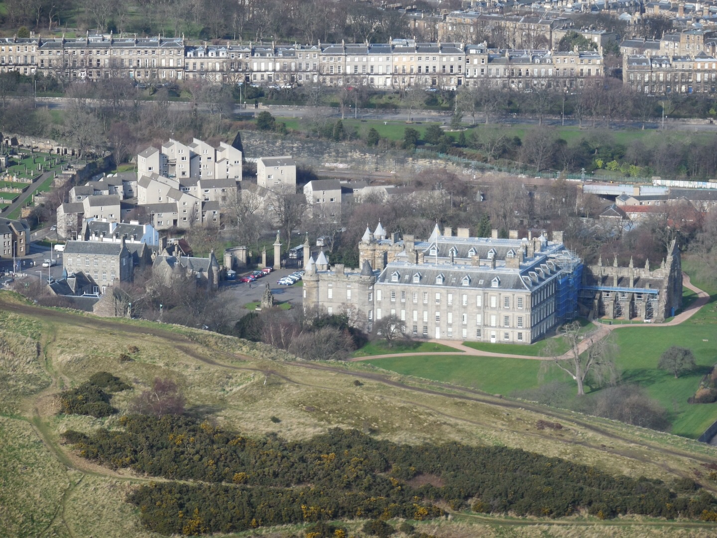 Down towards the Palace of Holyrood House and the new Scottish Parliament House beyond.