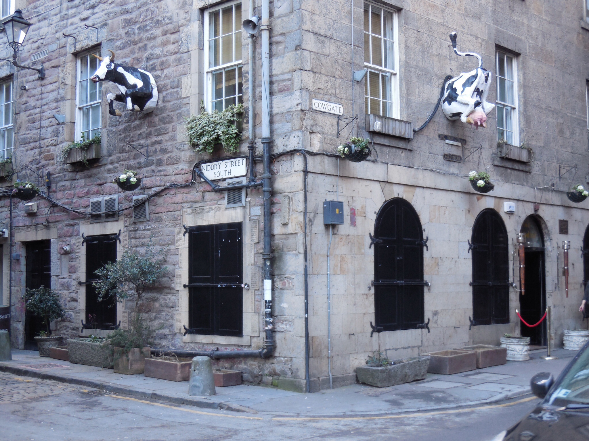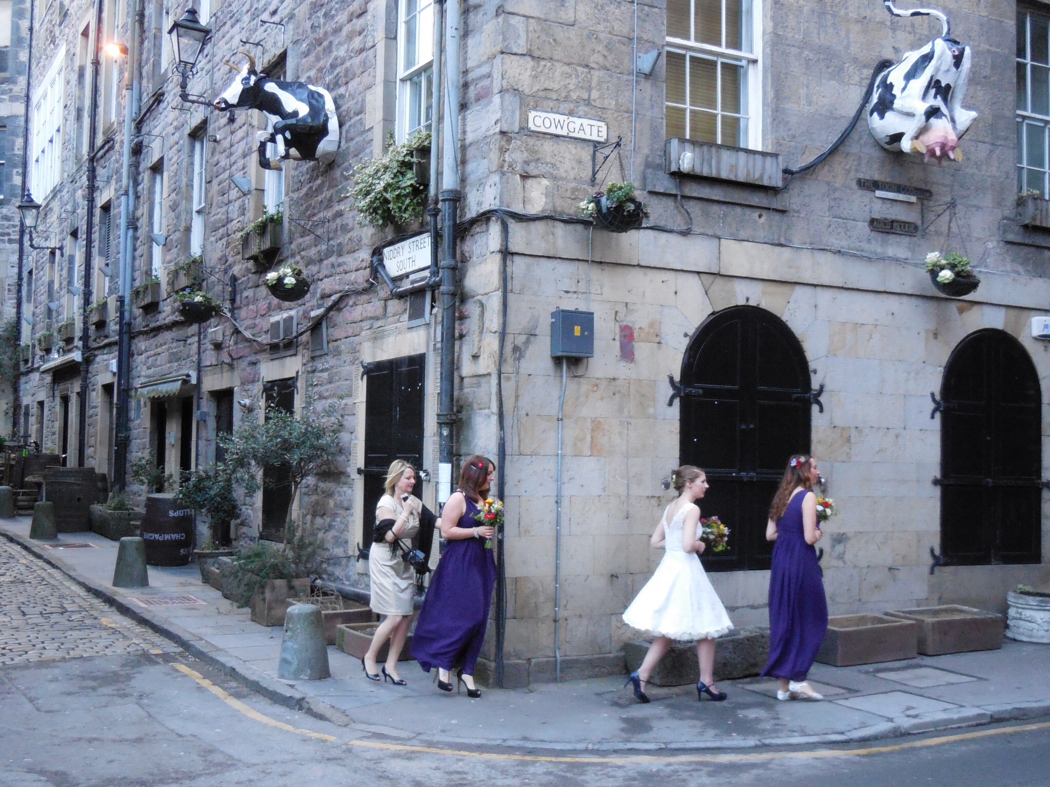 Wedding photographs are being taken in a side street beside the science defying pub in Cowgate. The bride and bridesmaids head for the bar leaving the kilt wearing grooms party standing at attention in the cobblestone street.