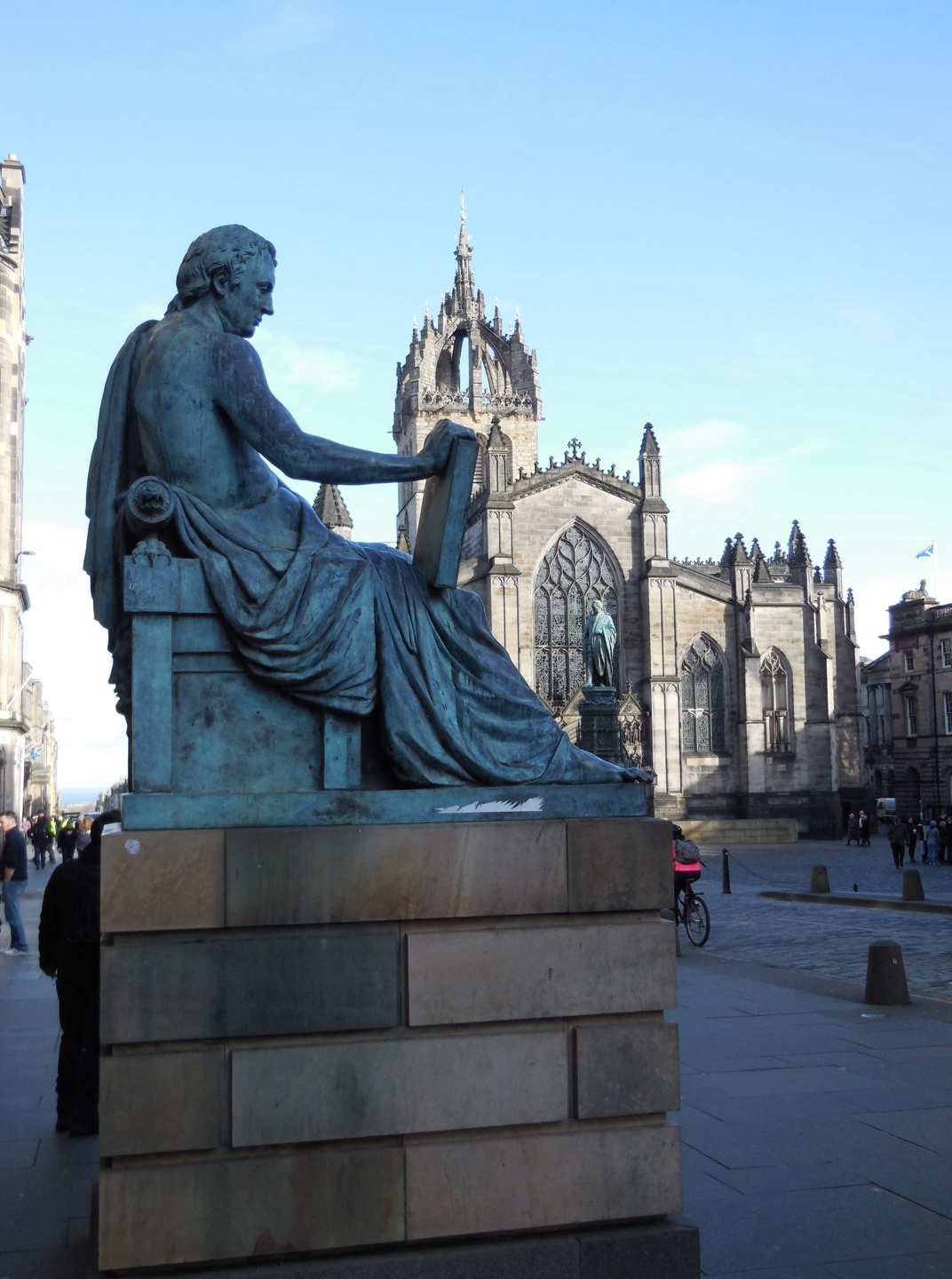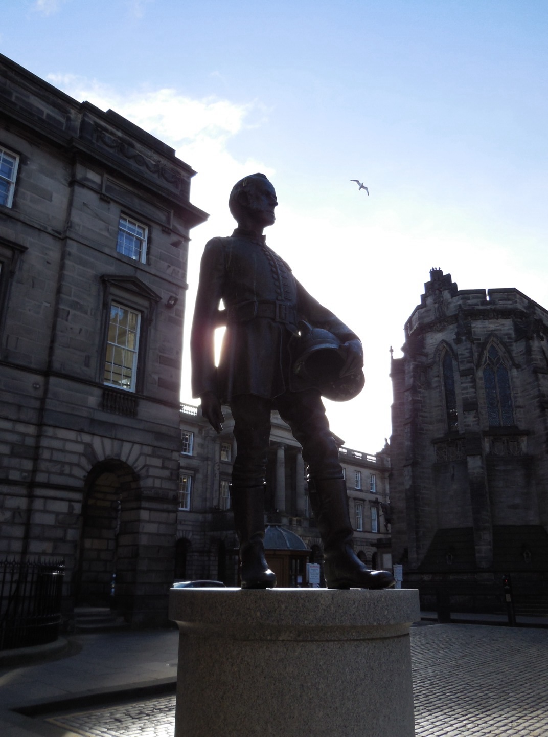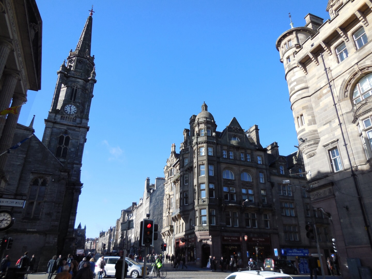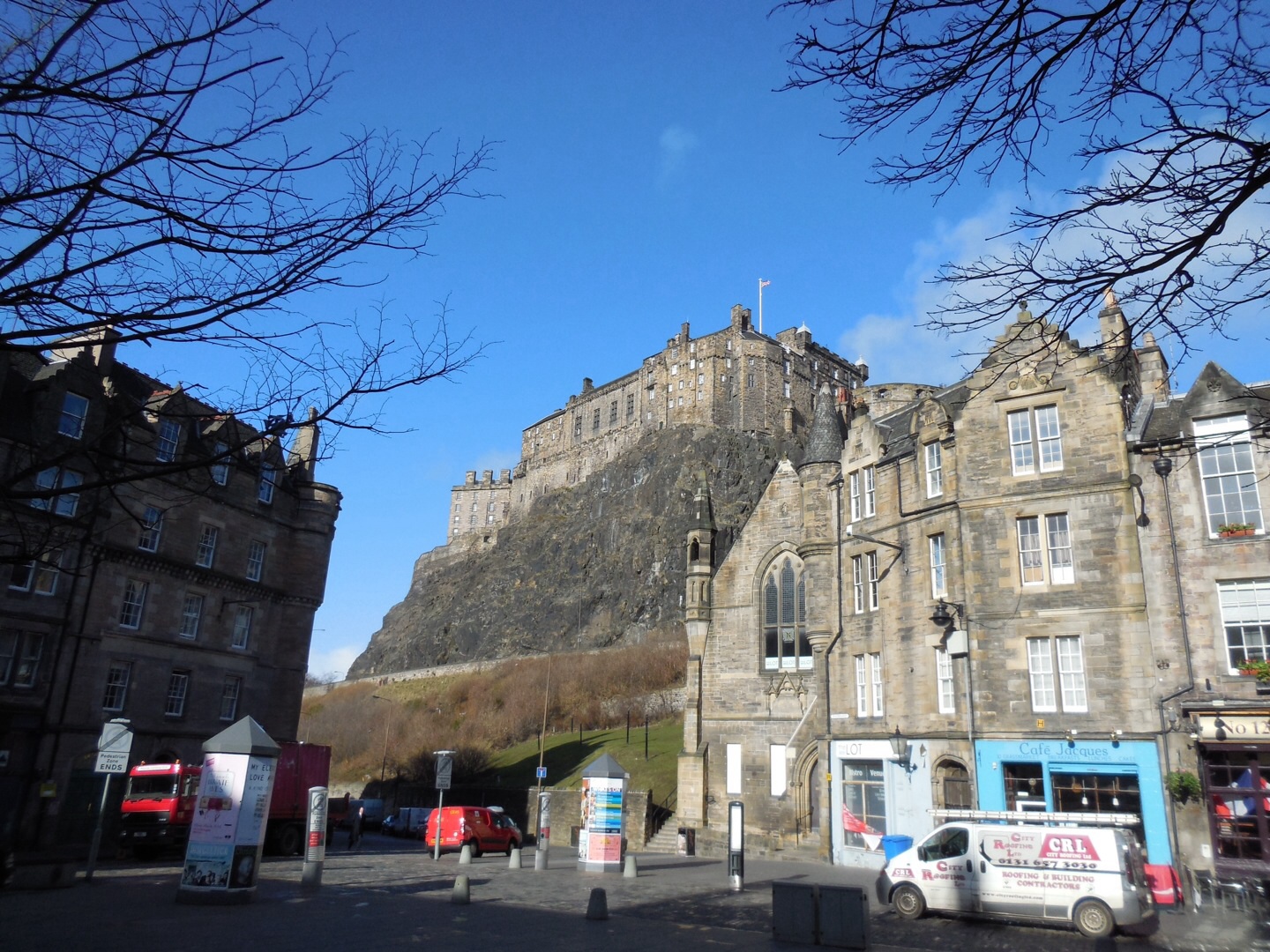 Out under blue skies once more I swiftly regain my normal good humour as we climb the winding uphill Cockburn street back to the Royal Mile where we turn right and head towards Edinburgh Castle.
