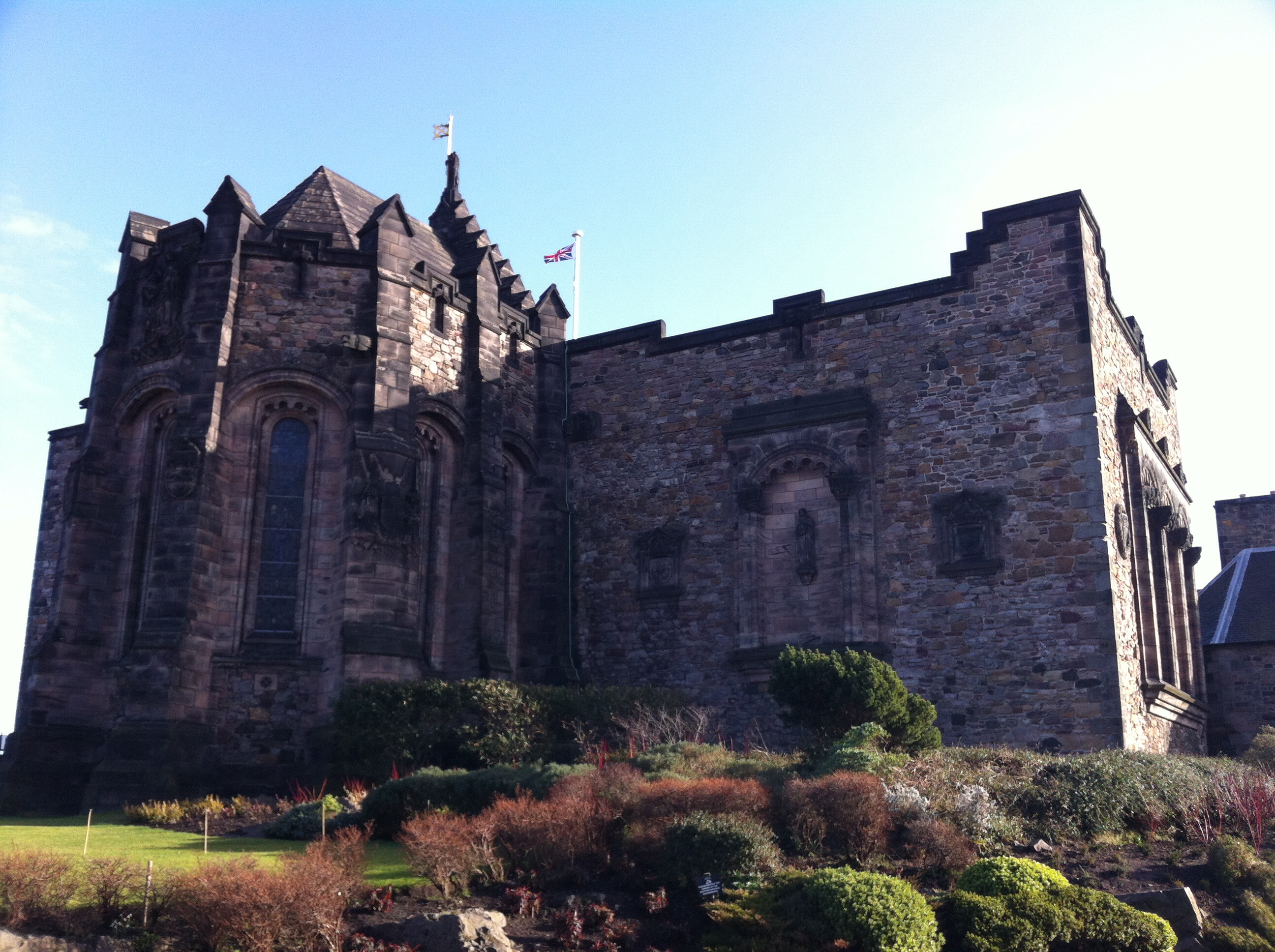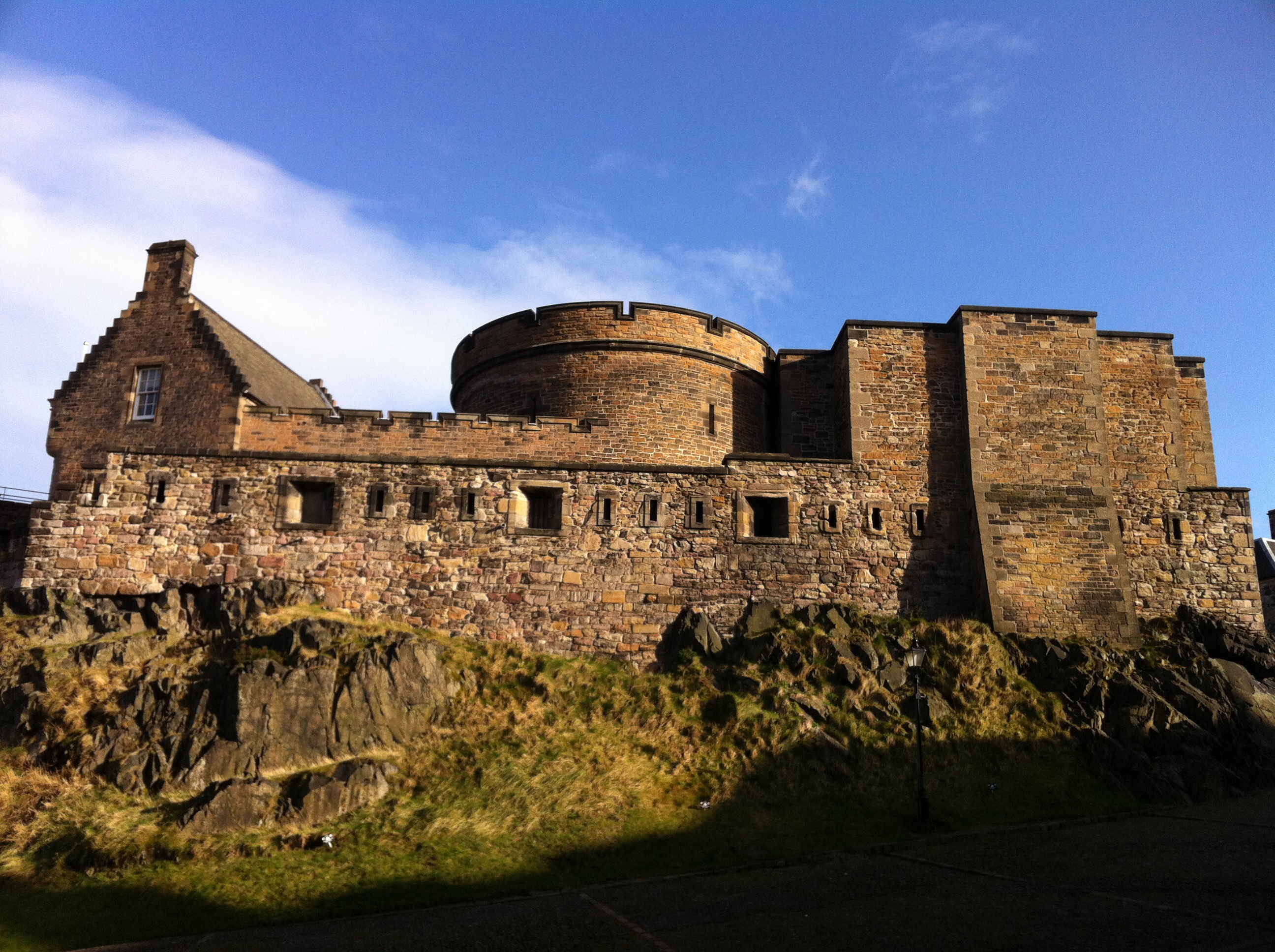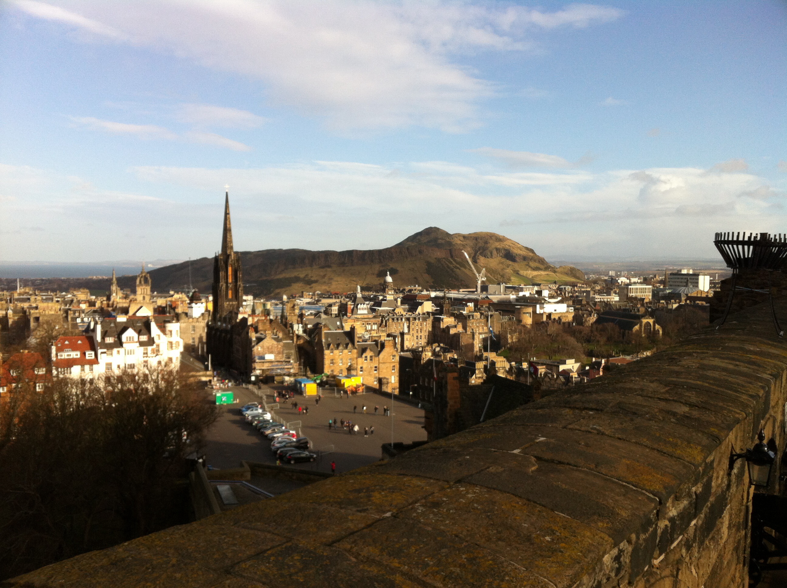 Climbing stairs to our right allows grand views of Edinburgh New Town from the walls. To our left buildings of the castle proper stand atop the ancient volcanic peak now known as Castle Rock.