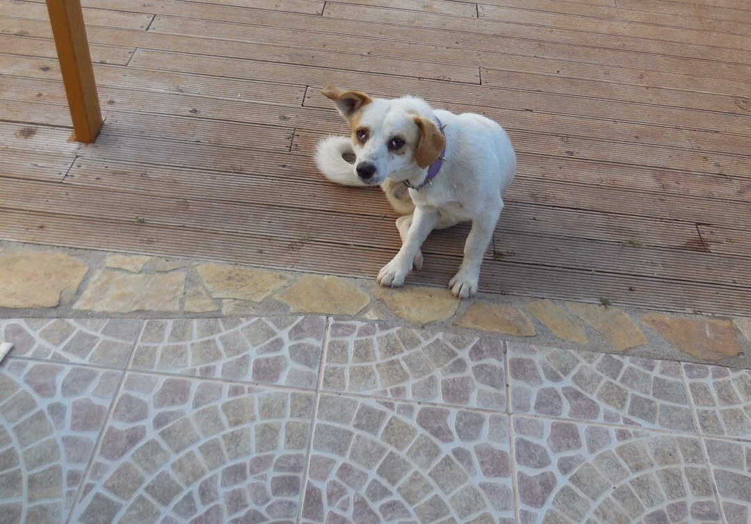 The little old white haired, red eyed, dog that has the run of the Olive Garden greets us like old friends as we creak stiff kneed down the concrete stairs towards the wooden balcony surrounding the dining area.