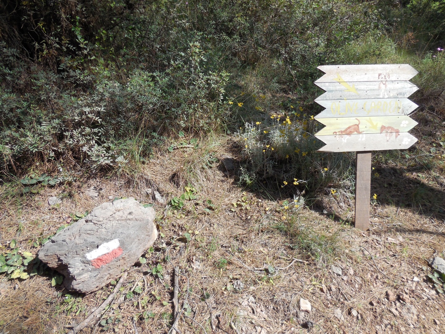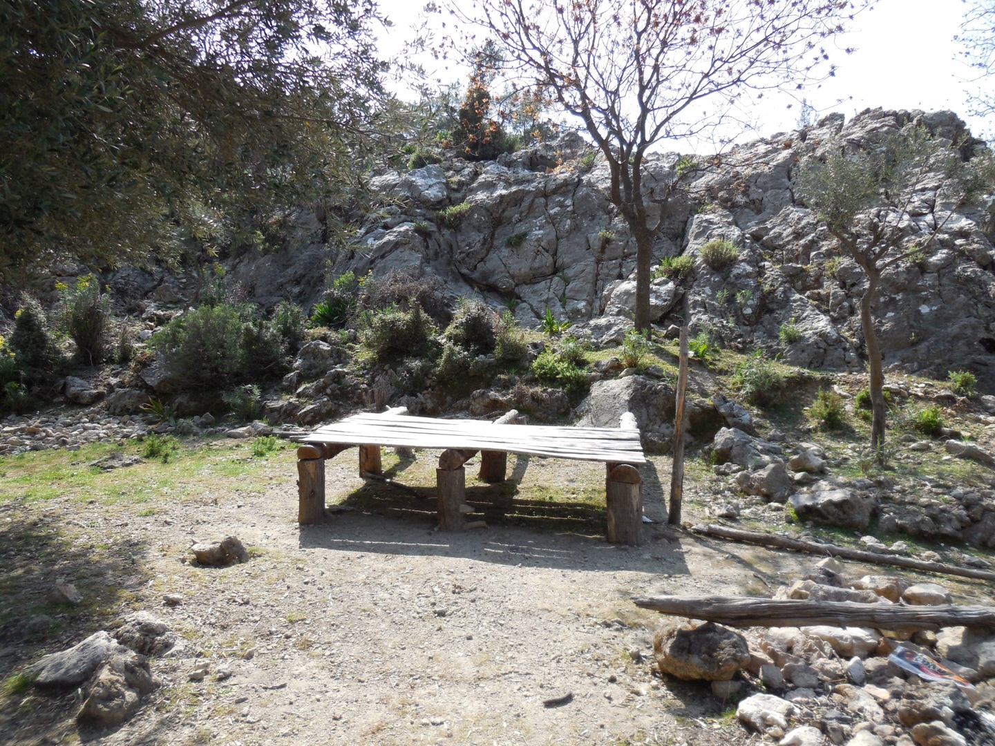 Spying some of the agricultural stone walls that so entrance me up ahead I cry out ‘civilization at last’. An olive grove with some lovely flat camping spots awaits us and we find a spot in the shade of an olive tree nearby a wooden platform to sit and eat lunch.