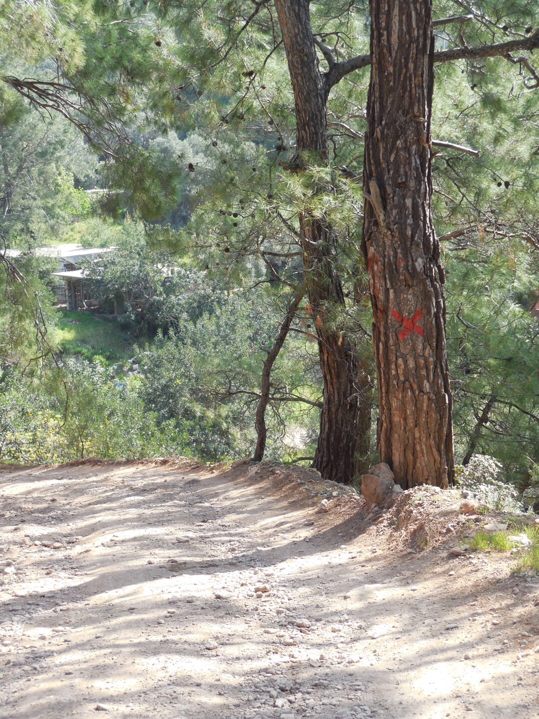 Red crosses painted on trees tell us that once again roads shall not suffice where rougher trails beckon.