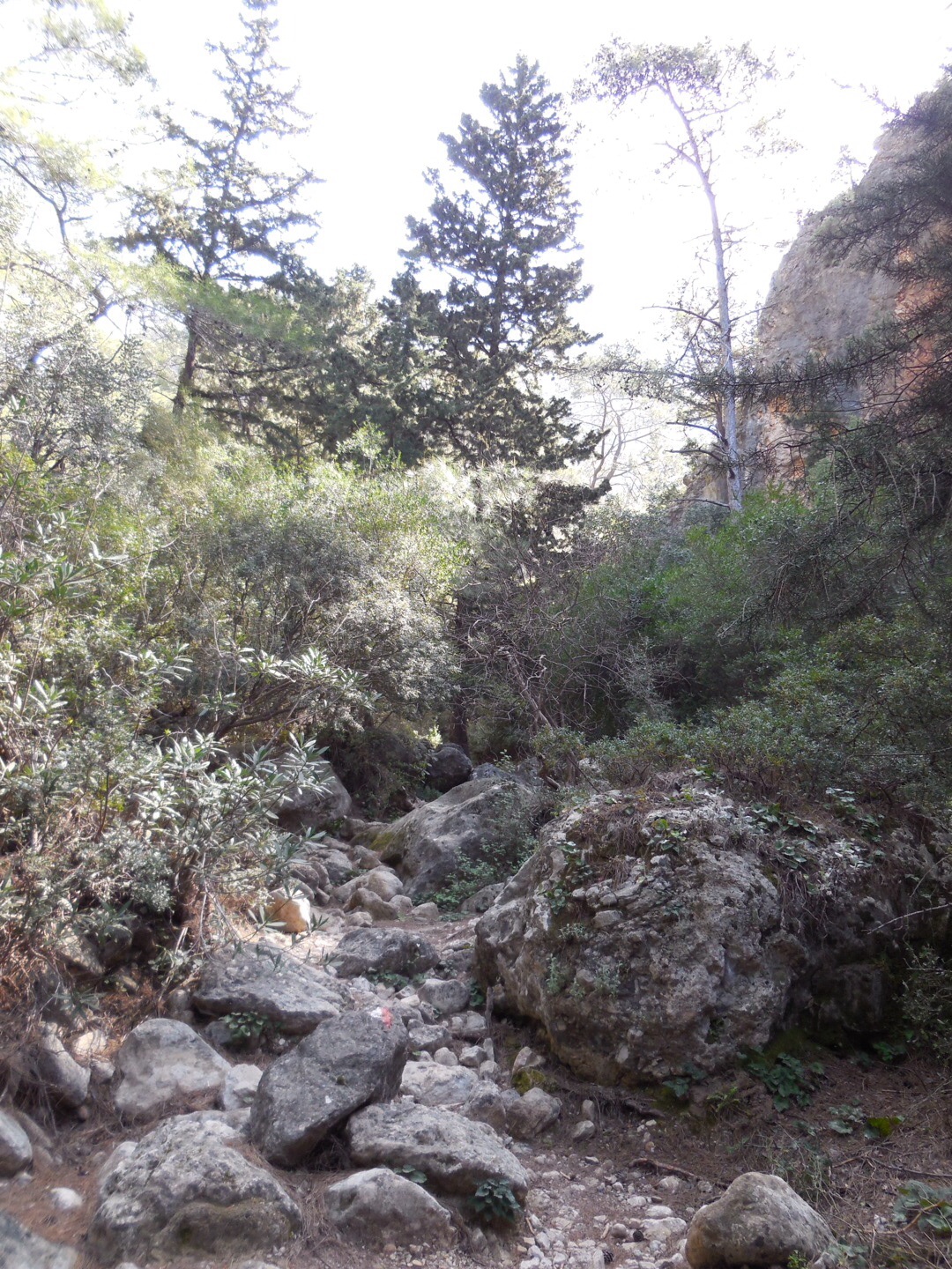 Immediately rough, steep and rocky. We pass over screes fallen from the slopes towering each side above the water gully that the path follows.