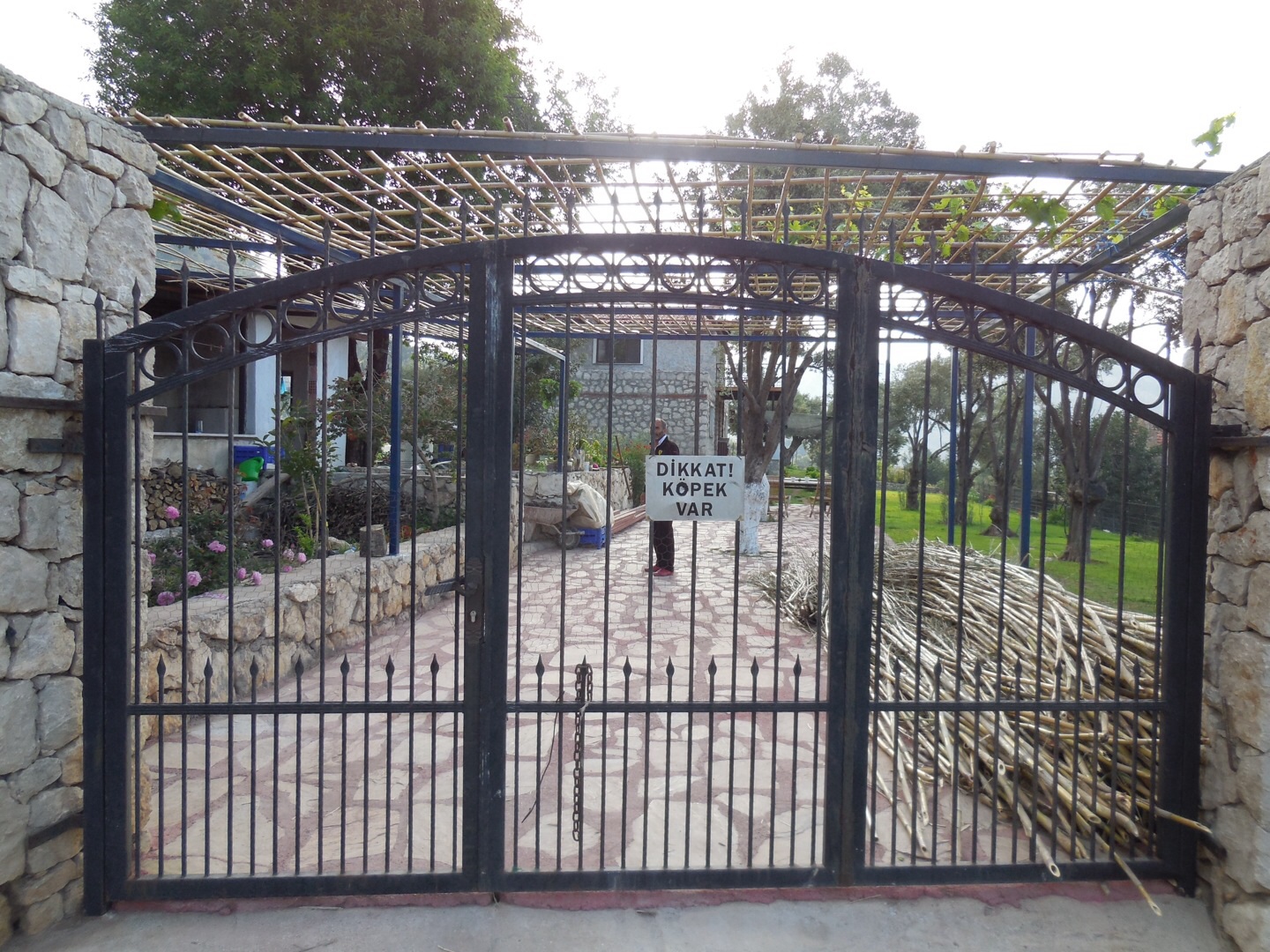 Saying hello to the man inside the barred gates we move on, we have read about a pension ‘Patara Lodge’ in this area that ‘hovers above the sea on cliffs’ and are keen to locate it.