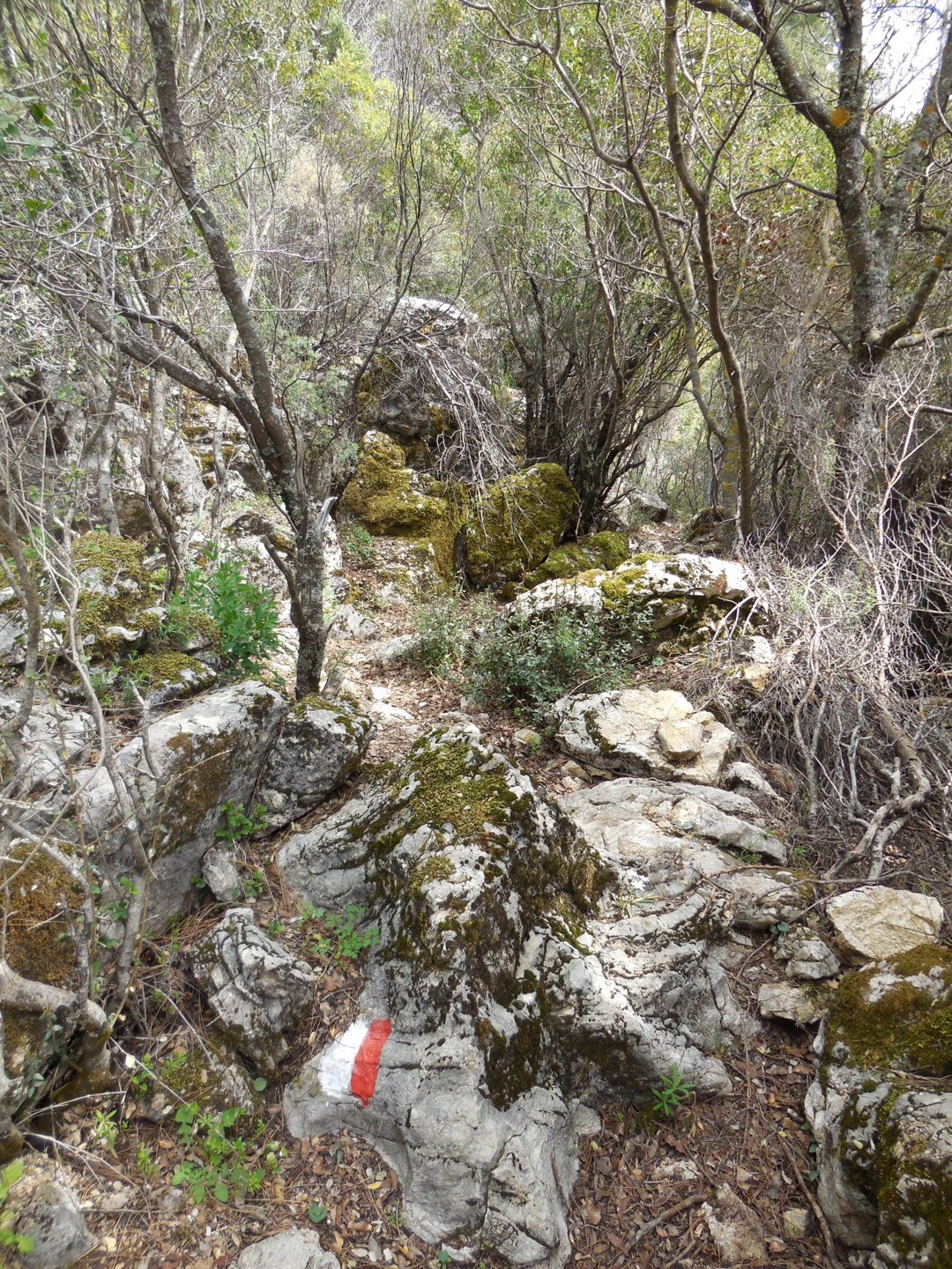 To my rural eye this ‘track’ following a major drainage point between hills would be a site of flash flooding in heavy rains and I am cursing the stupidity of having this as part of a marked walk when our passage is blocked by trees fallen by the last torrents that would have surged down here.