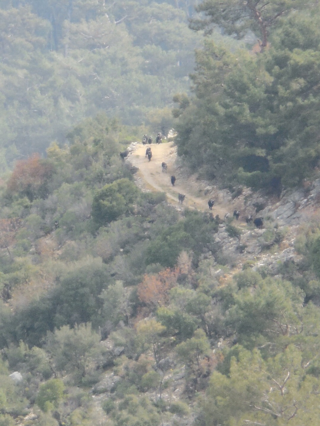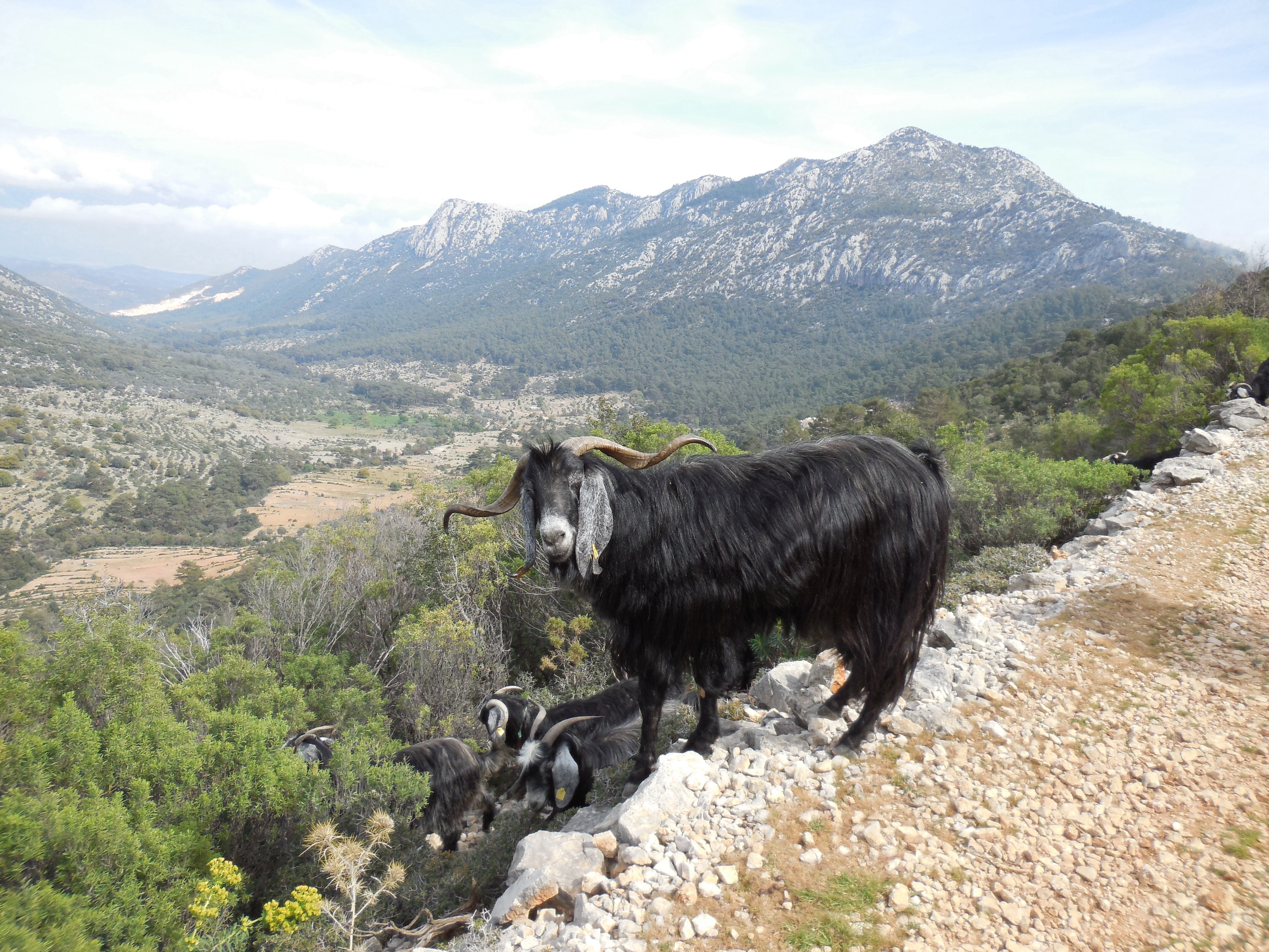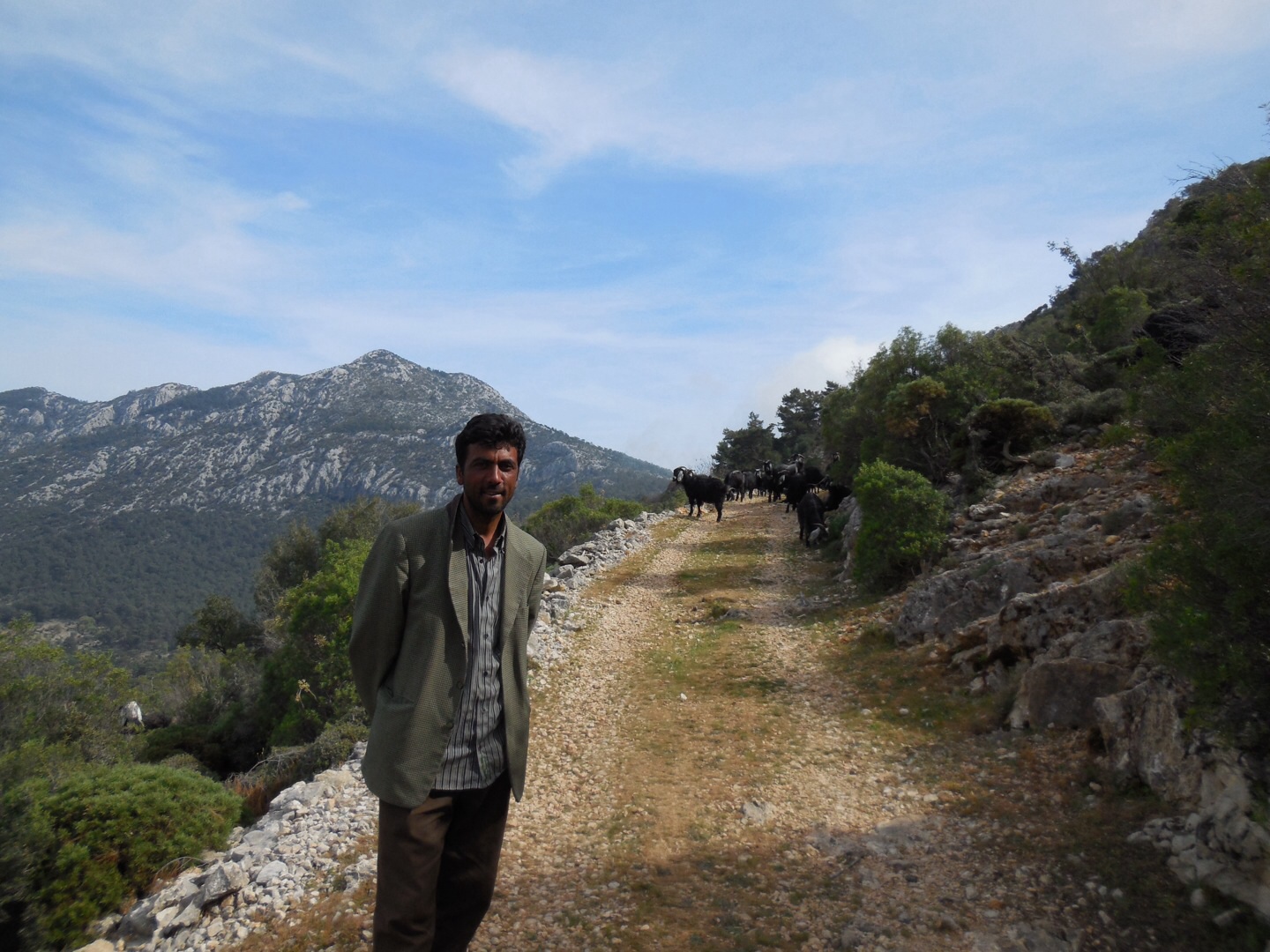 The way veers up this gravel diversion to where the goatherd is calling his flock together from the hillsides above and below. As we pass the herd of agile cloven hoofed mountain dwellers part disinterested in the two sweaty tired tourists who are trying to coax them to ‘look at the camera’.