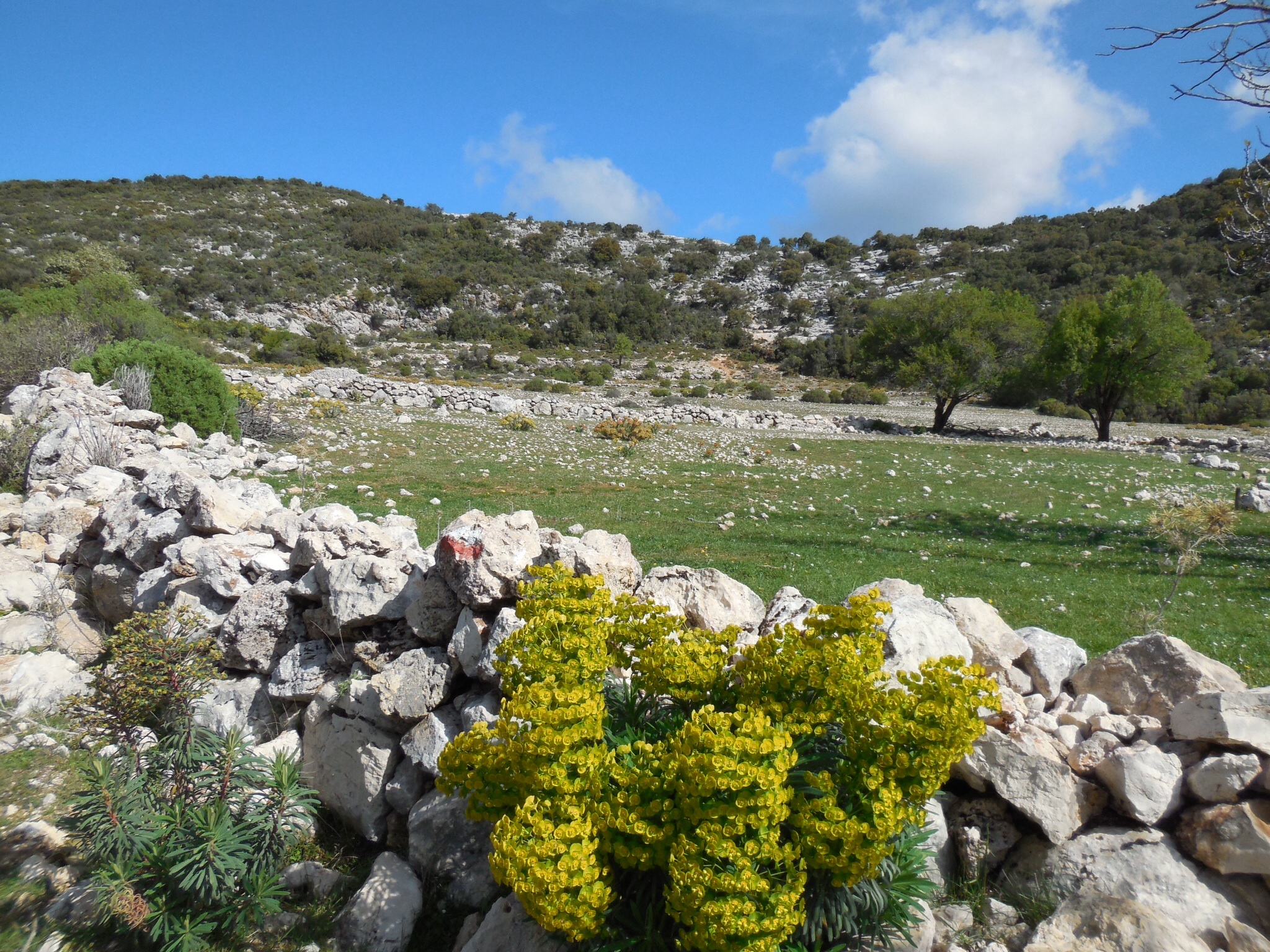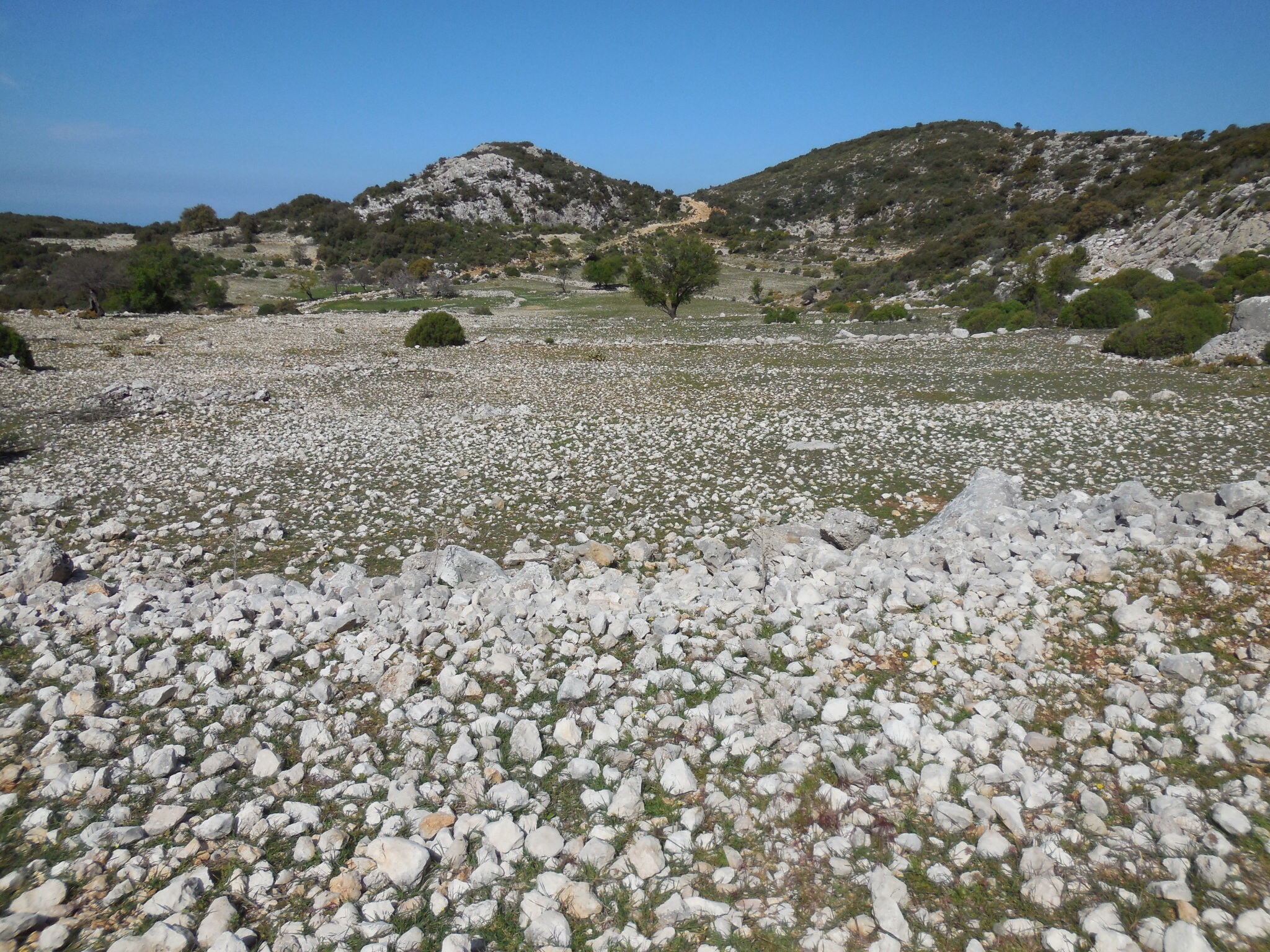 The dry watercourse we follow spreads out between the grey topped ridges in a series of stone wall terraced flat agricultural areas that are themselves covered in white stones. Our path has us clambering down fallen sections of these walls which must be negotiated with care as the stones are neither embedded in soil or large enough to have sufficient mass to counterbalance errant force vectors of our descending steps.