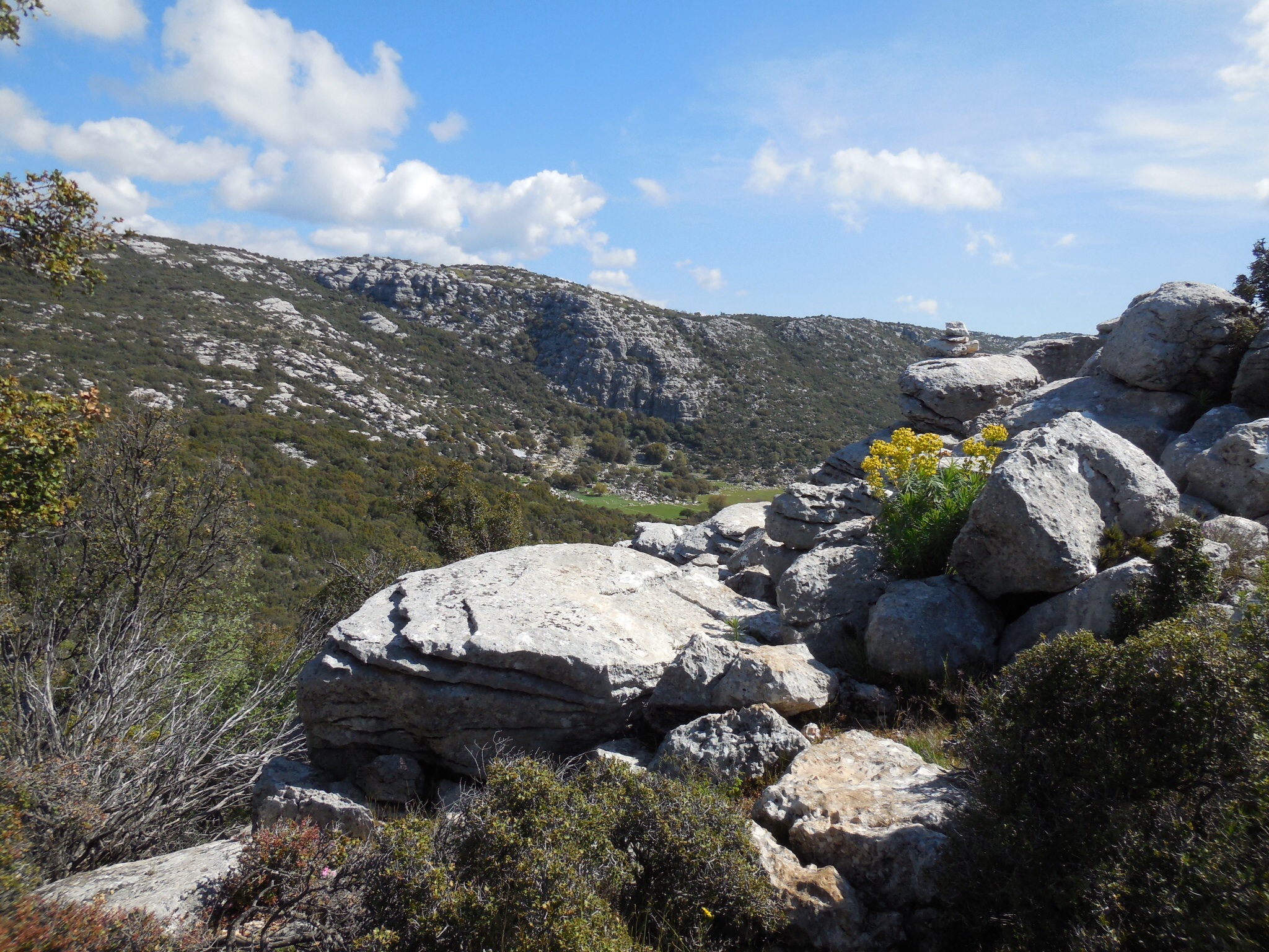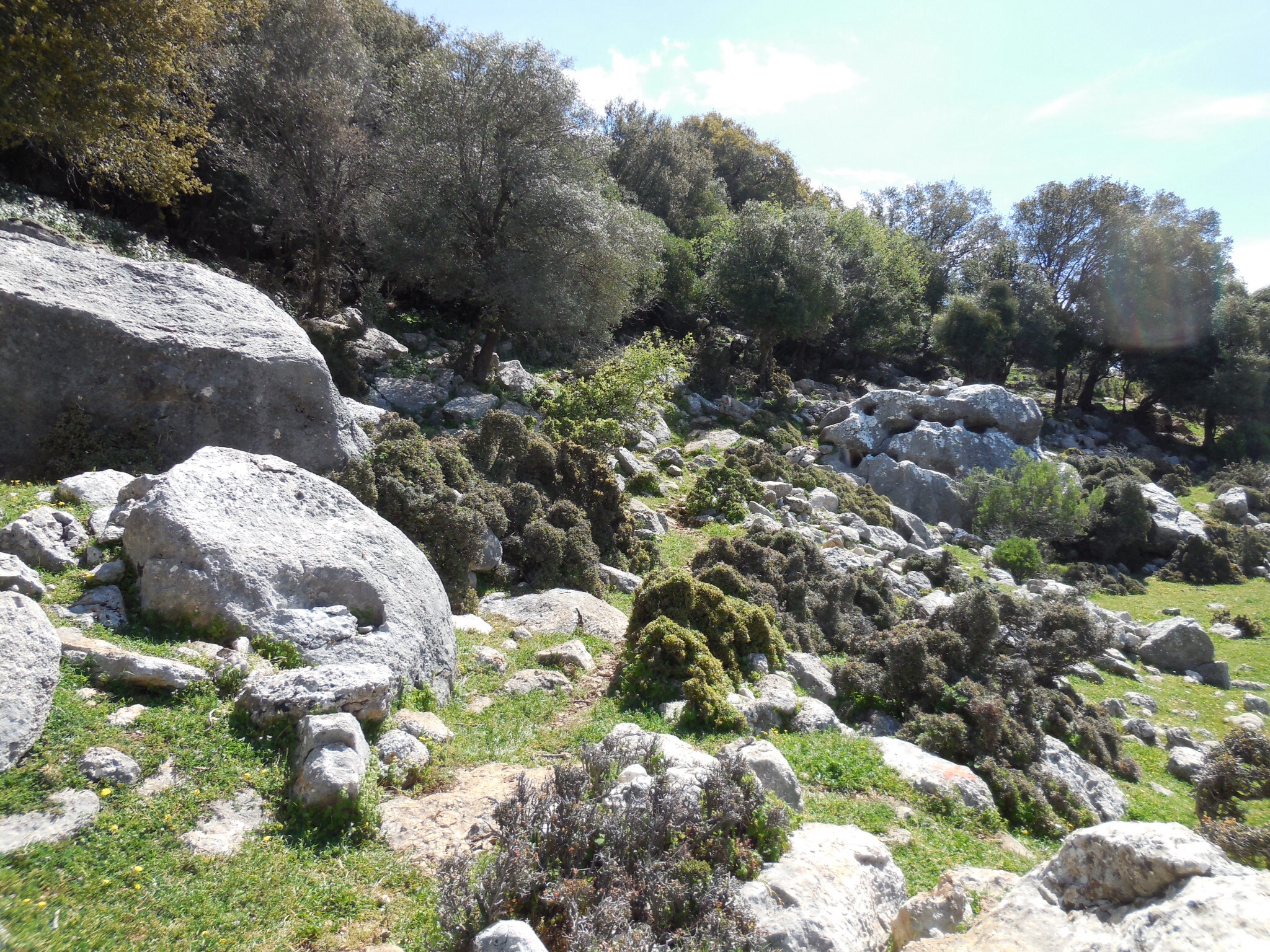 Back on the goat tracks we have grown accustomed to we plunge on between shrubs and thorn bushes until we come to a rocky precipice where a Camino style rock cairn atop piled boulders alerts us, new conditions ahead.
