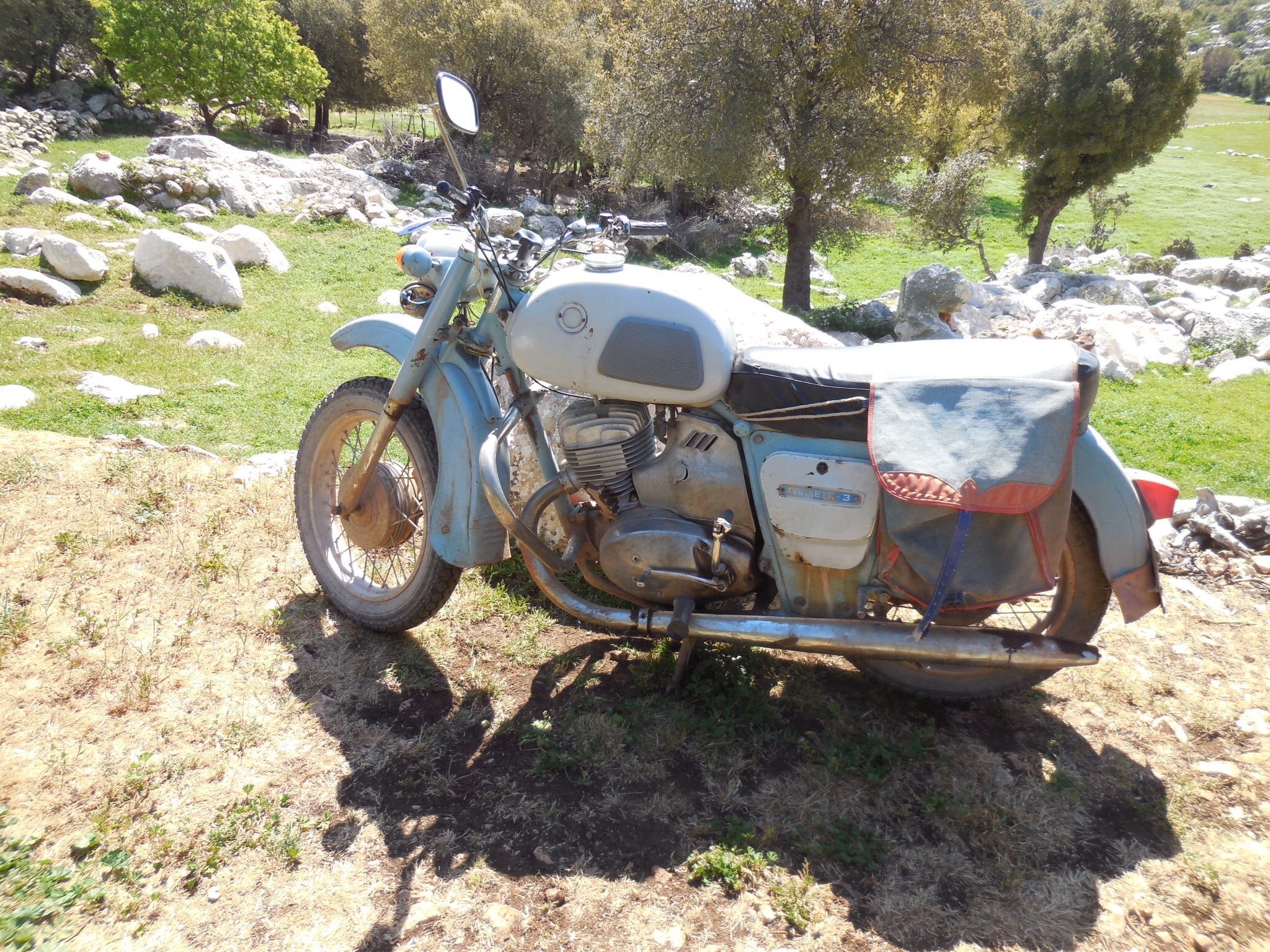 This road ends abruptly where an old motorcycle is parked in front of some fenced goat enclosures. I am sure this is the same motorcycle that Gerard had advised me to get a shot of parked outside the shop back in Bezirgan where I was just too tired to make the effort, so I take the opportunity now.
