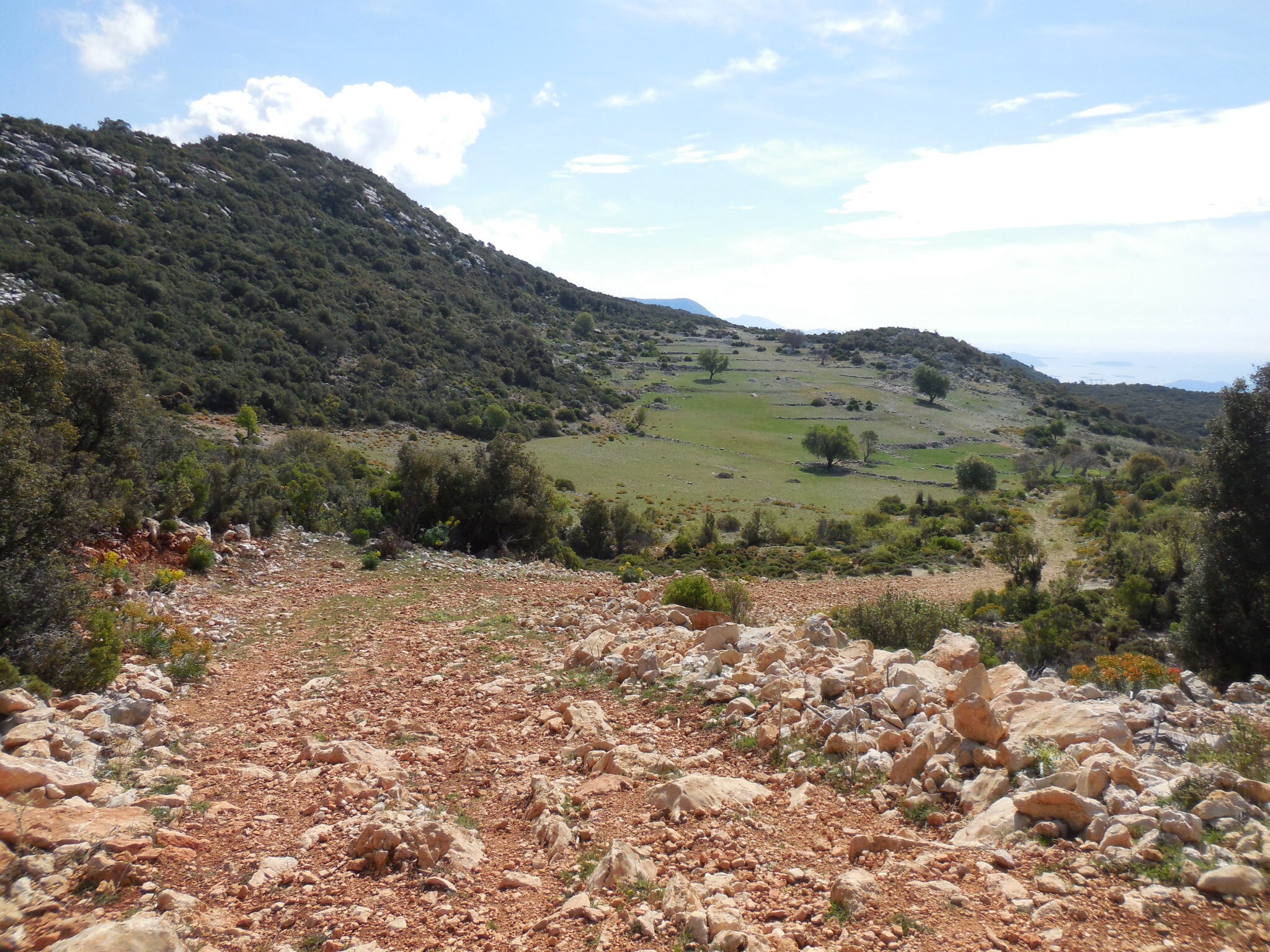 Just beyond the well the Lycian Way turns left and takes us on a red dirt track through the field of stones. Looking back whence we came just before we enter the shrubs once more the amassed hue of the stones’ white/grey bleaches out the green grass leaving a view similar to the aftermath of a huge hail storm.